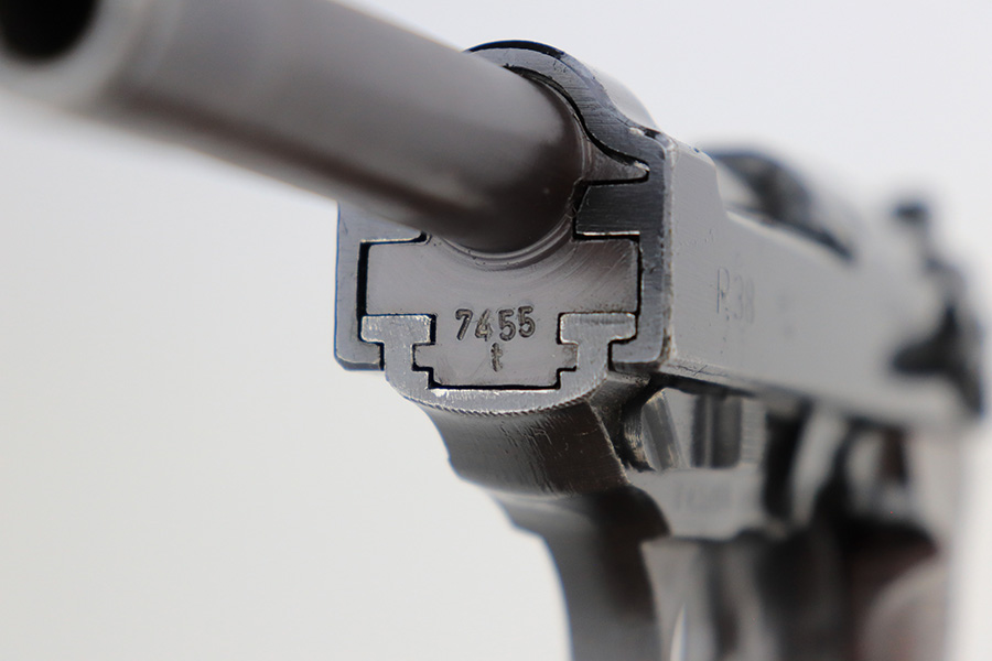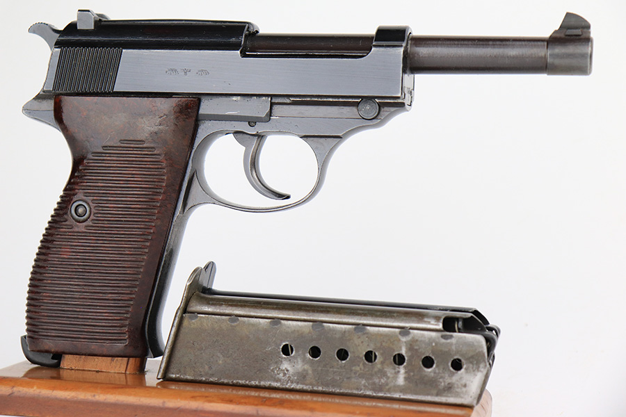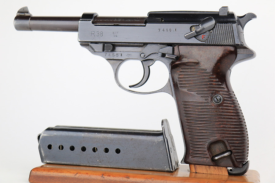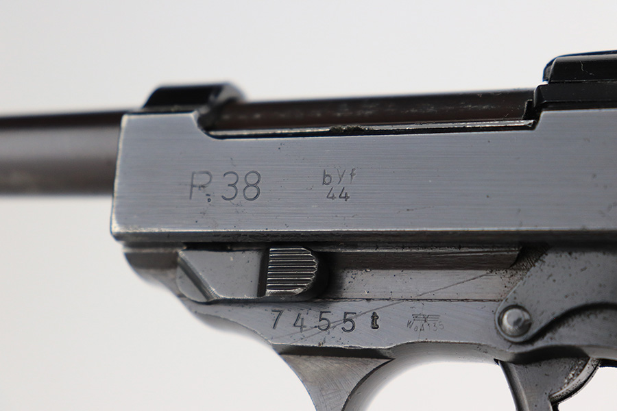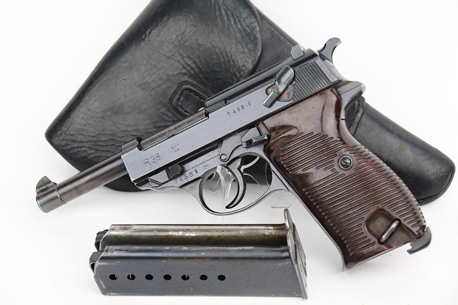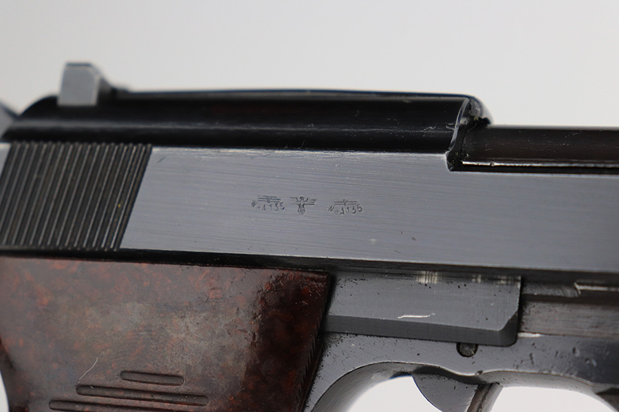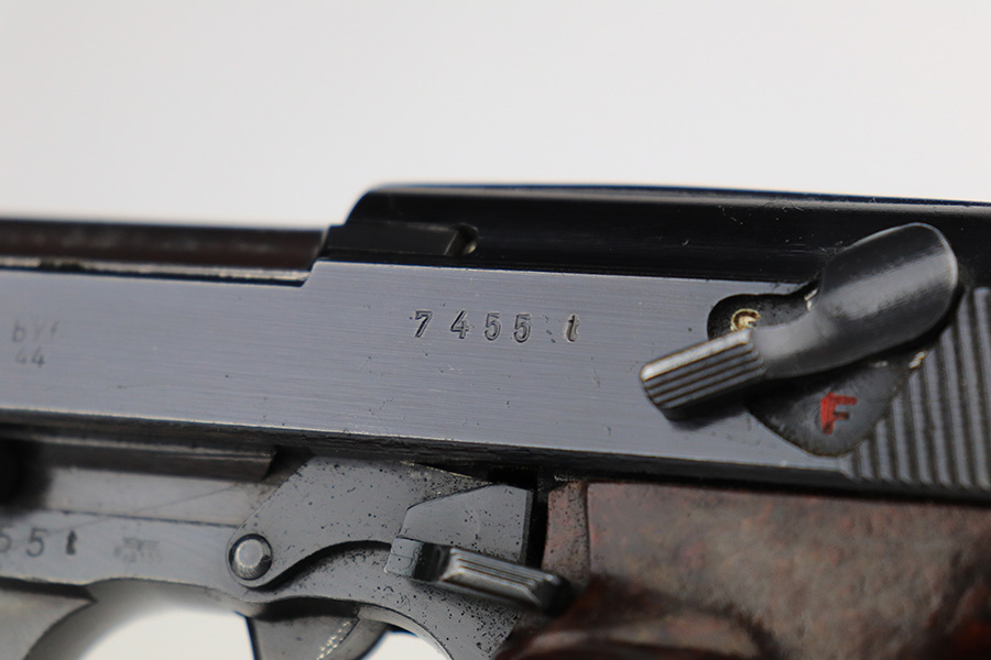 6/2/23 – This is a very nice example of a BYF 44 Mauser P.38 issued to the Nazi military in 1944. It is all matching and has the proper “Waffen 135” military acceptance proofs. It comes as a rig with a worn soft shell holster, one scarce late-war “U” marked Mauser magazine, and one “Eagle 359” marked Walther magazine. The belt loops on the holster appear to have been re-stitched, and a second hole was added to the closure strap. The gun itself has retained about 93% of its original finish. Almost all of the finish loss is on the front strap, so the profile views are minty. There are a couple of tiny dings on the left side of the barrel in the ejection port. A light scratch on the left side of the frame. Fitted with excellent period-correct reddish bakelite grips. Stone-mint bore. De-cocker is functional.