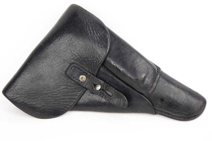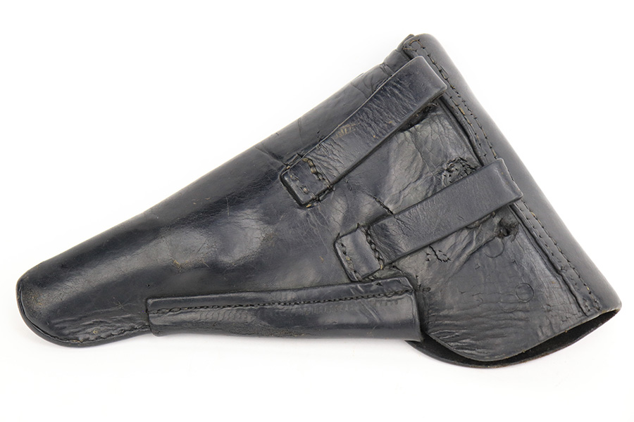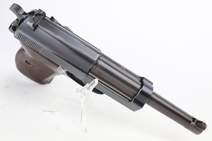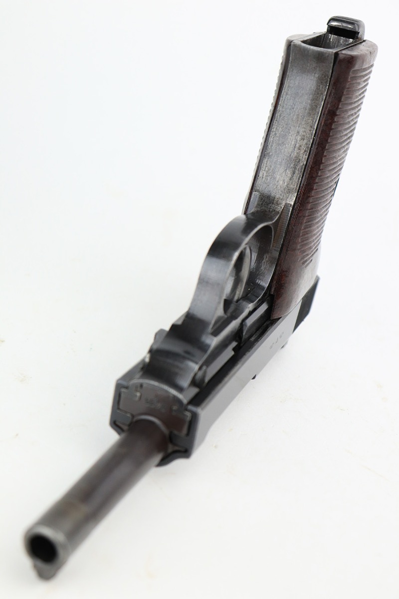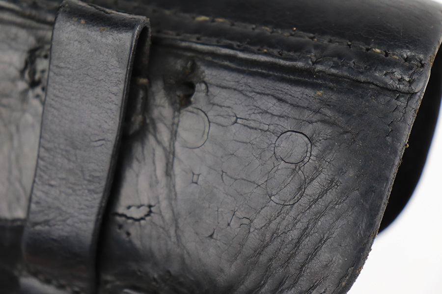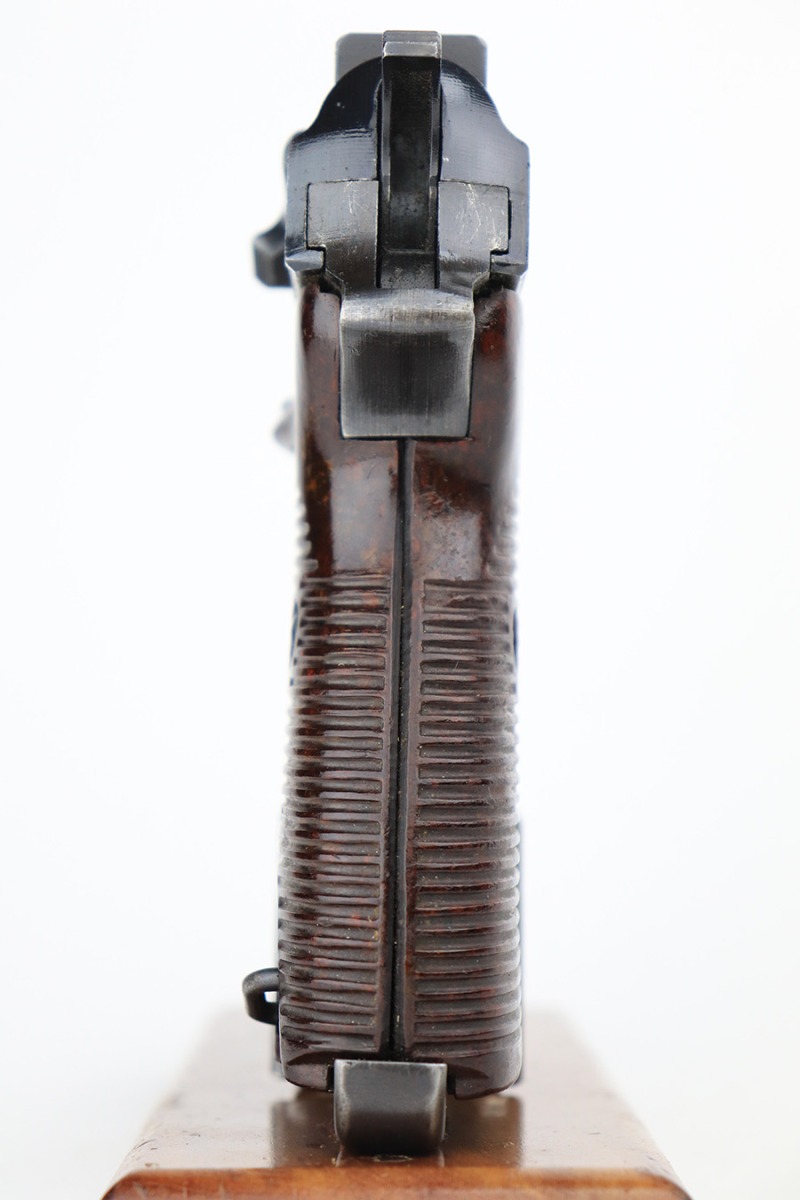 6/2/23 – This is a very nice example of a BYF 44 Mauser P.38 issued to the Nazi military in 1944. It is all matching and has the proper “Waffen 135” military acceptance proofs. It comes as a rig with a worn soft shell holster, one scarce late-war “U” marked Mauser magazine, and one “Eagle 359” marked Walther magazine. The belt loops on the holster appear to have been re-stitched, and a second hole was added to the closure strap. The gun itself has retained about 93% of its original finish. Almost all of the finish loss is on the front strap, so the profile views are minty. There are a couple of tiny dings on the left side of the barrel in the ejection port. A light scratch on the left side of the frame. Fitted with excellent period-correct reddish bakelite grips. Stone-mint bore. De-cocker is functional.