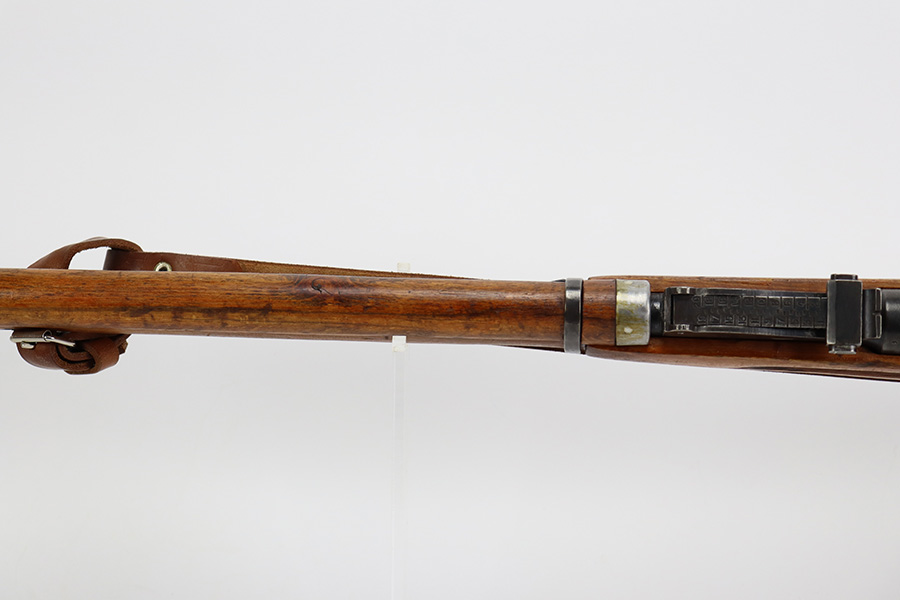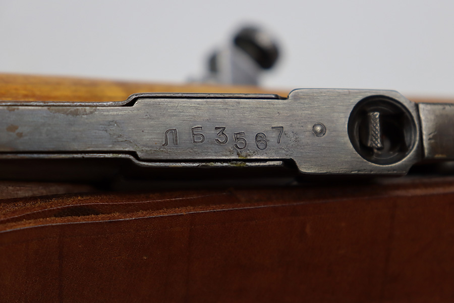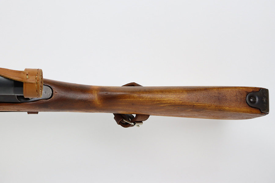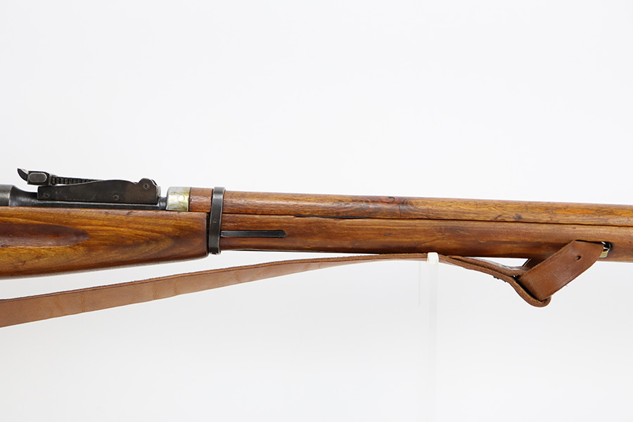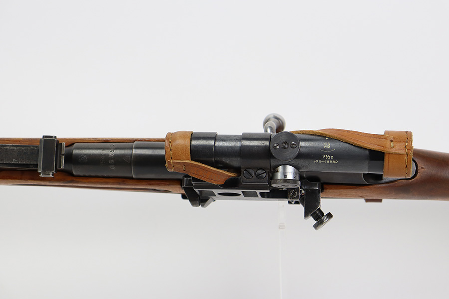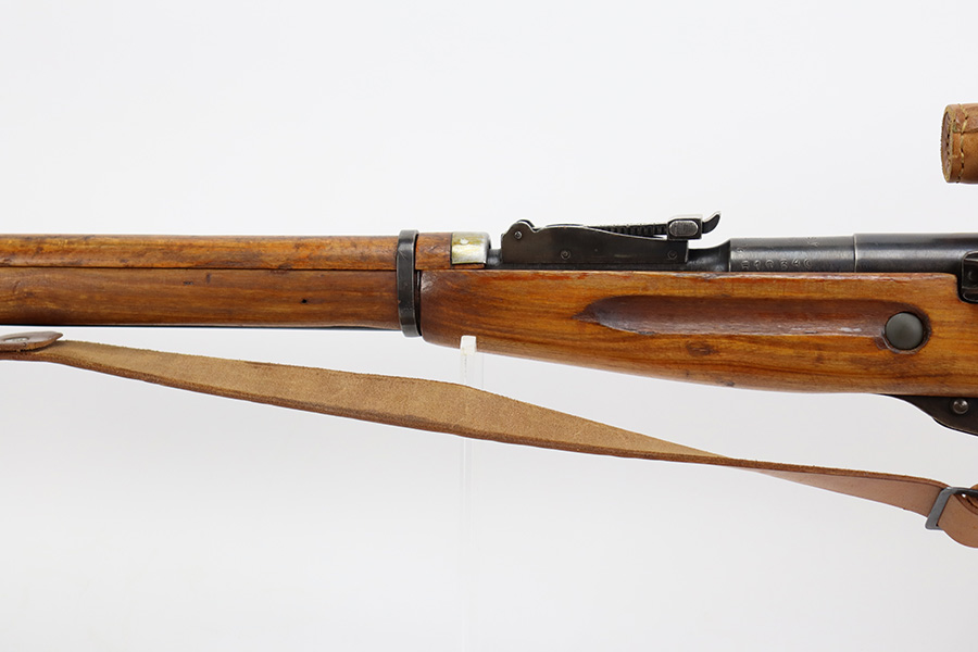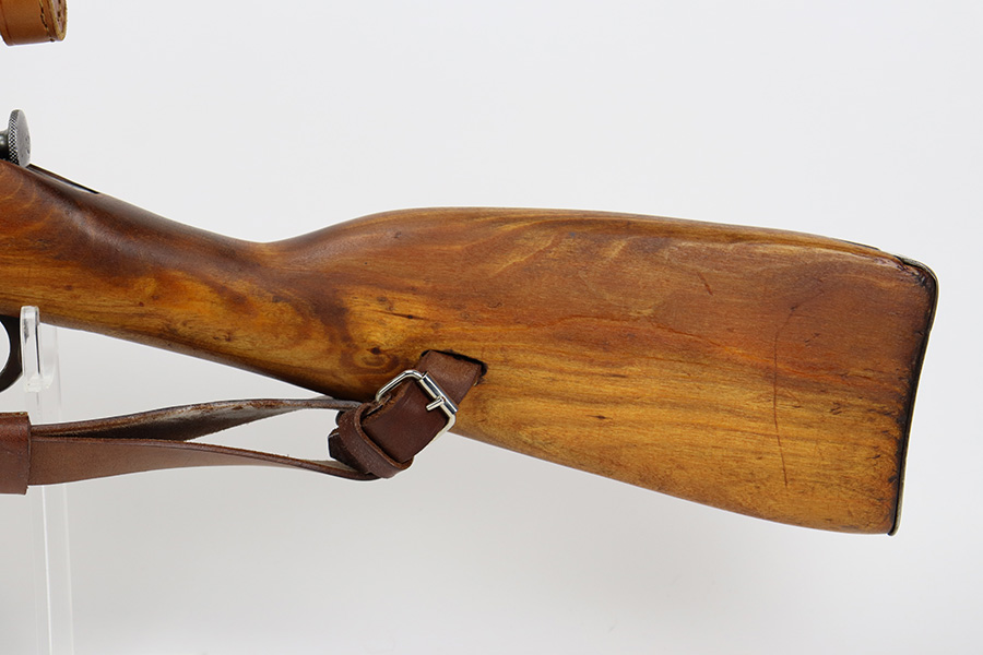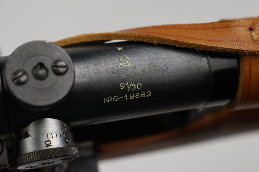 9/8/23 – This is a very nice example of a Mosin-Nagant Model 91/30 in a sniper configuration. All matching with no import marks. Equipped with a reproduction sniper scope (excellent optics) and scope rail. Comes with a nice leather sling and leather eye caps. The metal parts have retained about 90% of their finish with minor thinning on the receiver and some spotty discoloration on the magazine. Nice wood furniture, but it has been lightly sanded. The bore has pretty good rifling, but there is frosting in the grooves.