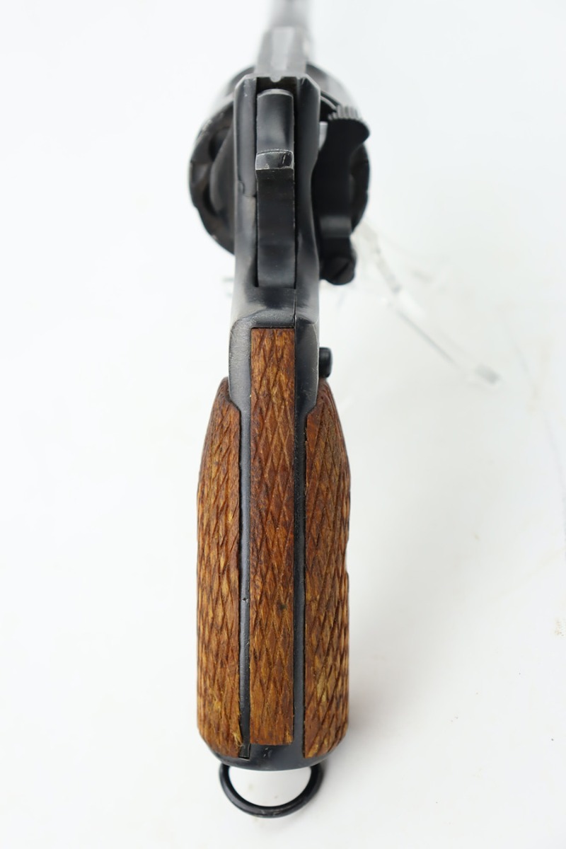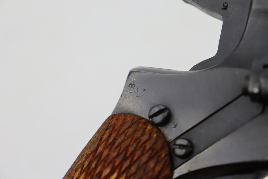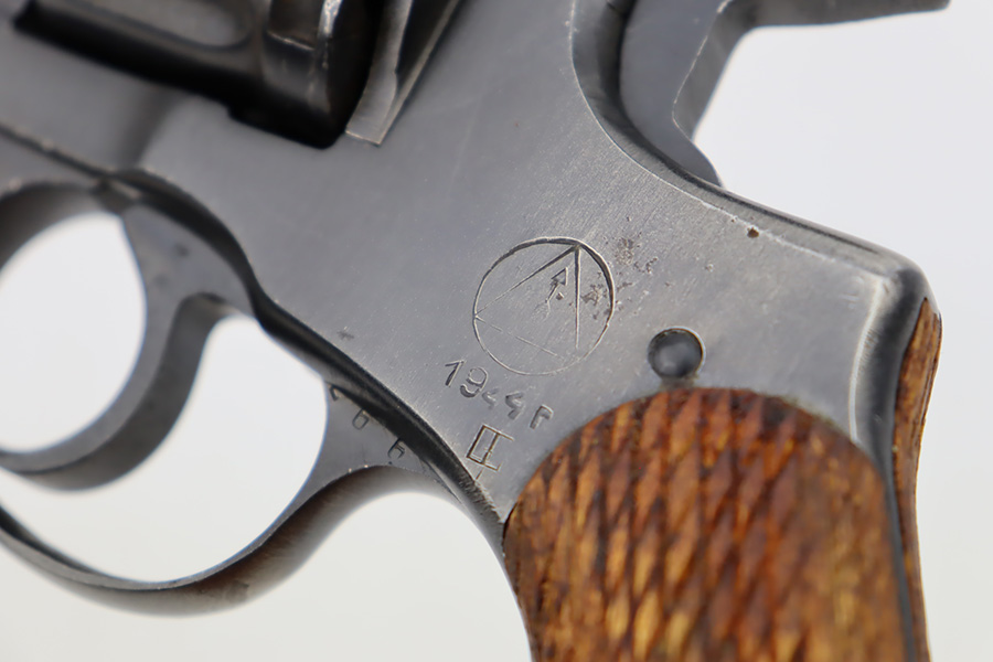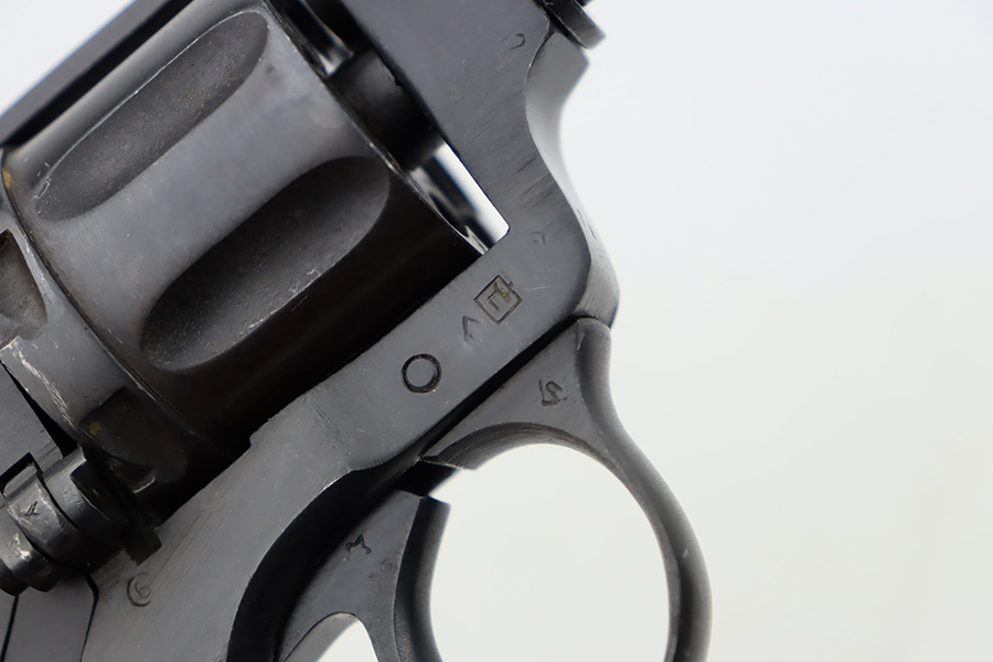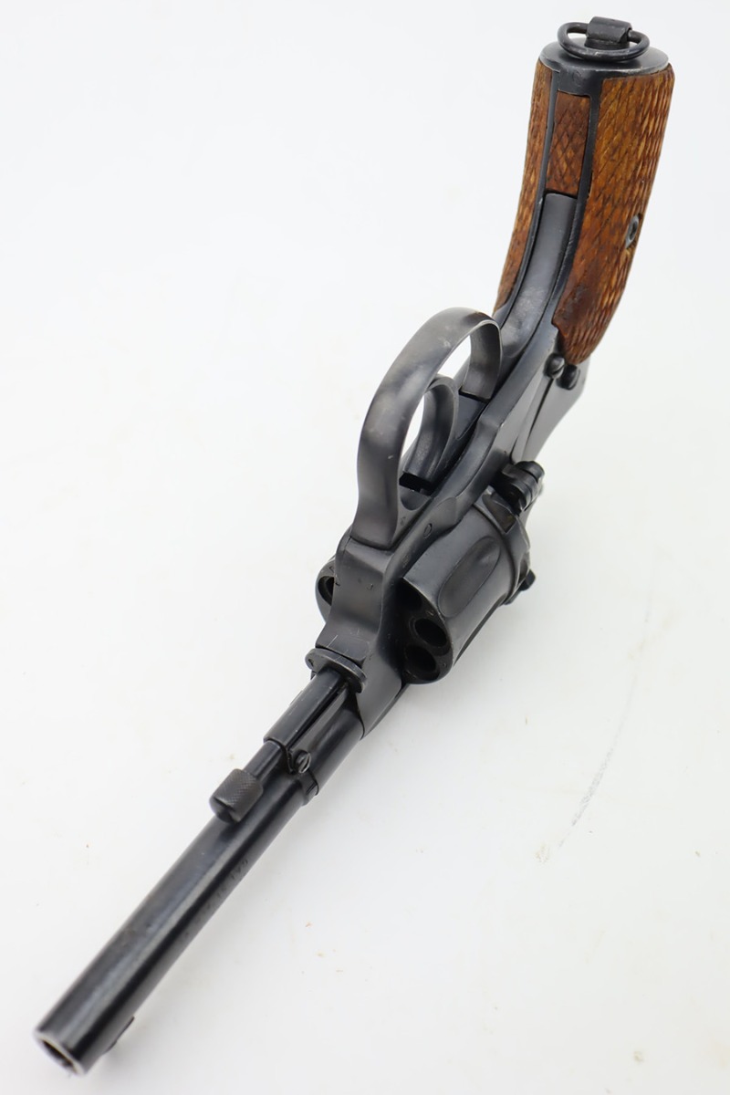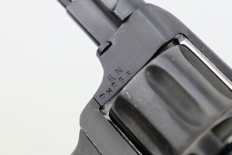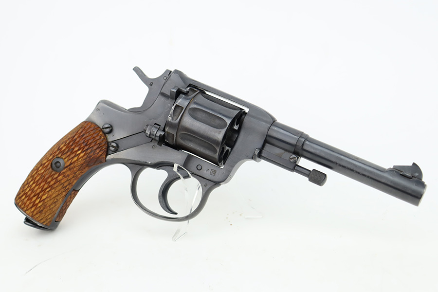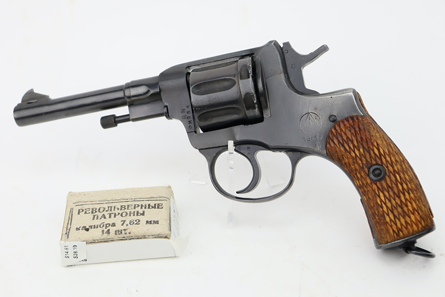 10/20/23 – This is an excellent example of a Nagant Model 1895 Revolver, issued to the Russian military in 1944. It is all matching, but there is an import mark on the barrel. It comes with one box (14 rds) of ammo. The gun has been completely arsenal refurbished and refinished, so the bluing is really nice. Some small areas of very light pin-pricking here and there and an area of very minor thinning on the left side of the frame. Mint wood grips. Mint bore.