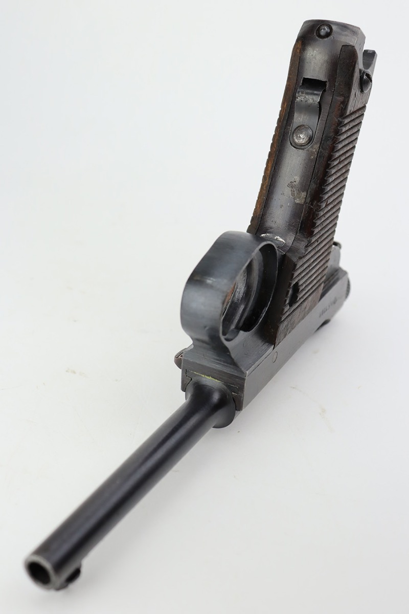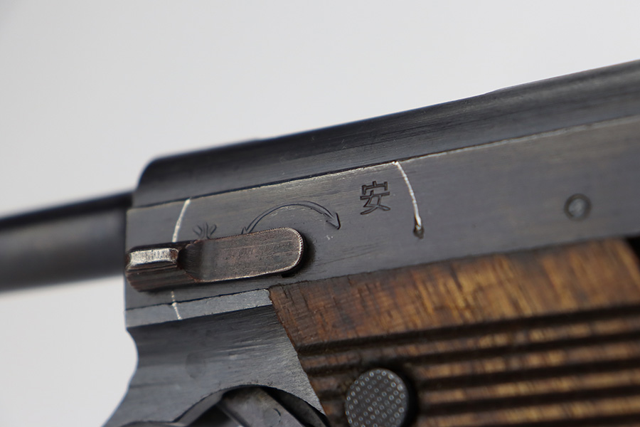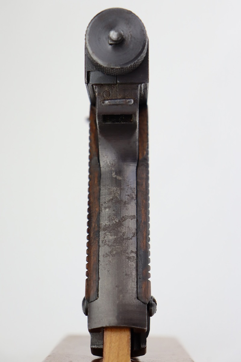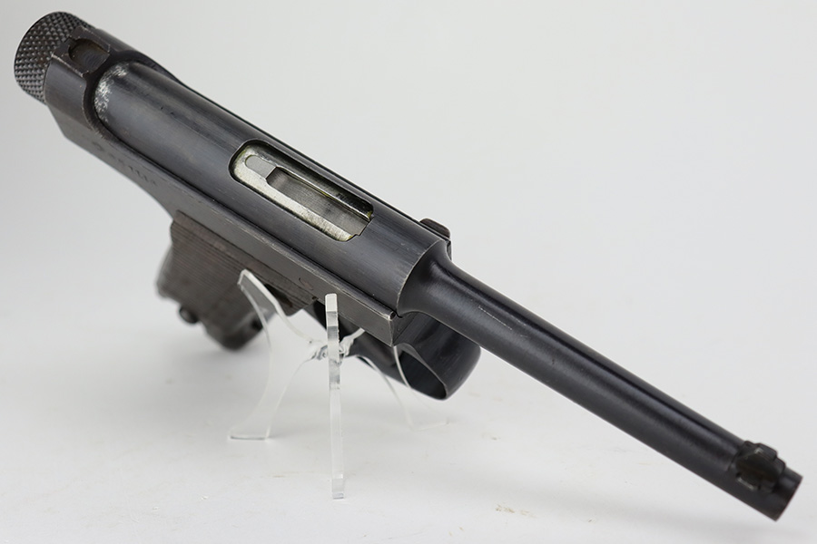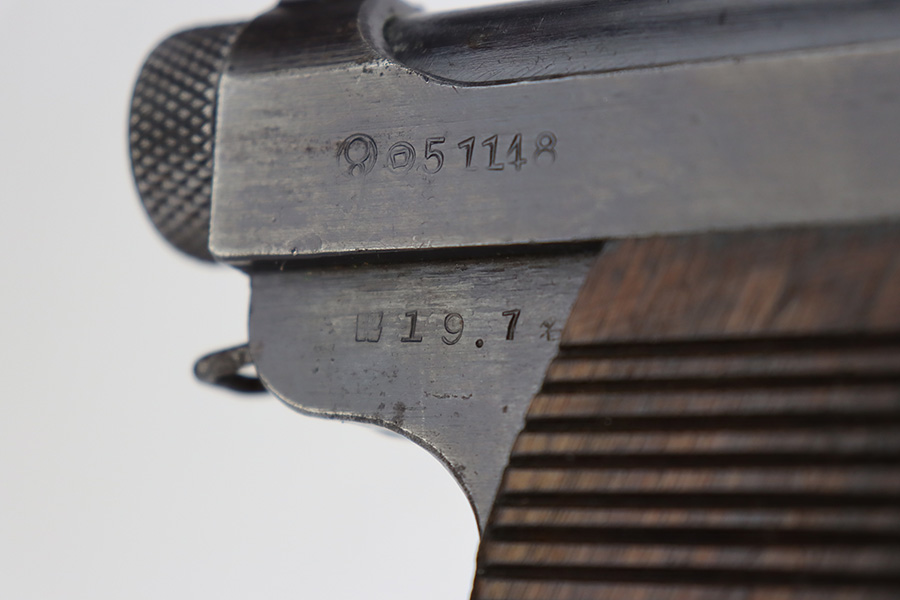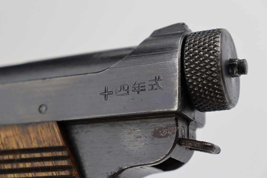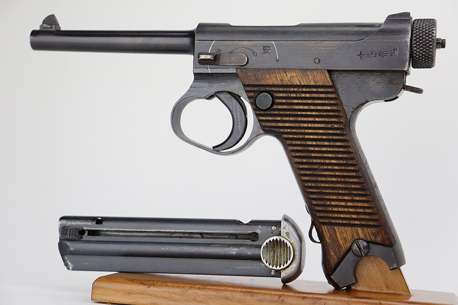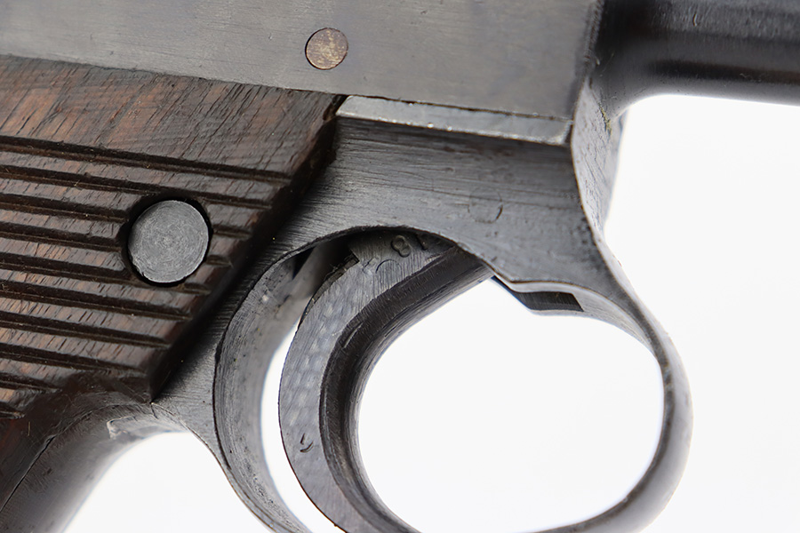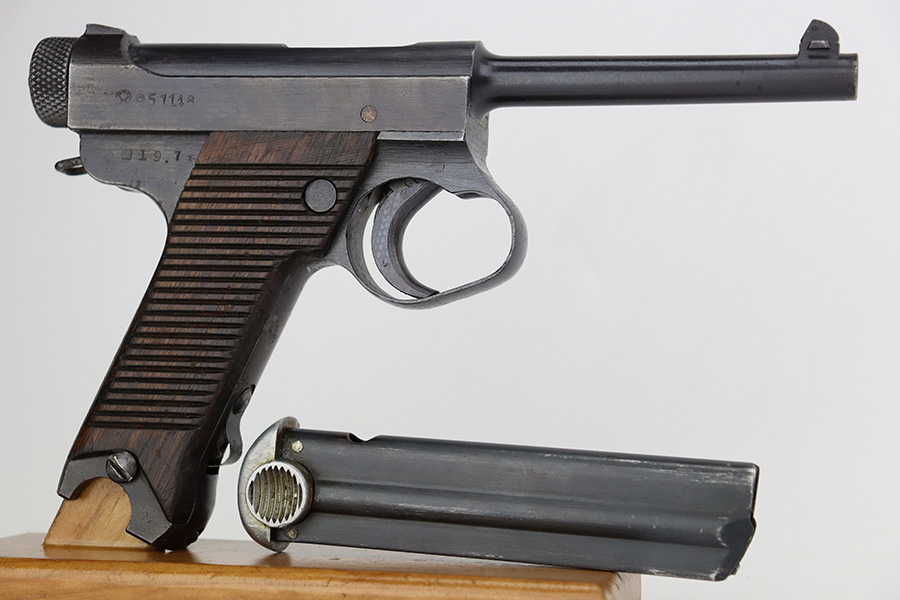 7/11/23 – This is an excellent example of a Nambu Type 14 issued to the Japanese military in July of 1944. All matching. Comes with a period-correct but mismatched magazine. The gun has retained about 97% of its original bluing. While there is very little actual finish loss, there is pitting on both grip straps – most noticeable on the back strap. Fitted with excellent matching-numbered wood grips. Mint bore.