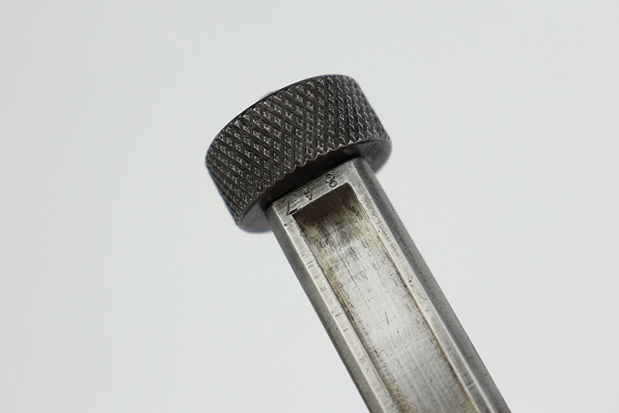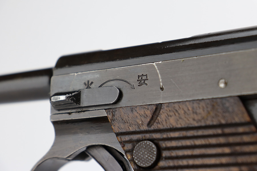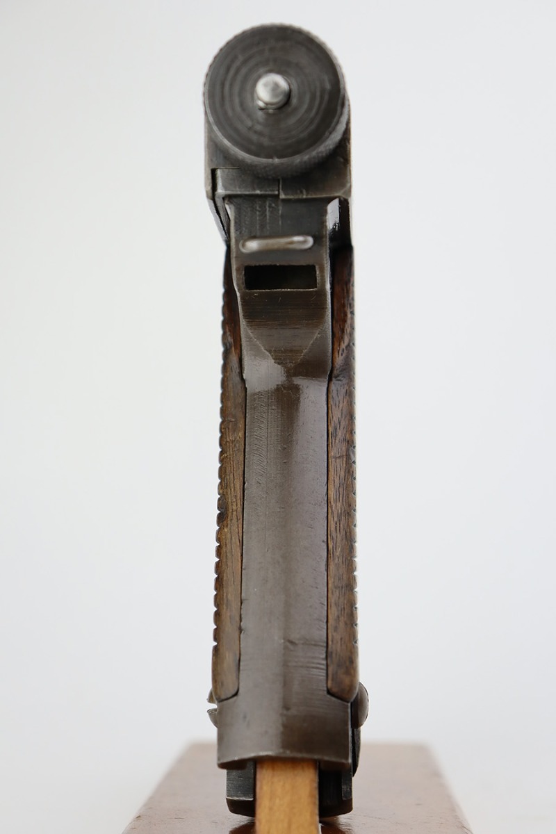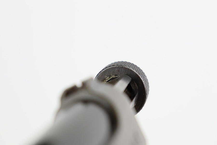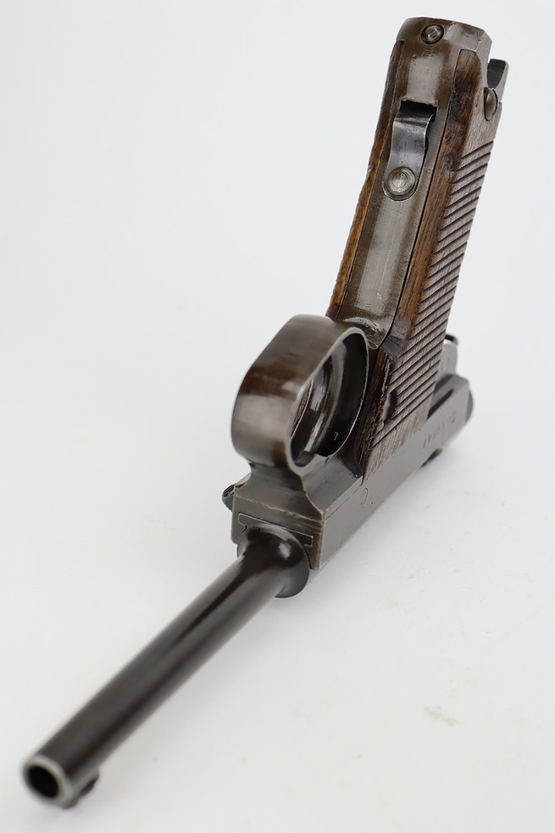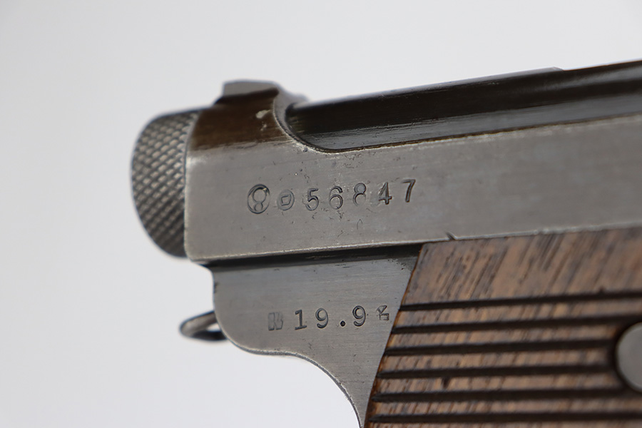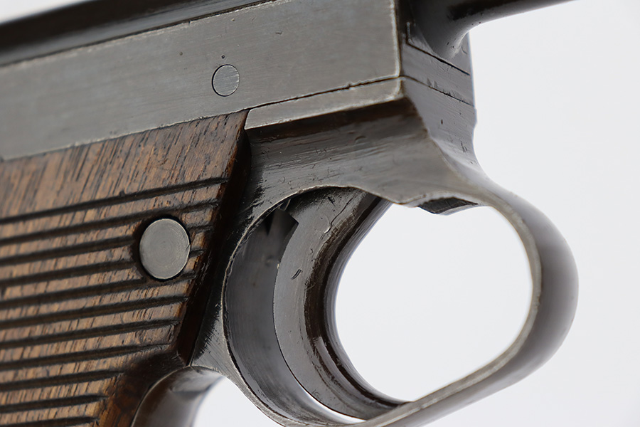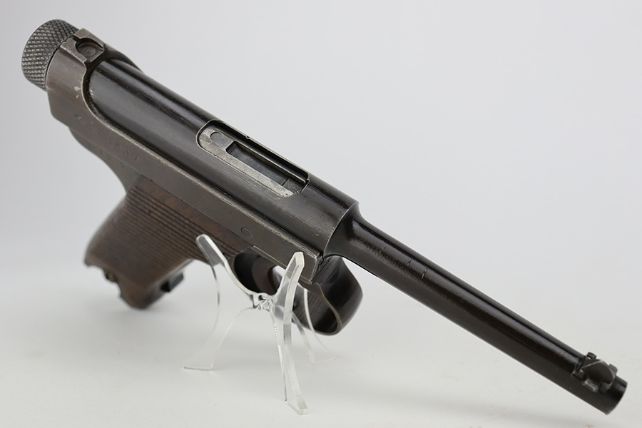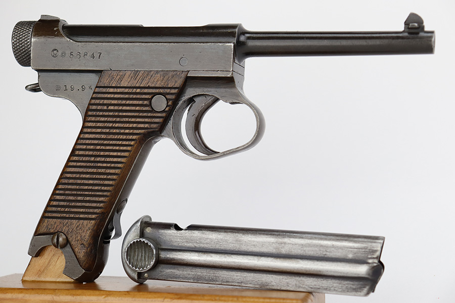 8/2/23 – This is a nice example of a Nambu Type 14 issued to the Japanese military in September of 1944. It is mostly matching, but the cocking knob is mismatched. It has retained roughly 70% of its original finish with fairly even thinning throughout. Fitted with nice matching-numbered wood grips. Comes with a period-correct but mismatched magazine. Excellent bore with great rifling.