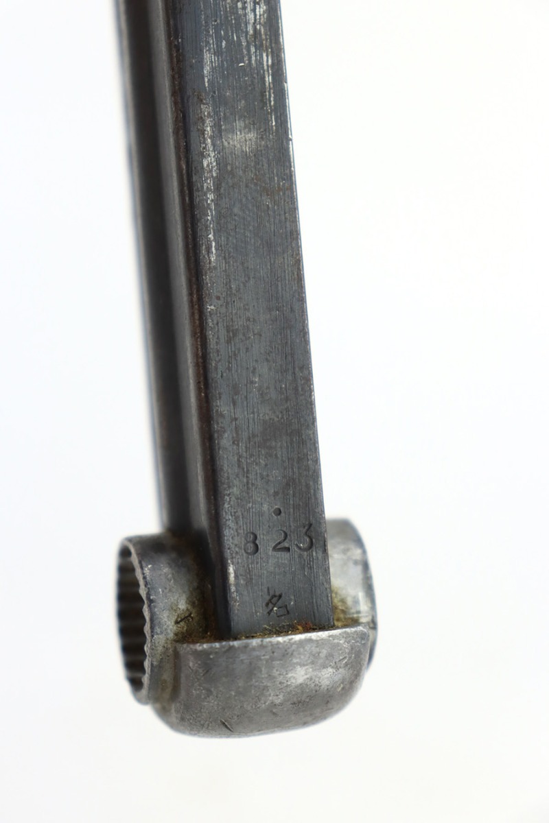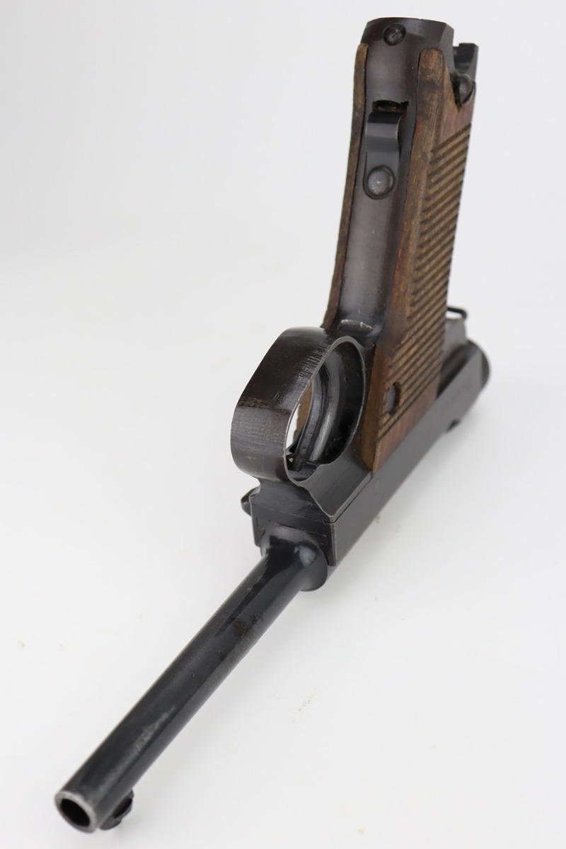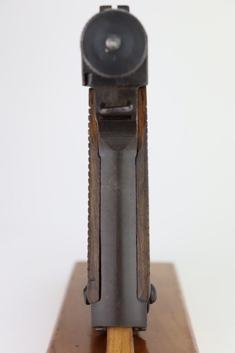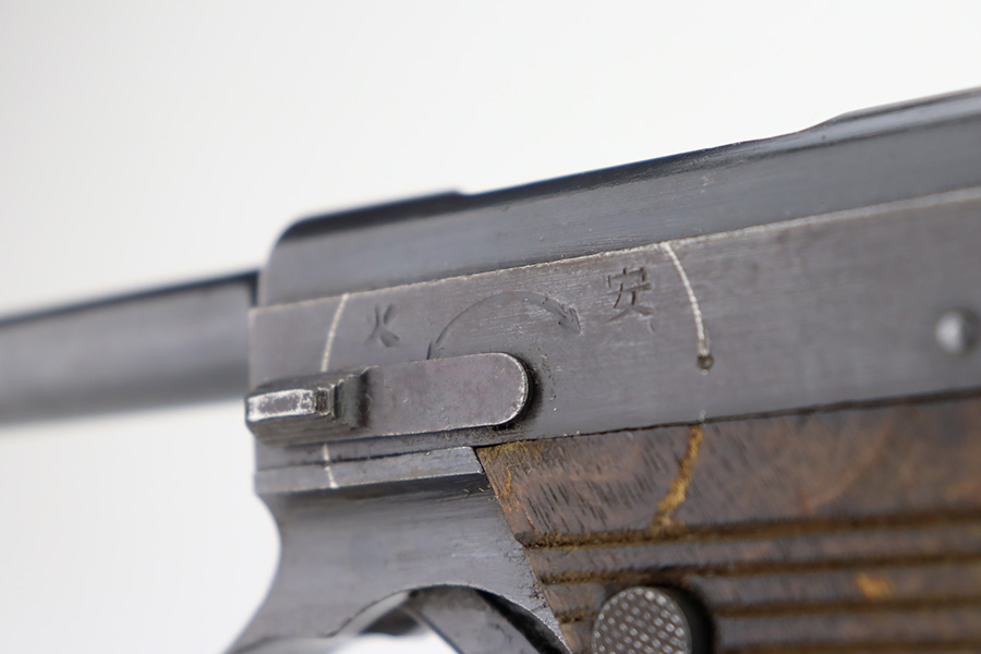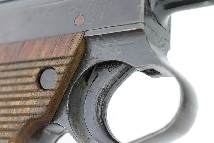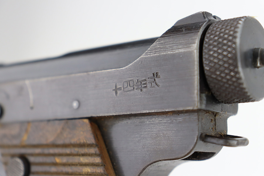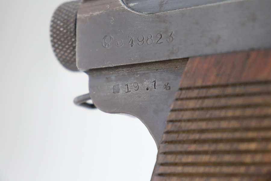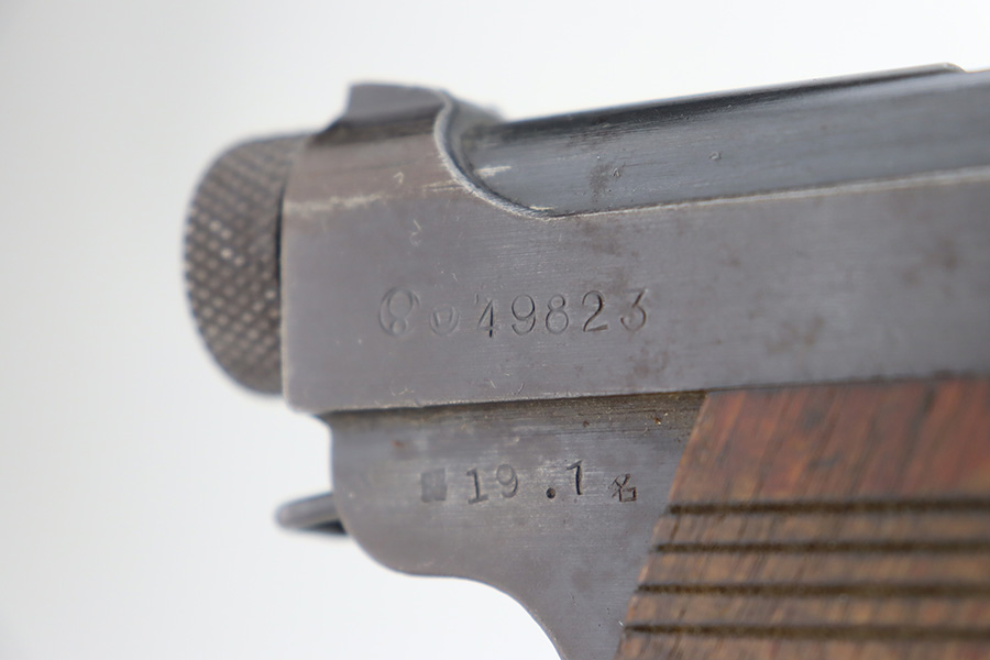 1/5/24 – This is an excellent Nambu Type 14 issued to the Japanese military in January of 1944. All matching and comes with one original matching-numbered magazine. The original finish rates about 97%. While there is very little actual finish loss, there a small area of oxidation and minor pitting on the right side of the barrel and light brown patina on the grip straps. Fitted with matching-numbered wood grips. The bore is shiny with strong rifling, but there is an area of light spotty oxidation.