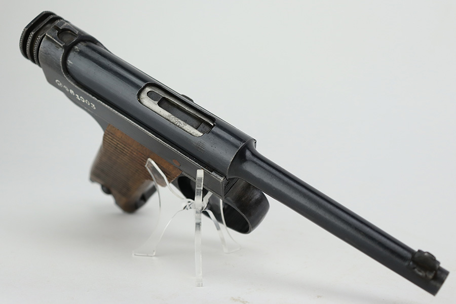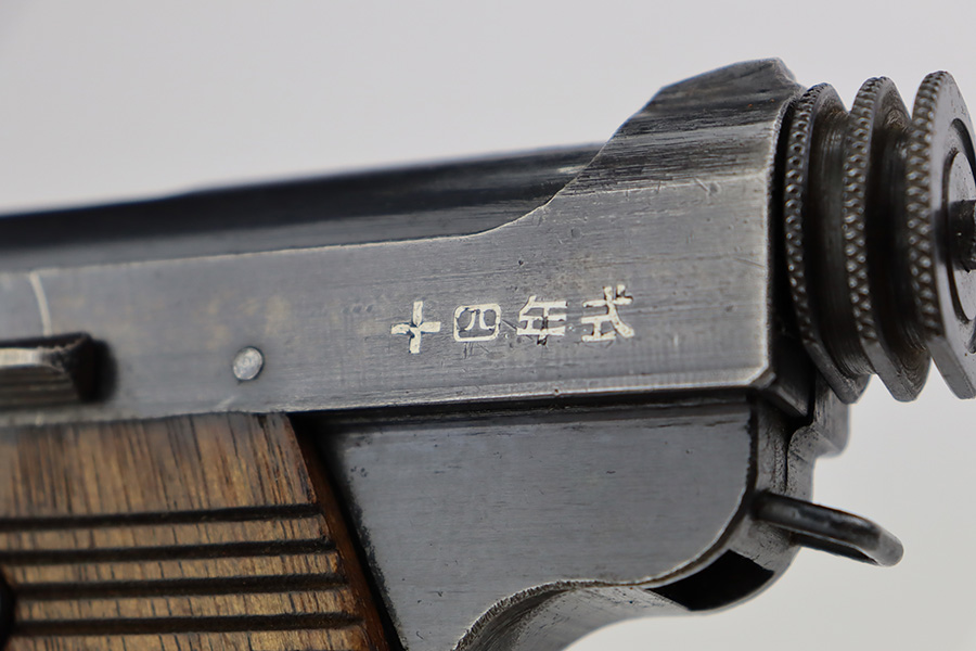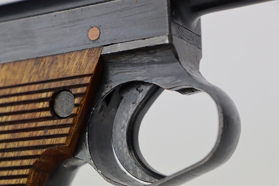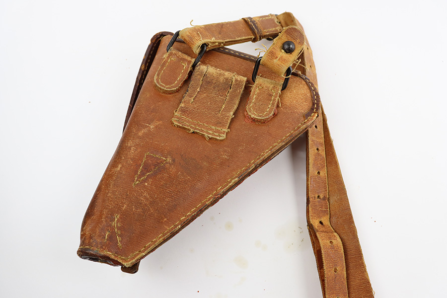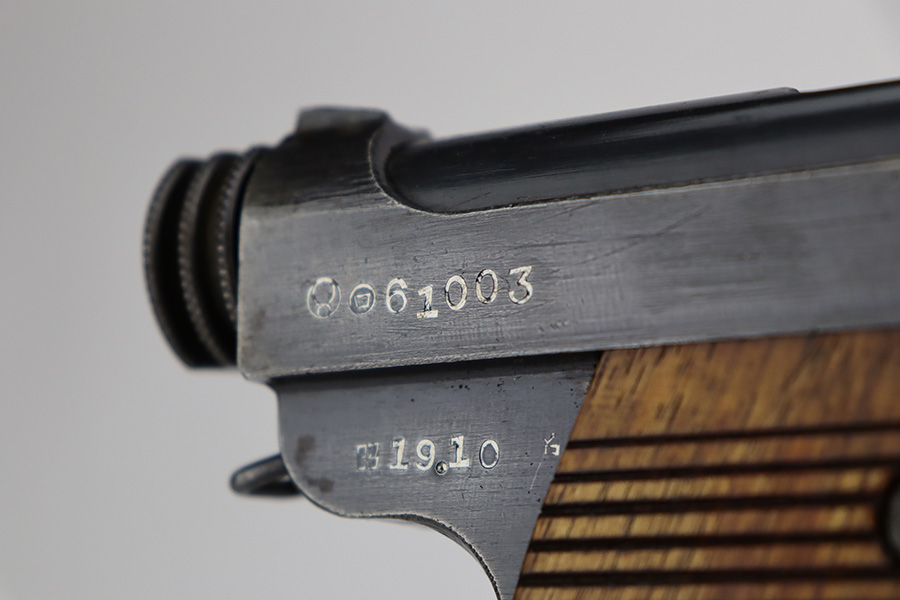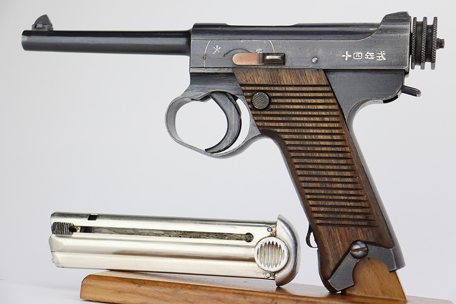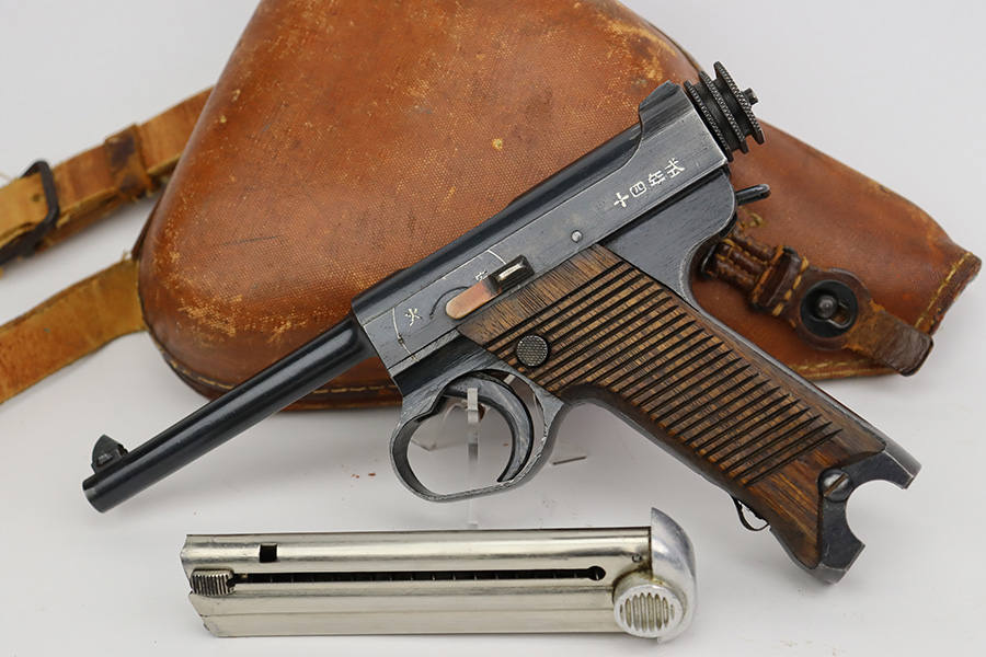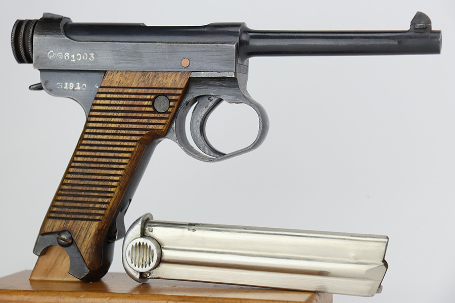 8/7/23 – This is a very nice example of a Nambu Type 14 issued to the Japanese military in October of 1944. It is all matching and comes as a rig with a scarce rubberized canvas shoulder holster (with strap) and a mismatched nickel-plated magazine. The gun itself has retained about 90% of its original finish. The majority of the finish loss comes in the form of thinning on the back strap, where there is also some freckling. The profile views are excellent. Fitted with excellent matching-numbered wood grips. Mint bore.