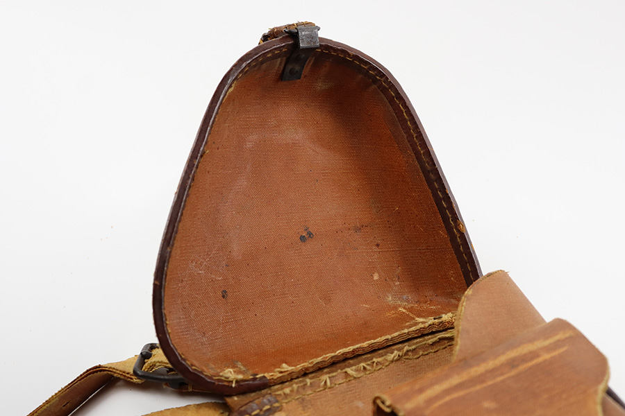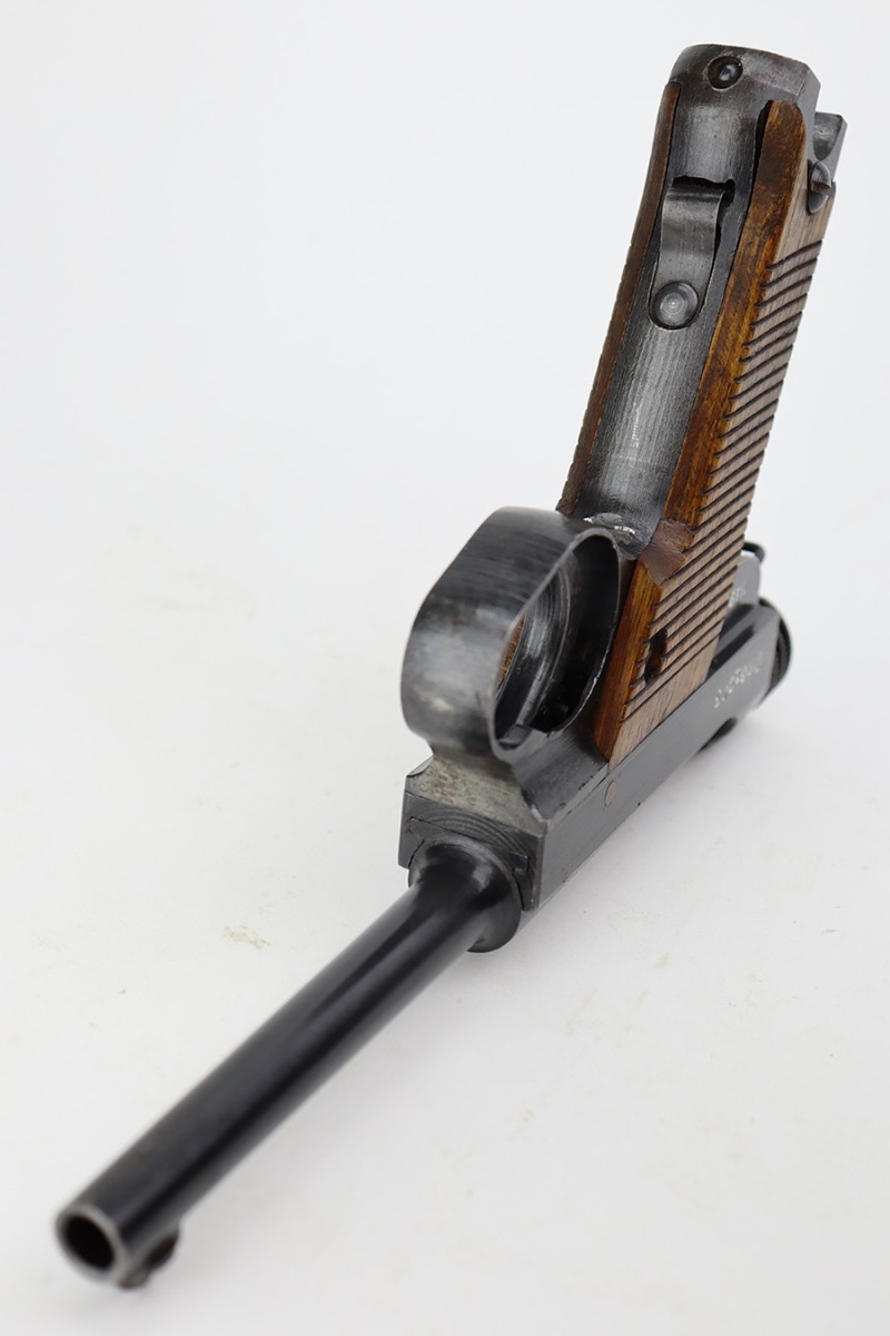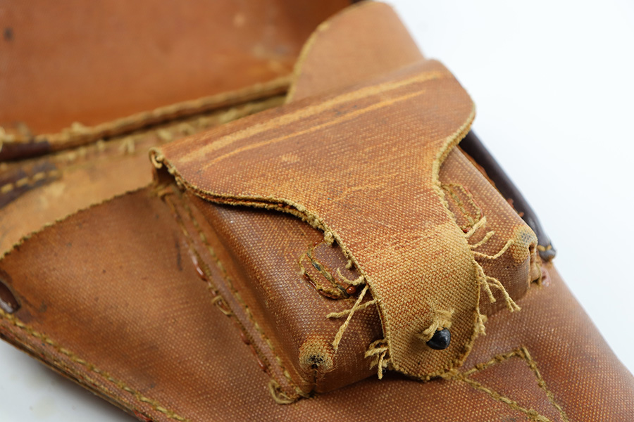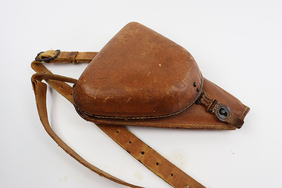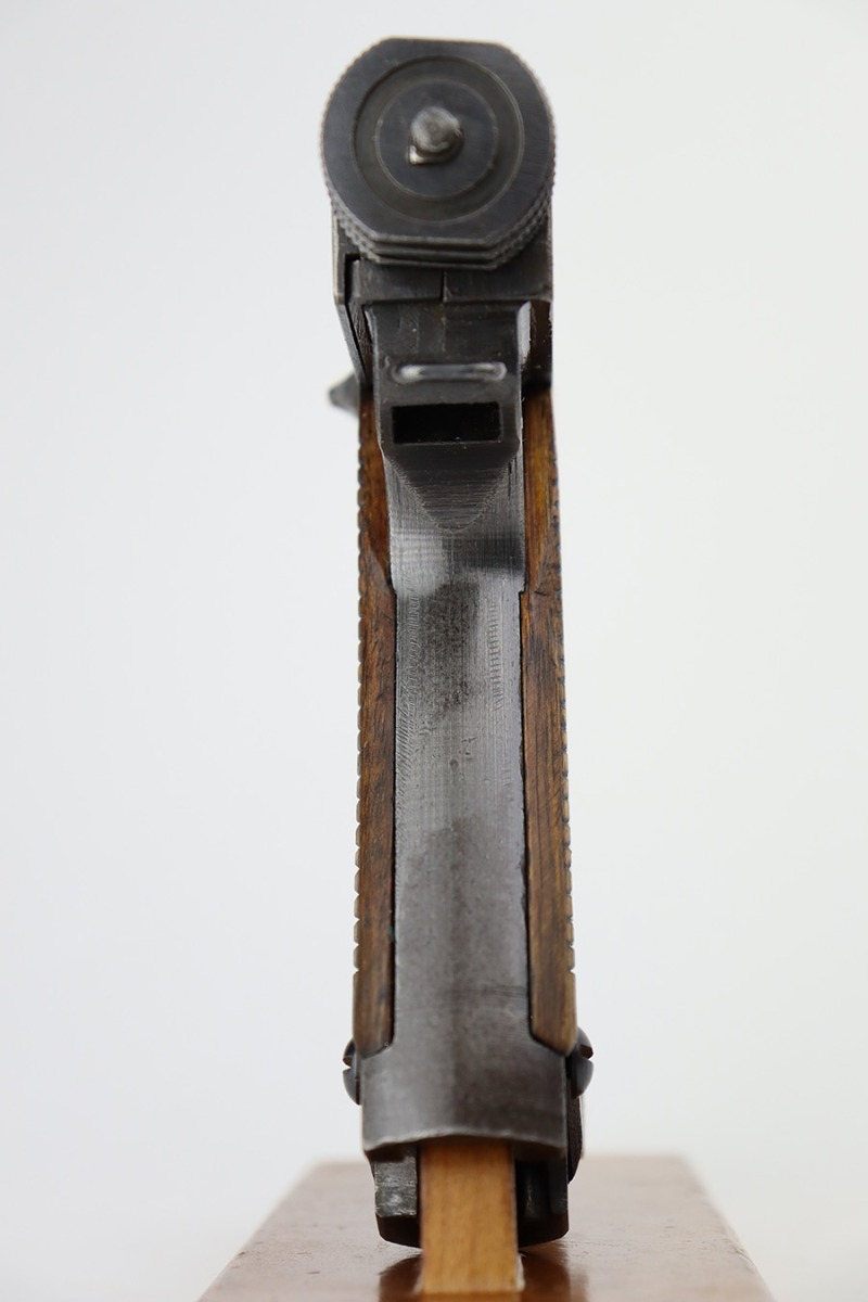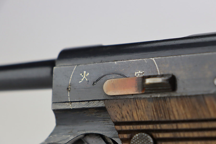 8/7/23 – This is a very nice example of a Nambu Type 14 issued to the Japanese military in October of 1944. It is all matching and comes as a rig with a scarce rubberized canvas shoulder holster (with strap) and a mismatched nickel-plated magazine. The gun itself has retained about 90% of its original finish. The majority of the finish loss comes in the form of thinning on the back strap, where there is also some freckling. The profile views are excellent. Fitted with excellent matching-numbered wood grips. Mint bore.
