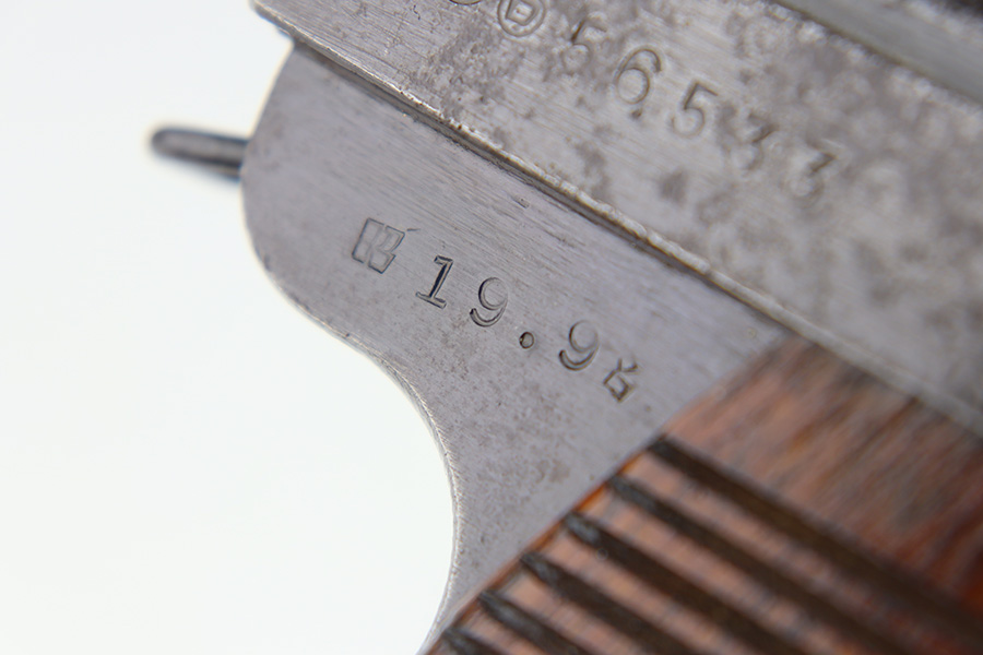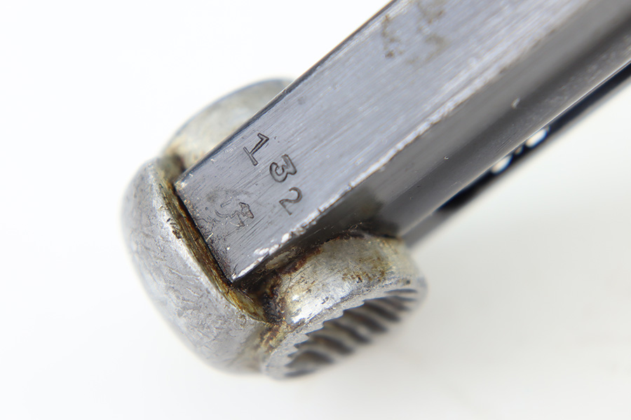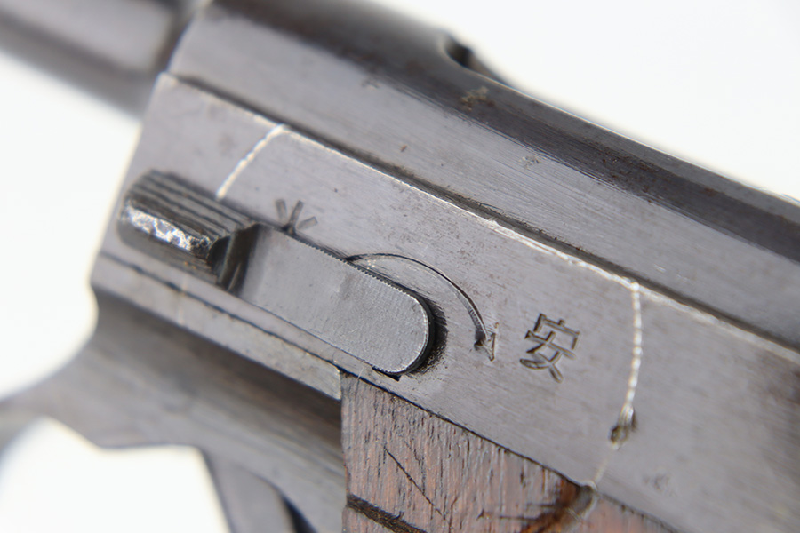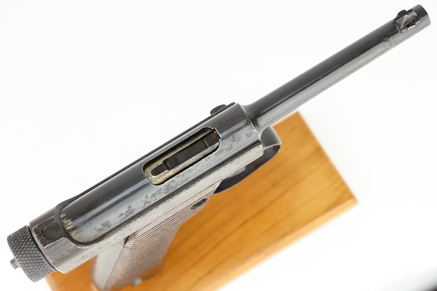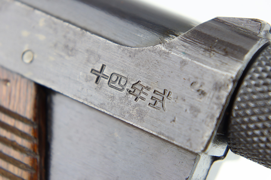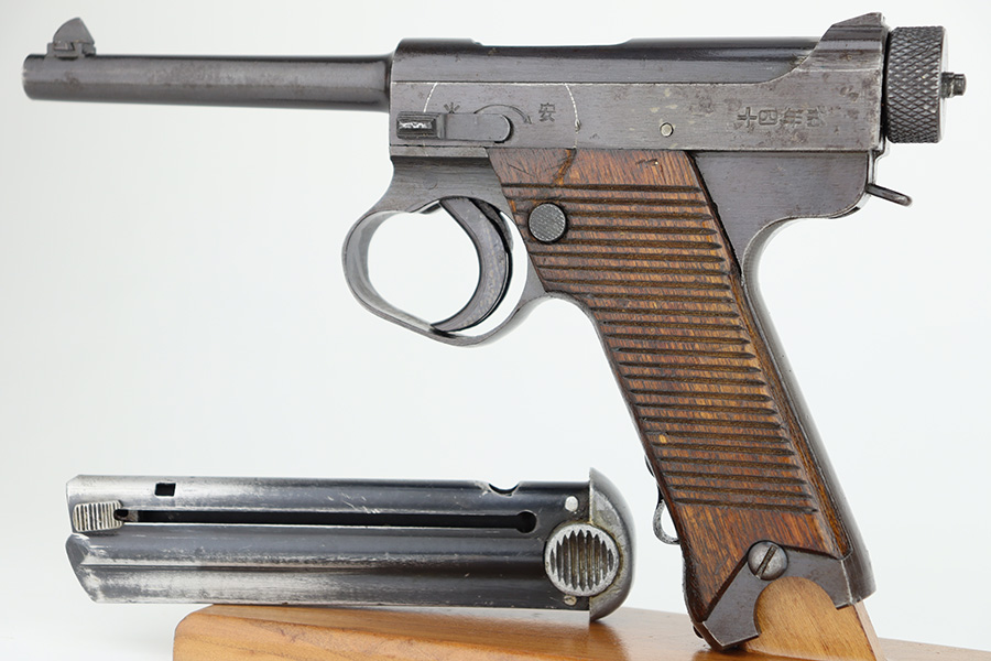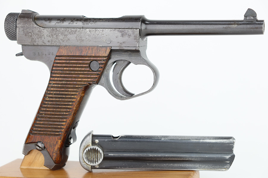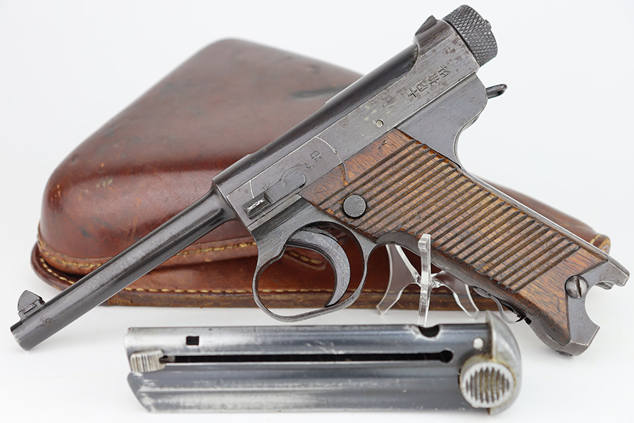 12/1/23 – This is a nice Nambu Type 14 issued to the Japanese military in September of 1944. It is all matching and comes as a rig with a very nice clam shell holster, a nickeled cleaning rod, and a mismatched magazine. The gun itself shows very little actual finish loss, but there is noticeable spotty oxidation and minor pitting on the right side of the gun. Fitted with matching-numbered wood grips. Mint bore.