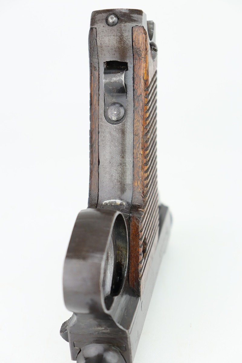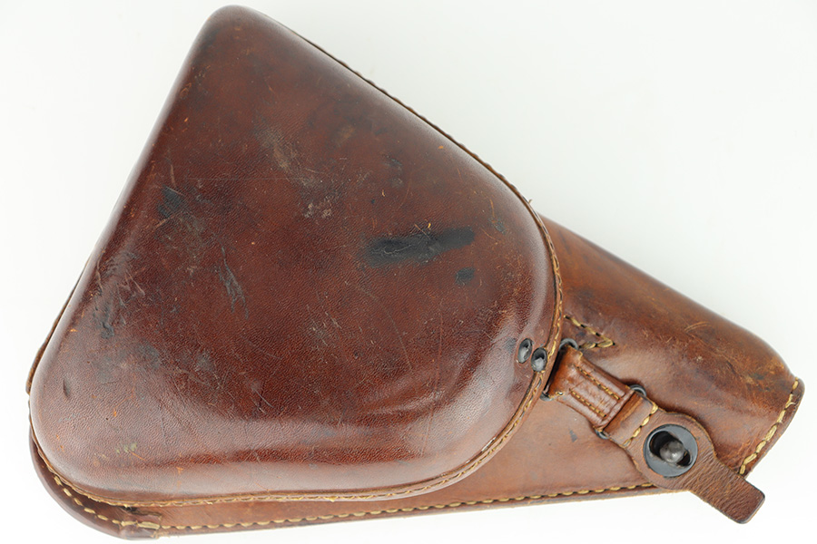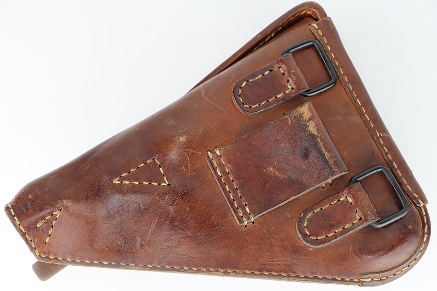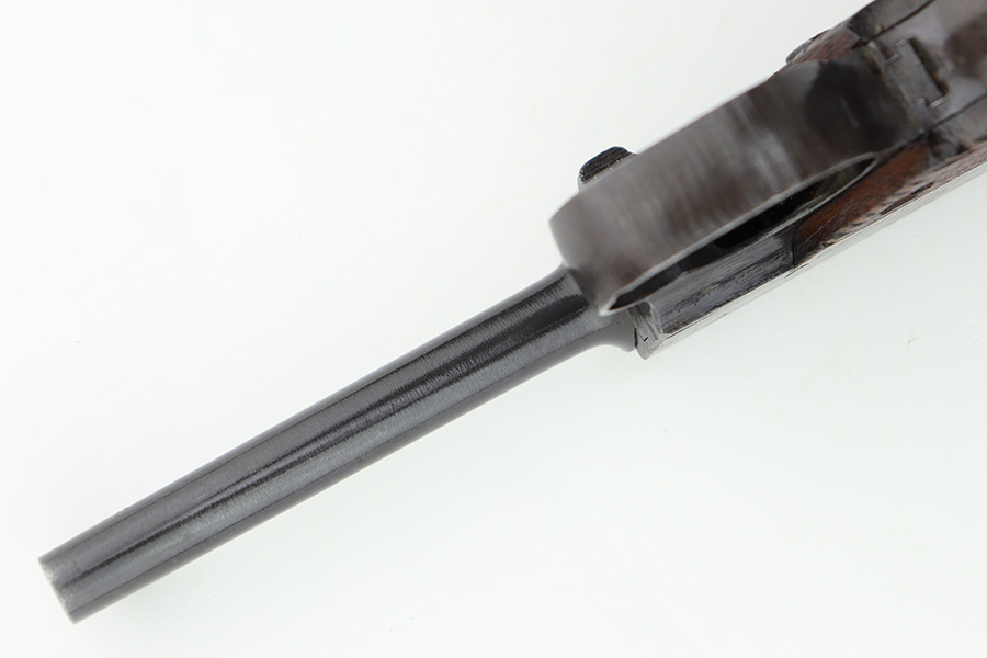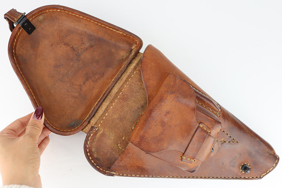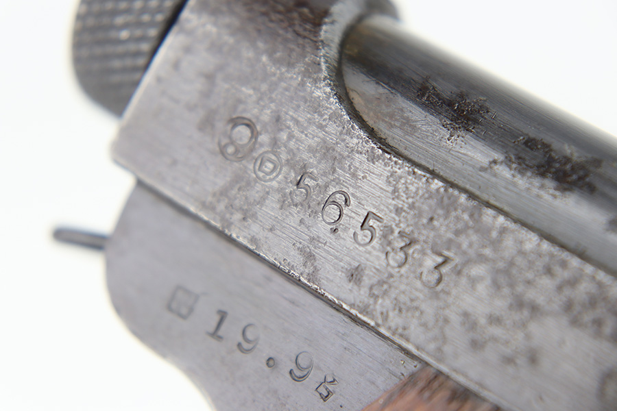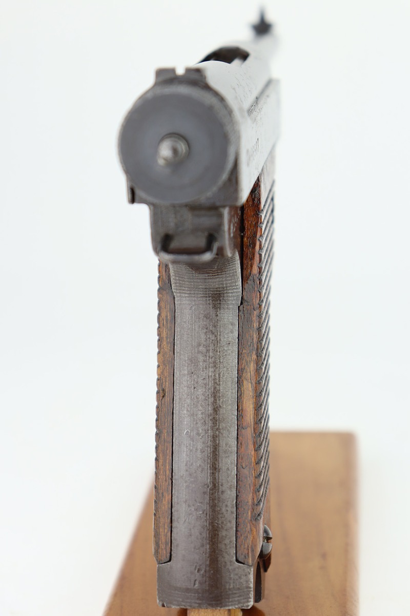 12/1/23 – This is a nice Nambu Type 14 issued to the Japanese military in September of 1944. It is all matching and comes as a rig with a very nice clam shell holster, a nickeled cleaning rod, and a mismatched magazine. The gun itself shows very little actual finish loss, but there is noticeable spotty oxidation and minor pitting on the right side of the gun. Fitted with matching-numbered wood grips. Mint bore.