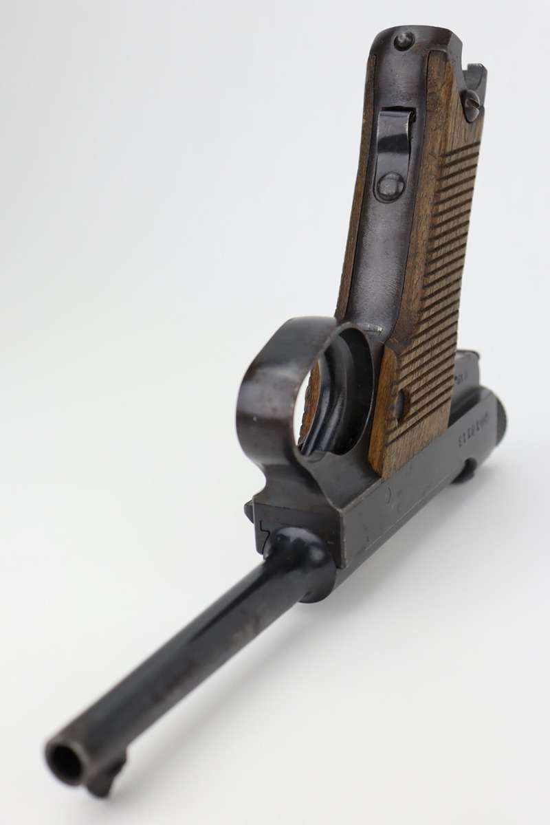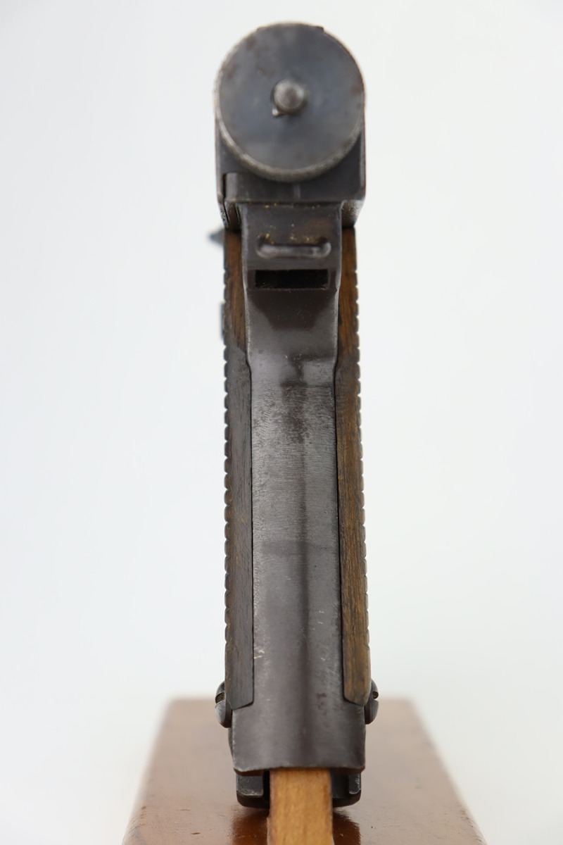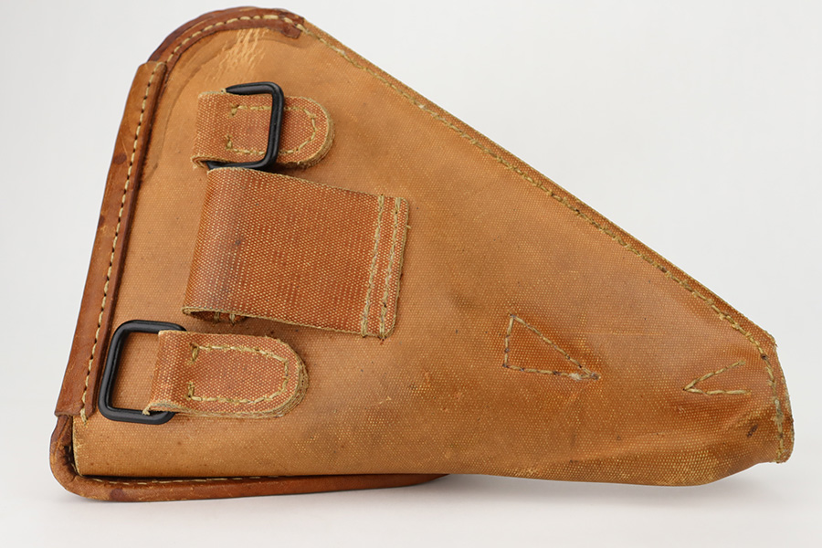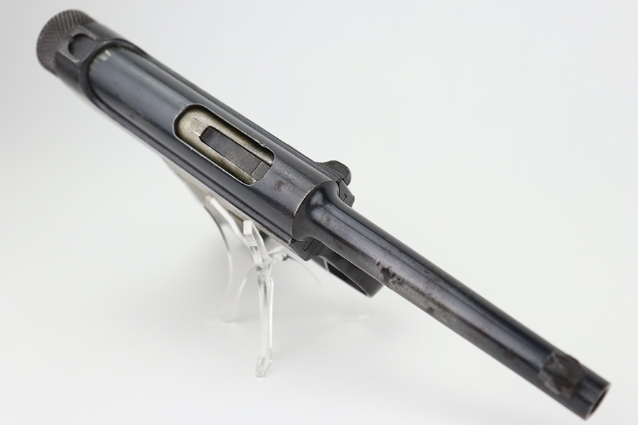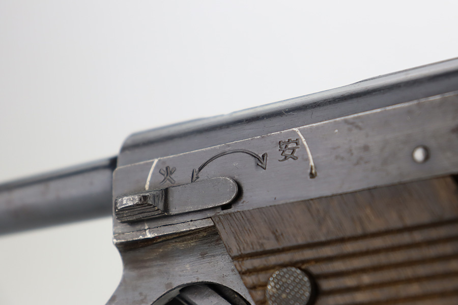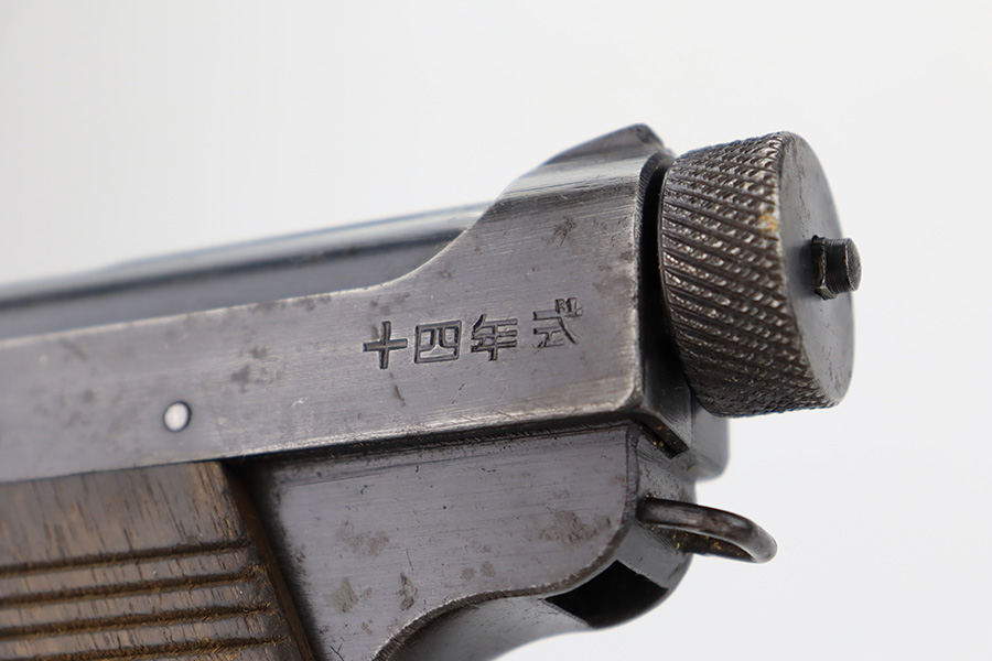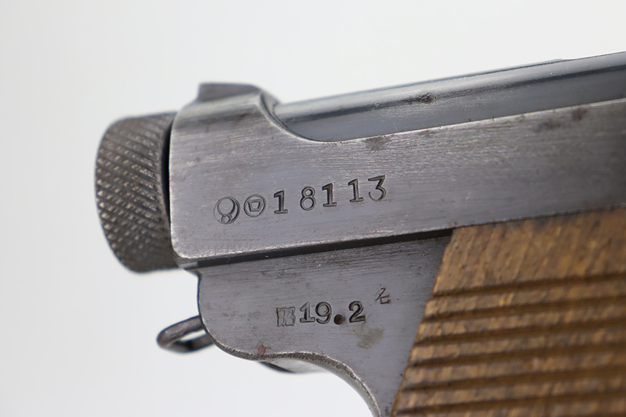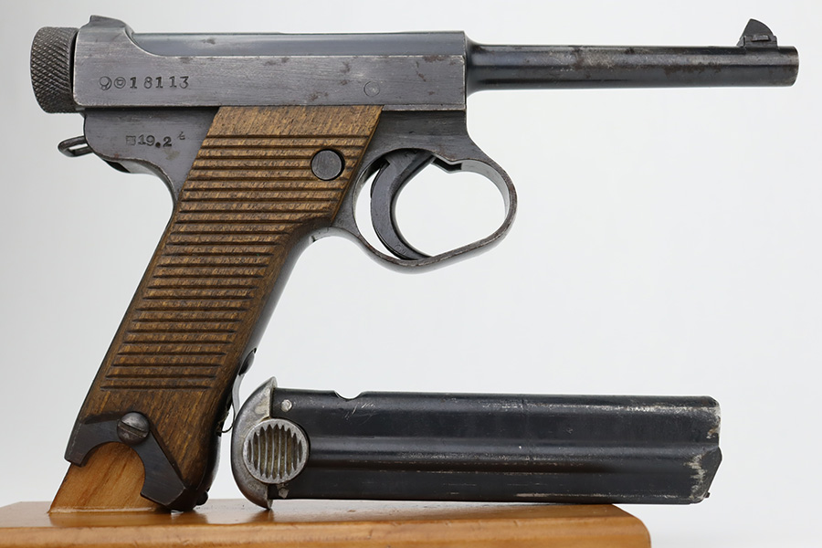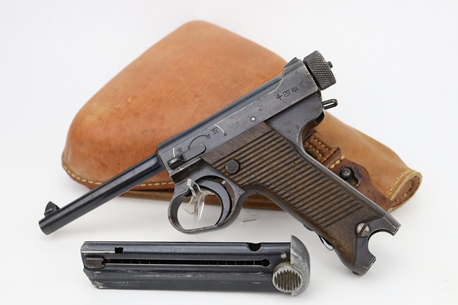 12/11/23 – This is a nice example of a Nambu Type 14 issued to the Japanese military in February of 1944. It is all matching and comes as a rig with period-correct rubberized canvas holster and one original matching-numbered magazine. The original finish rates about 93% with general high edge wear and some wear along the right side of the barrel. While there isn’t a lot of actual finish loss, there are spots of surface oxidation here and there. Fitted with matching-numbered wood grips. Mint bore.