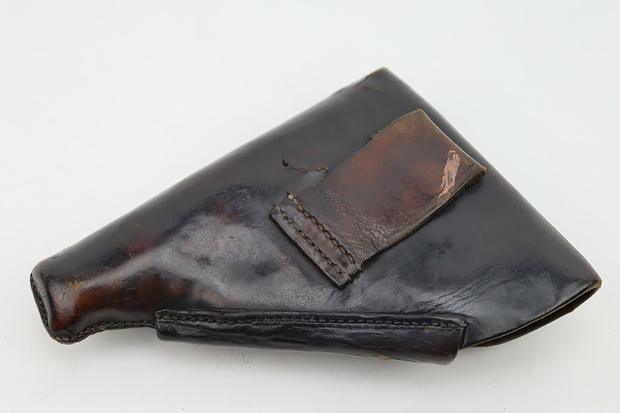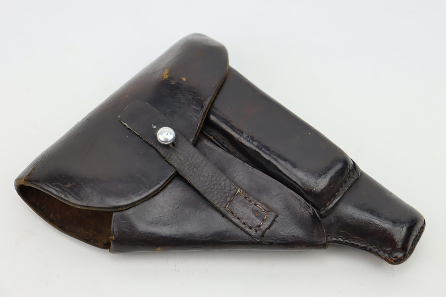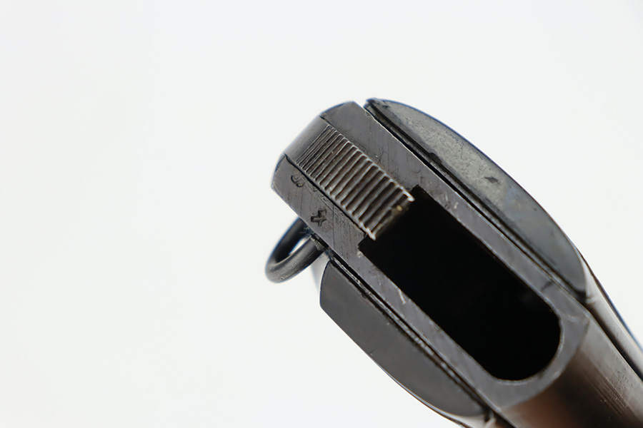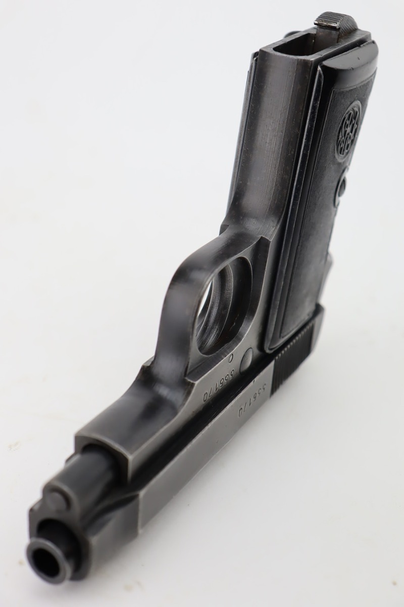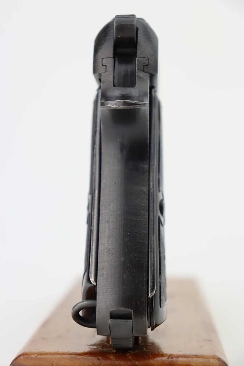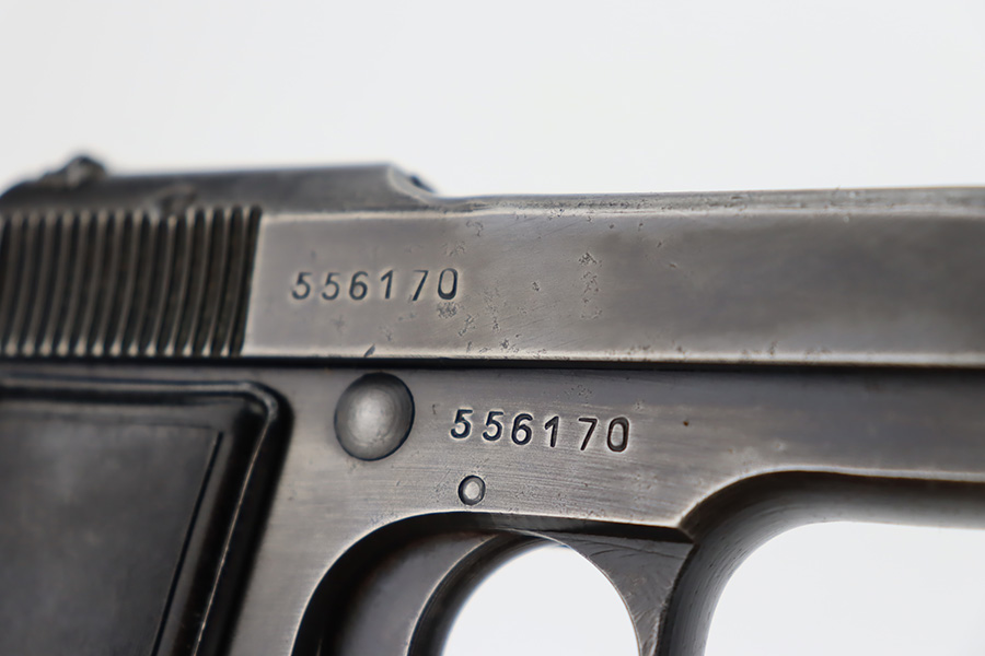 10/12/23 – This is a Beretta Model 1935, manufactured in 1944 and chambered in 7.65mm. All matching with a “4UT” marking on the tang, indicating it was issued to the Nazi military. It comes as a rig with one proper magazine and a period-correct but un-marked leather holster. It’s late-war finish rates roughly 80% with areas of thinning throughout, general high edge wear, and small spots of pin-pricking throughout. Fitted with excellent period-correct black bakelite grips. Mint bore.