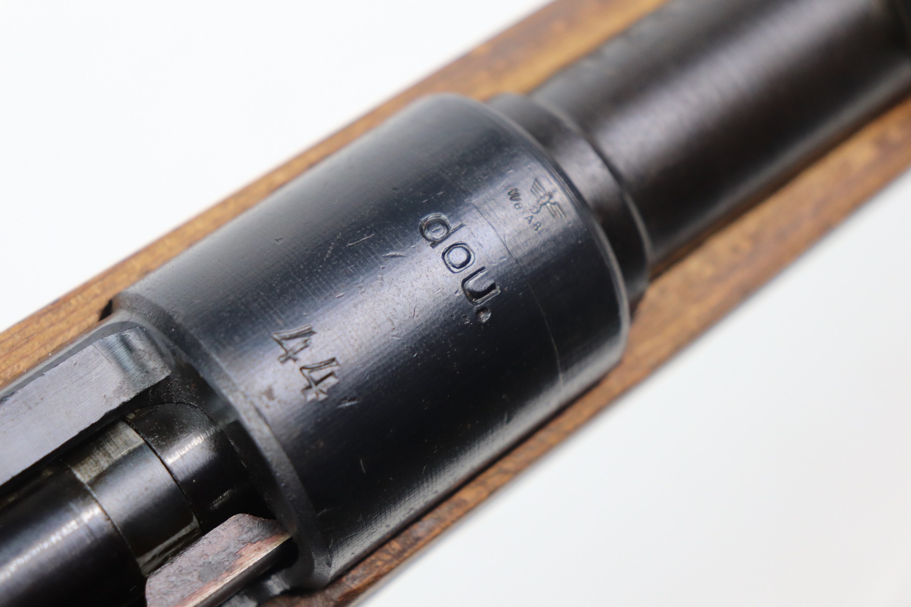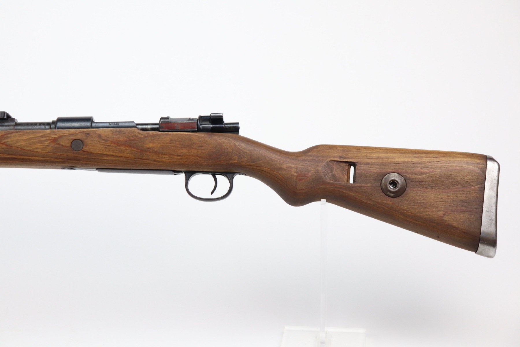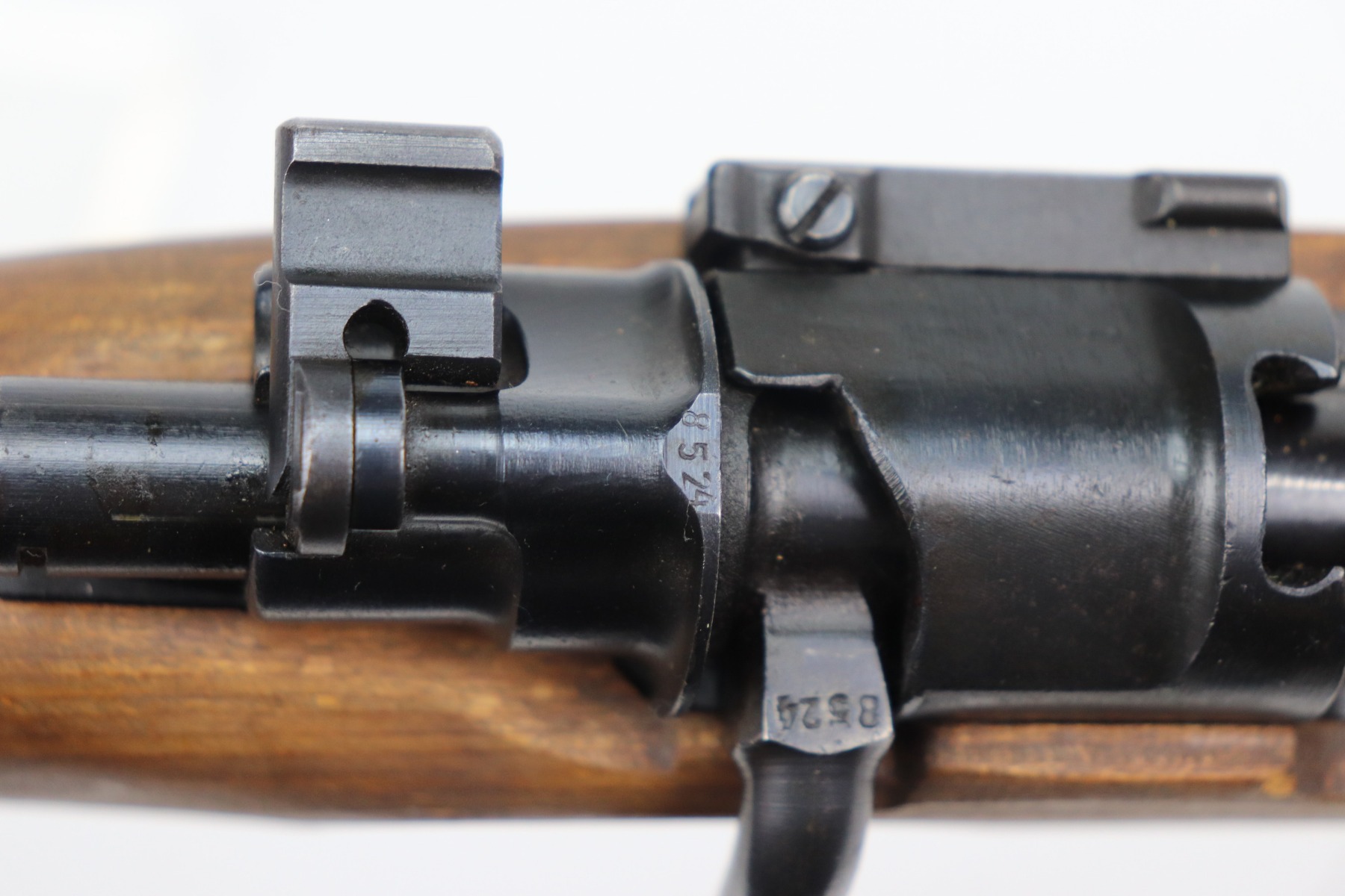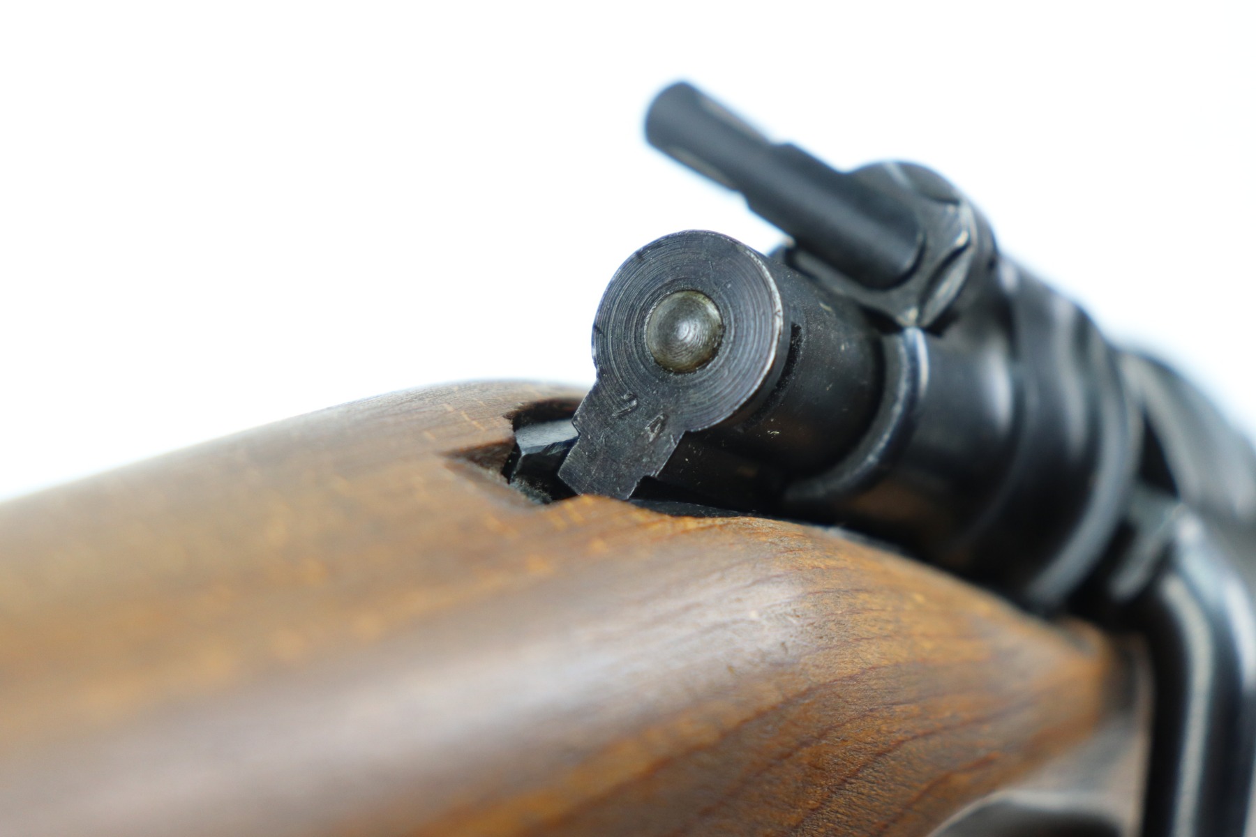 2/12/21 – This is a minty example of a Berlin Lubecker K98 issued to the Nazi military in 1944. All numbered parts are matching, some are un-numbered. Waffen proofs throughout. Two faint waffen proofs on the stock. The metal parts are minty, retaining almost all of their finish – just a couple of areas of spotty discoloration. The stock is excellent, but appears to have been lightly sanded. It looks like there is a repair below the handguard. The floor plate is Mauser marked. The bore is mint.