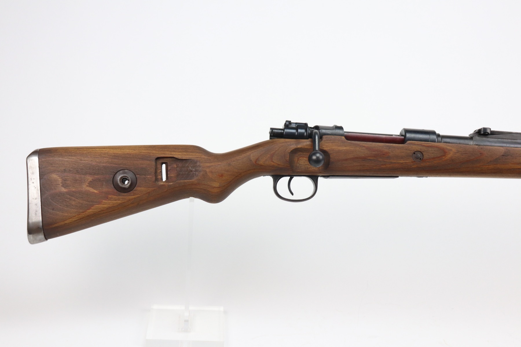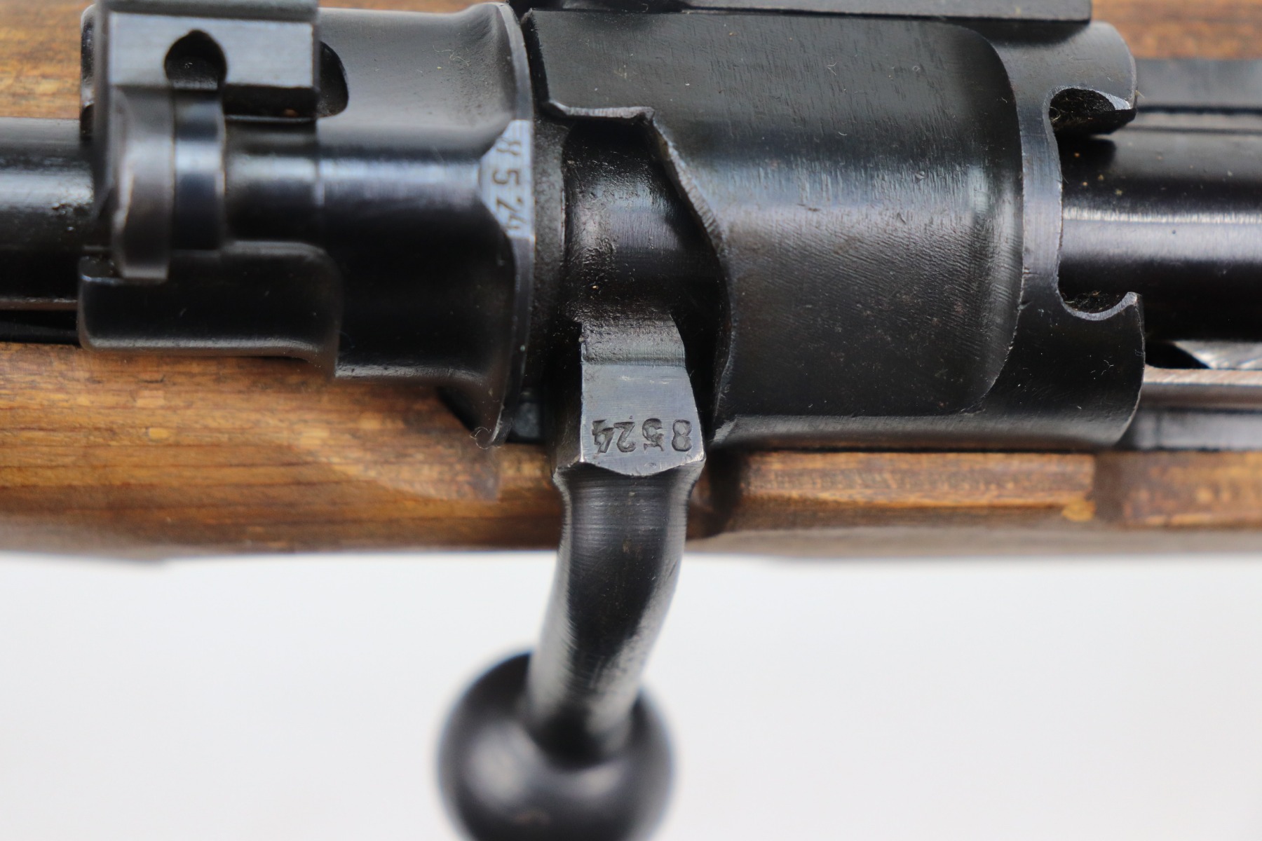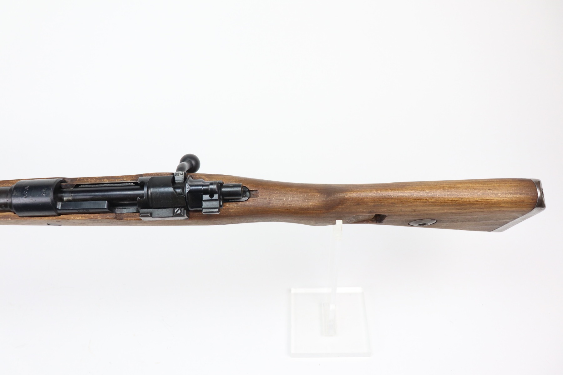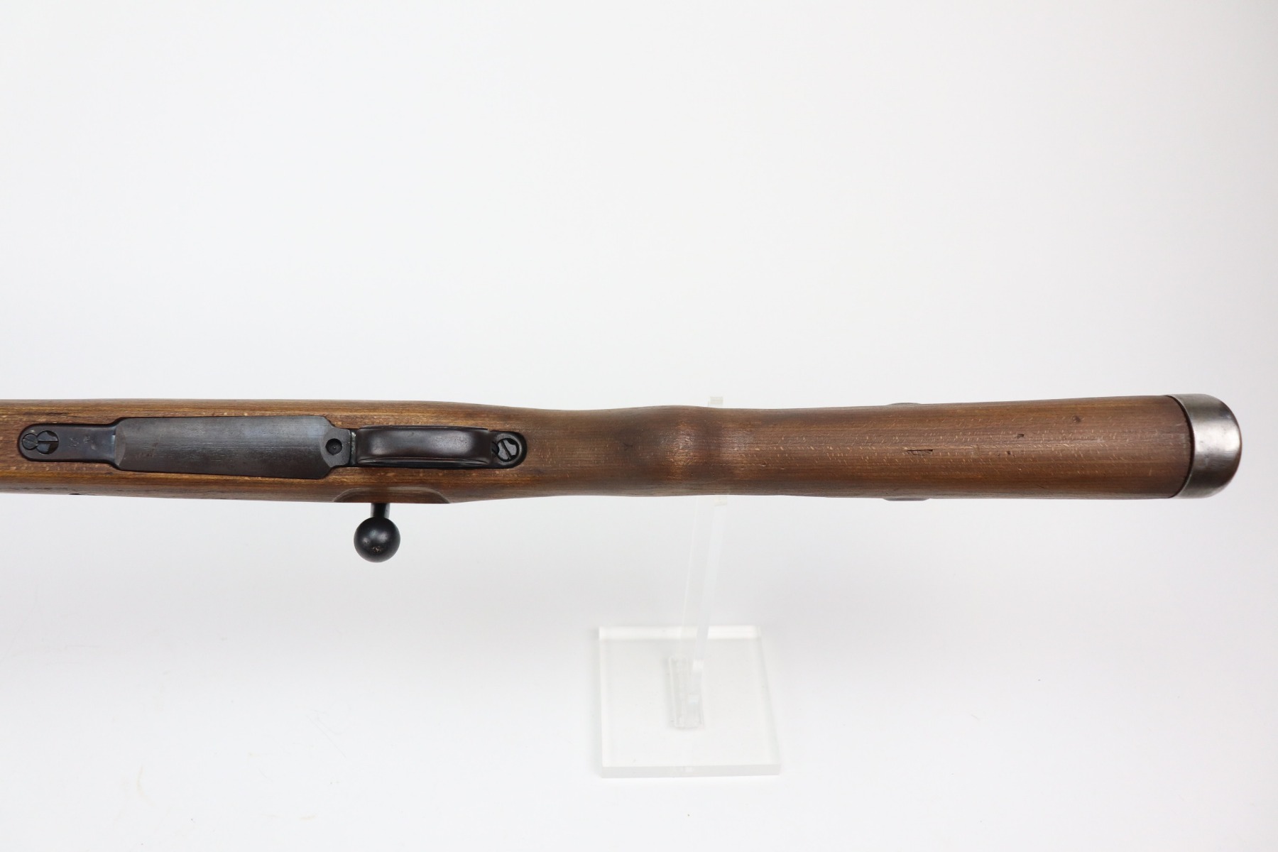 2/12/21 – This is a minty example of a Berlin Lubecker K98 issued to the Nazi military in 1944. All numbered parts are matching, some are un-numbered. Waffen proofs throughout. Two faint waffen proofs on the stock. The metal parts are minty, retaining almost all of their finish – just a couple of areas of spotty discoloration. The stock is excellent, but appears to have been lightly sanded. It looks like there is a repair below the handguard. The floor plate is Mauser marked. The bore is mint.