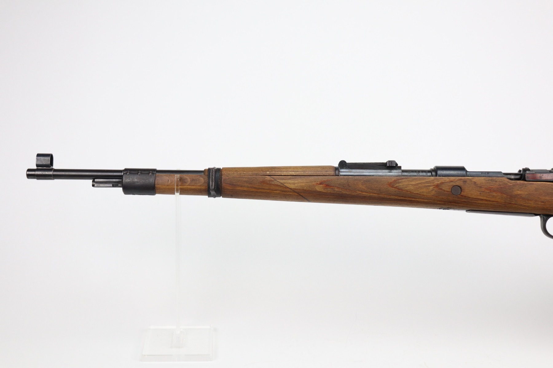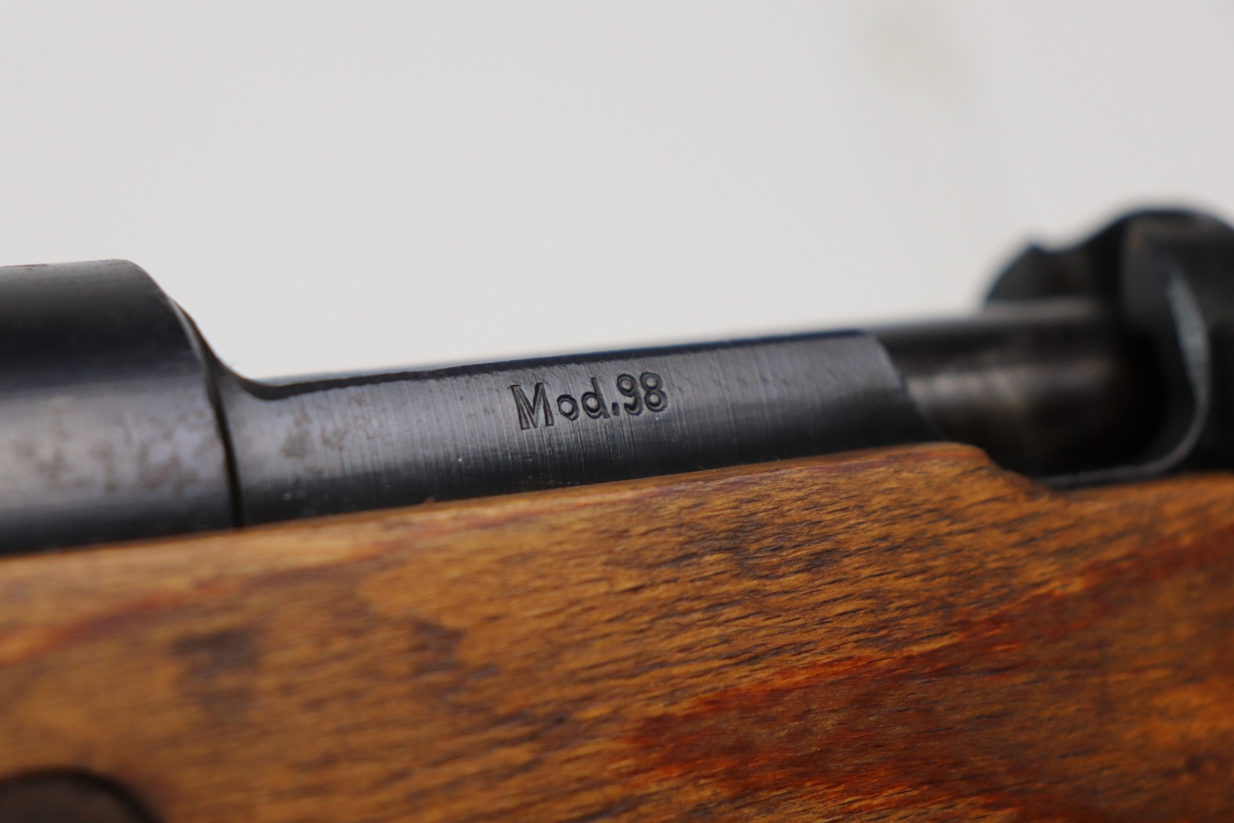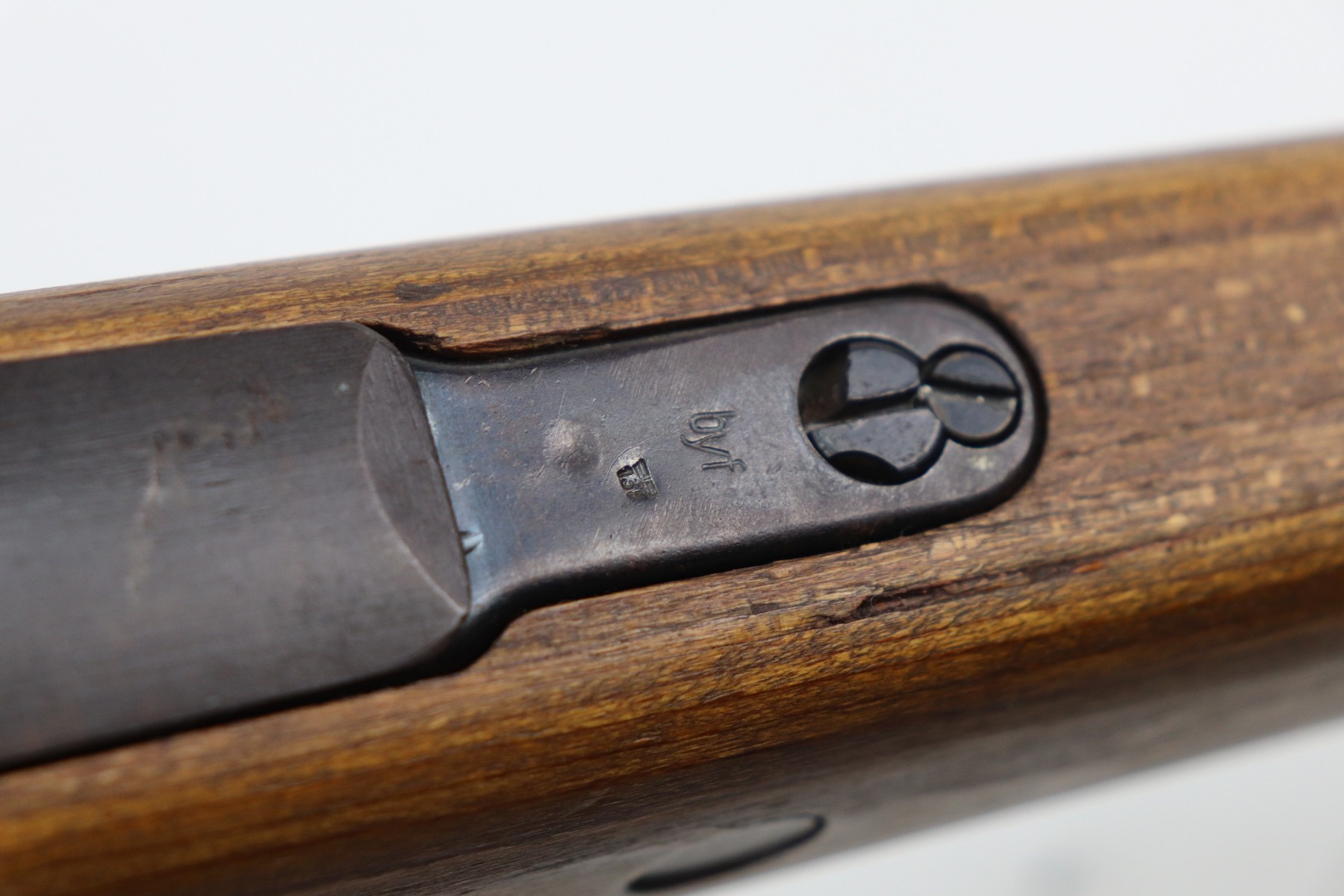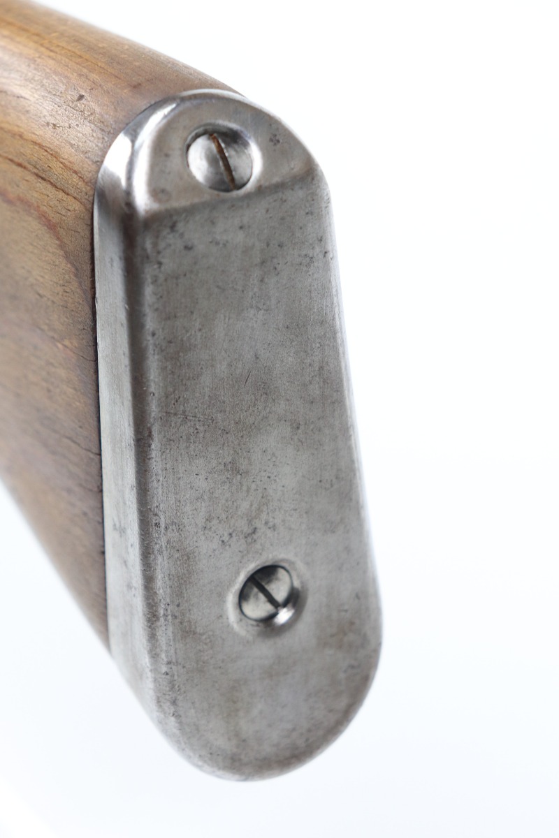 2/12/21 – This is a minty example of a Berlin Lubecker K98 issued to the Nazi military in 1944. All numbered parts are matching, some are un-numbered. Waffen proofs throughout. Two faint waffen proofs on the stock. The metal parts are minty, retaining almost all of their finish – just a couple of areas of spotty discoloration. The stock is excellent, but appears to have been lightly sanded. It looks like there is a repair below the handguard. The floor plate is Mauser marked. The bore is mint.