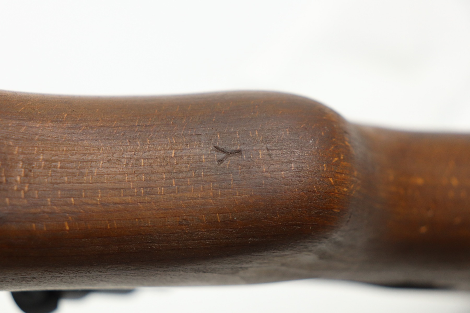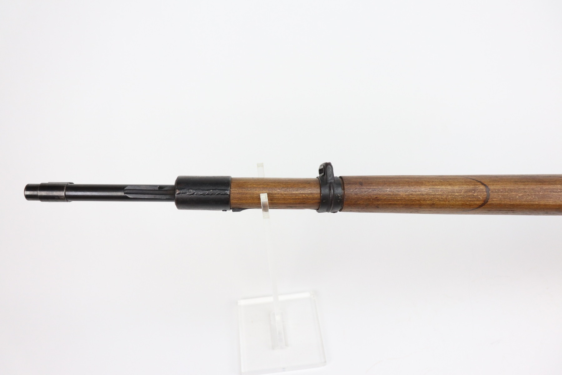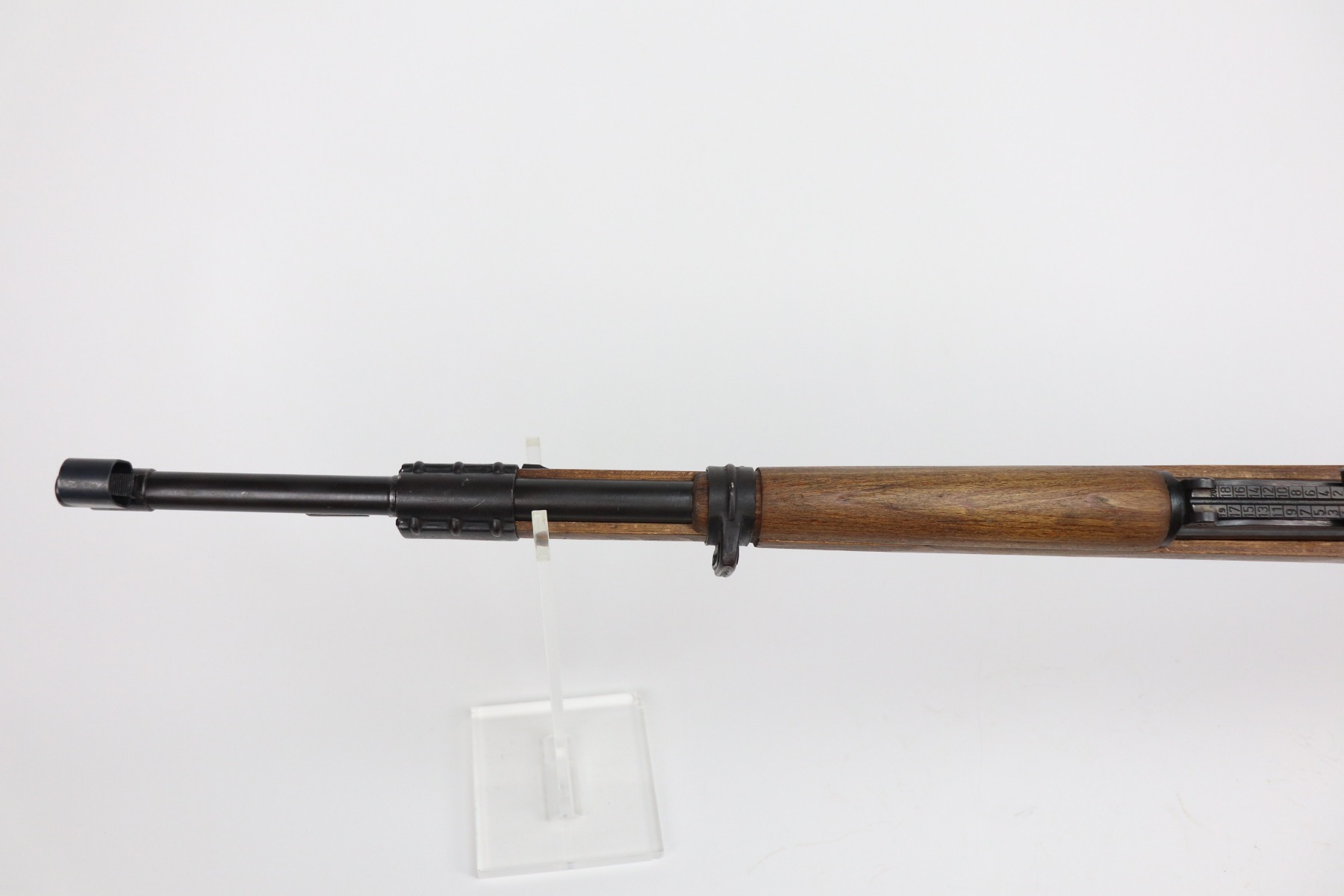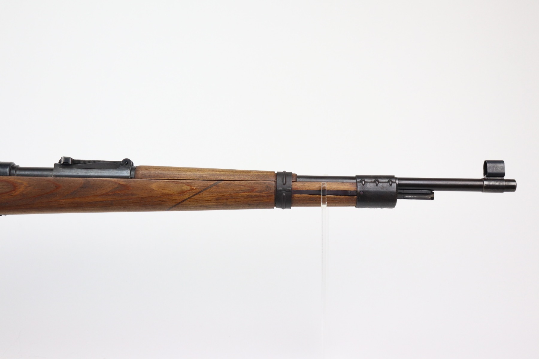 2/12/21 – This is a minty example of a Berlin Lubecker K98 issued to the Nazi military in 1944. All numbered parts are matching, some are un-numbered. Waffen proofs throughout. Two faint waffen proofs on the stock. The metal parts are minty, retaining almost all of their finish – just a couple of areas of spotty discoloration. The stock is excellent, but appears to have been lightly sanded. It looks like there is a repair below the handguard. The floor plate is Mauser marked. The bore is mint.