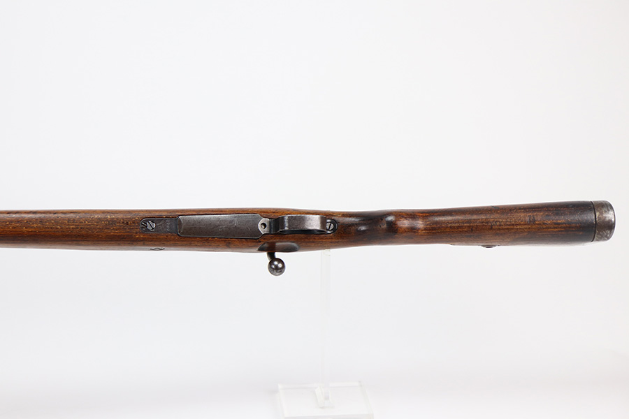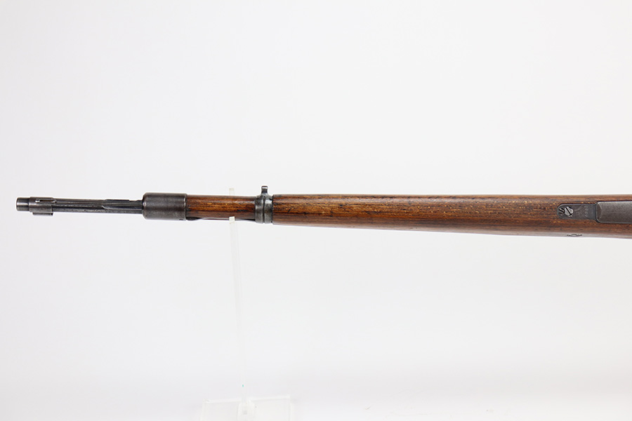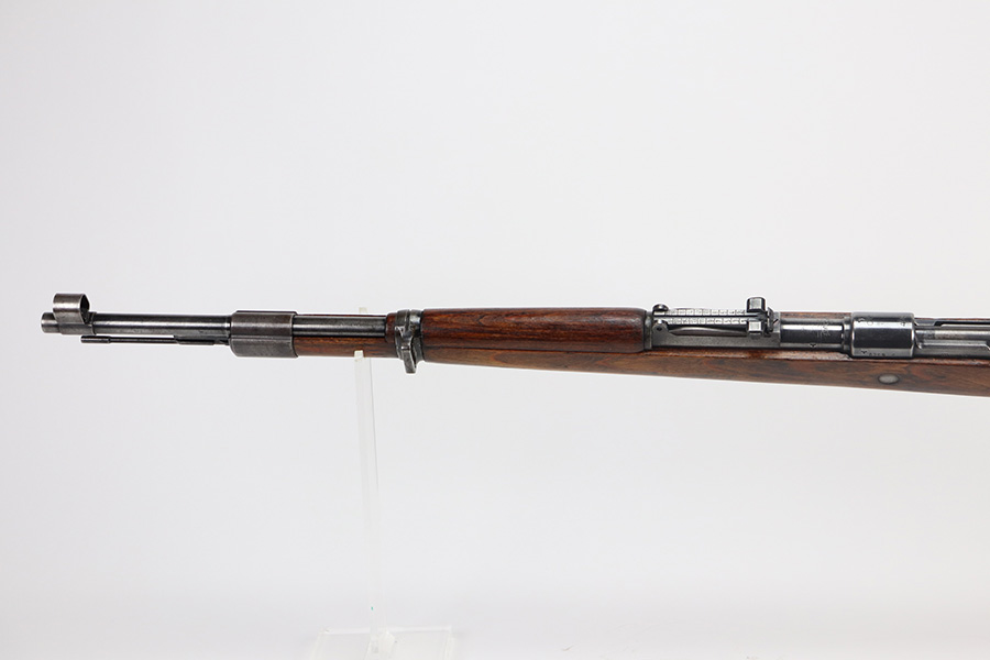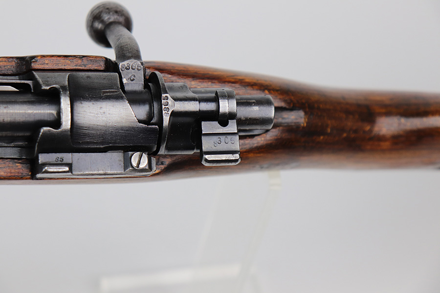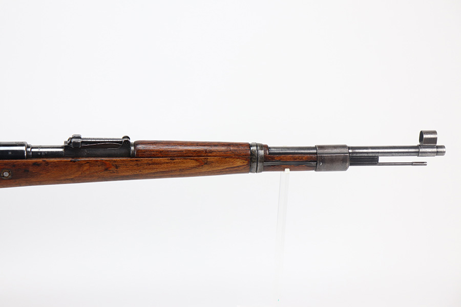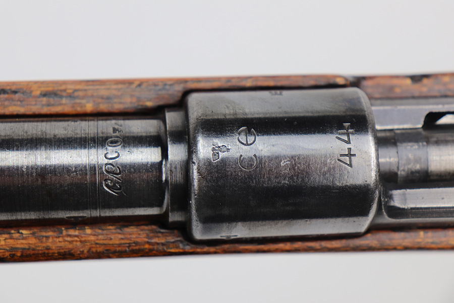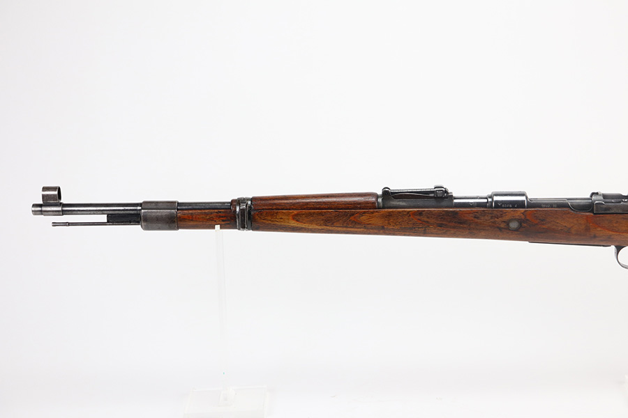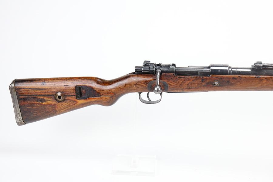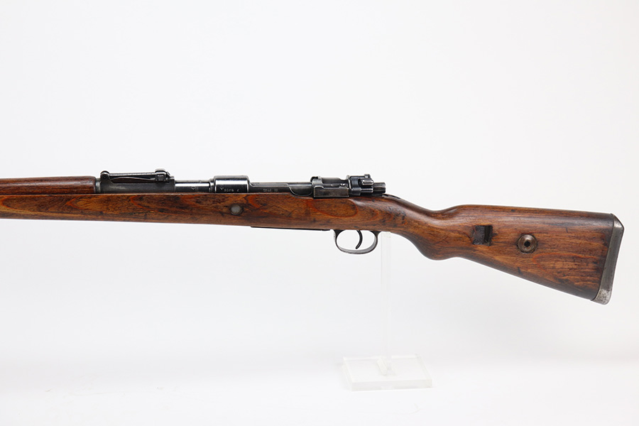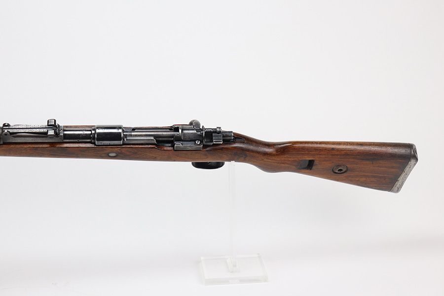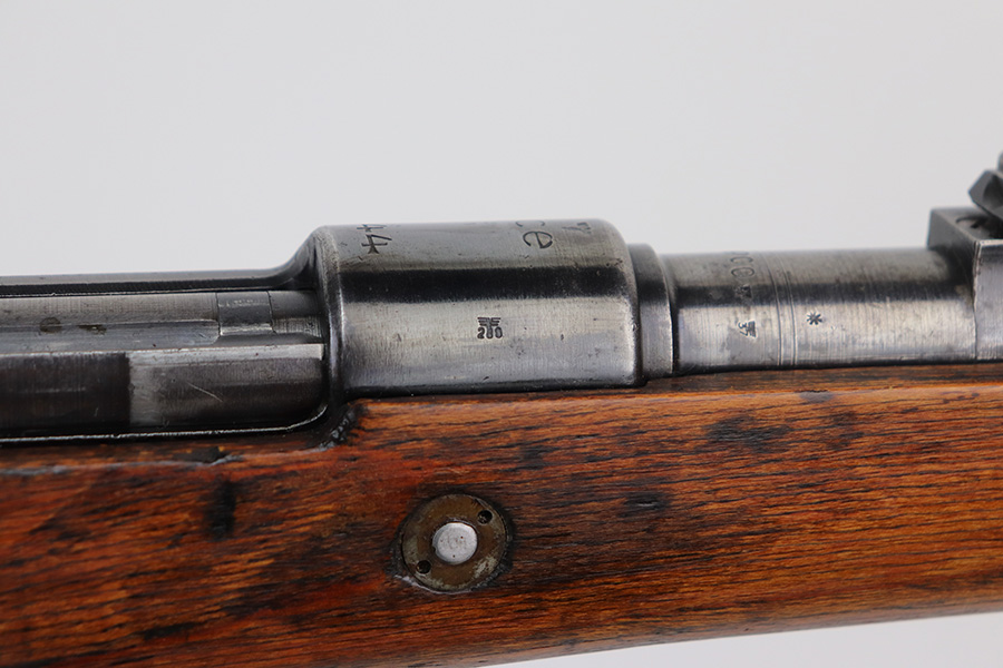 5/19/21 – This is a very nice example of a JP Sauer K98 rifle issued to the Nazi military in 1944. The gun is all matching and has the proper waffen proofs throughout, including a waffen proof on the right side of the butt stock. Overall, the gun is in very nice condition, but there is thinning in the bluing on the metal parts and spotty oxidation throughout. The stock is nice with minor dings here and there. It looks like a lacquer was applied at some point and mostly removed. The bore is excellent – shiny with strong rifling.