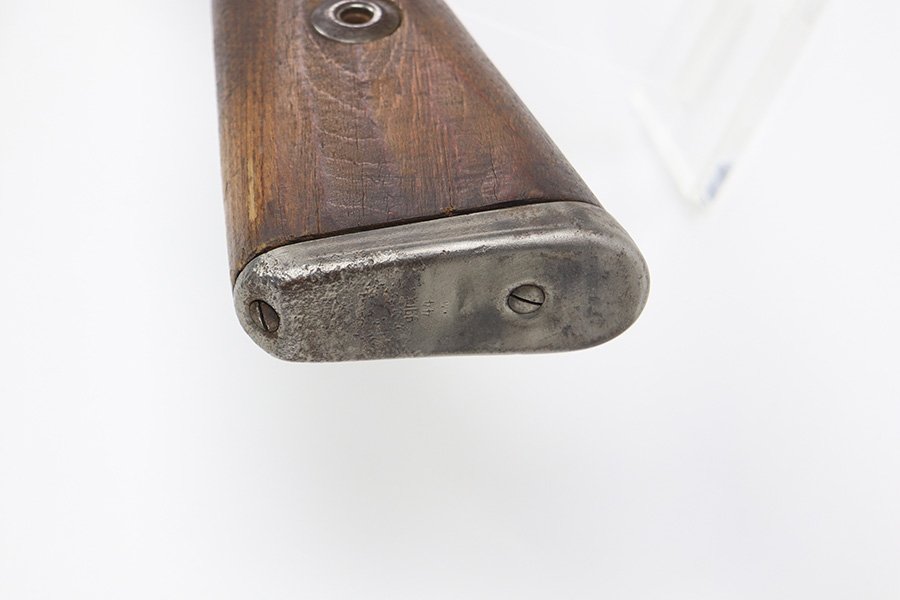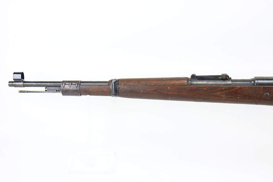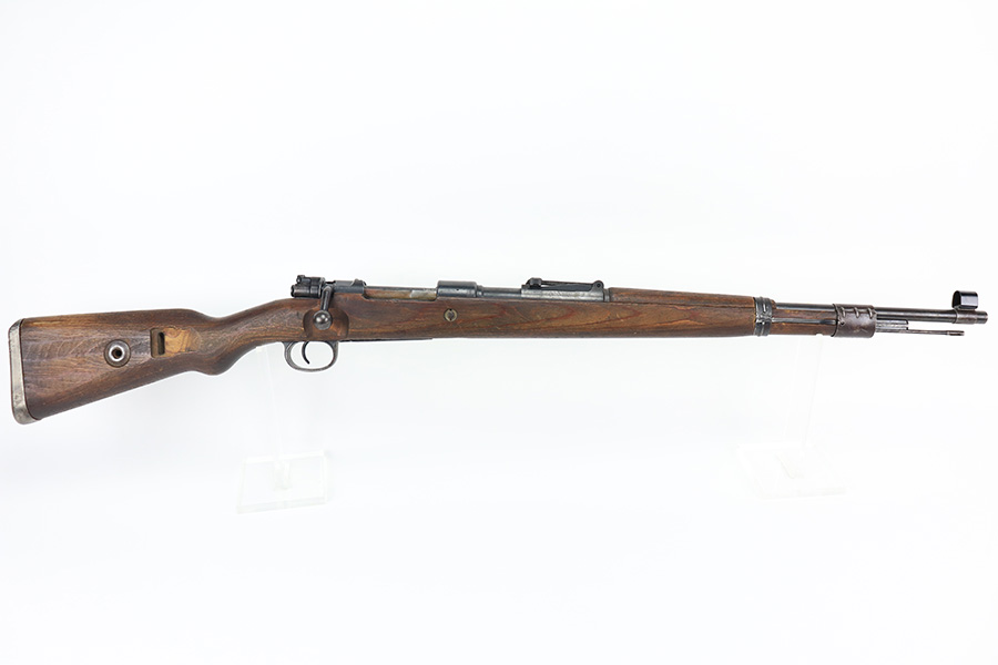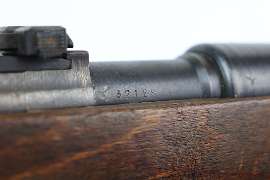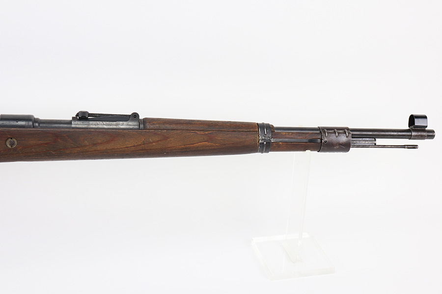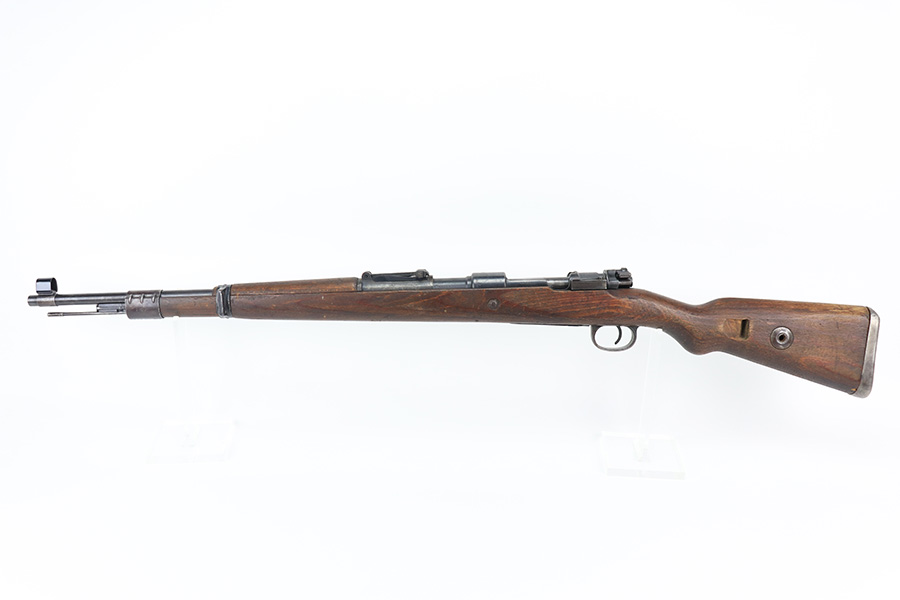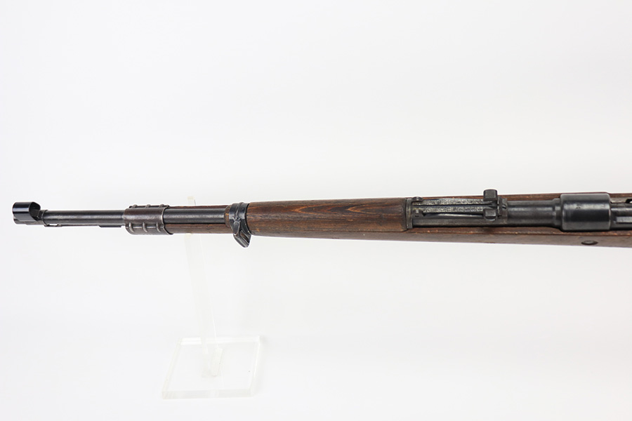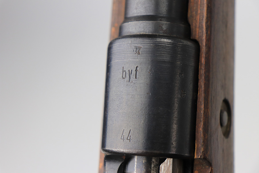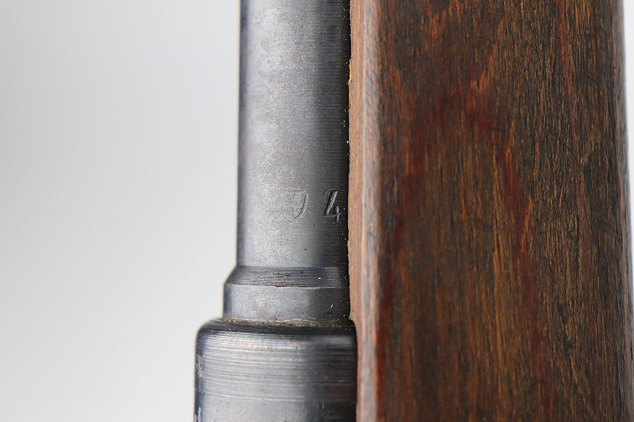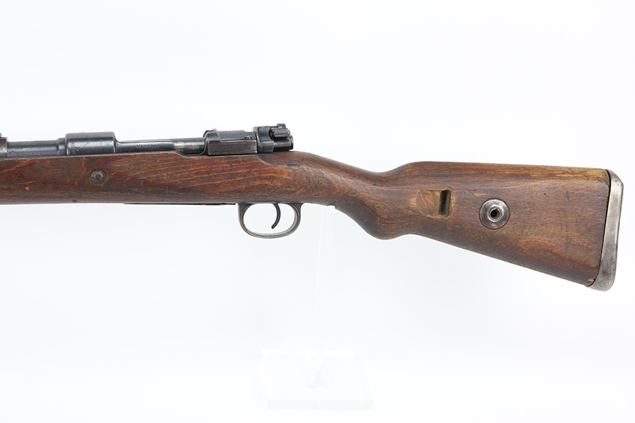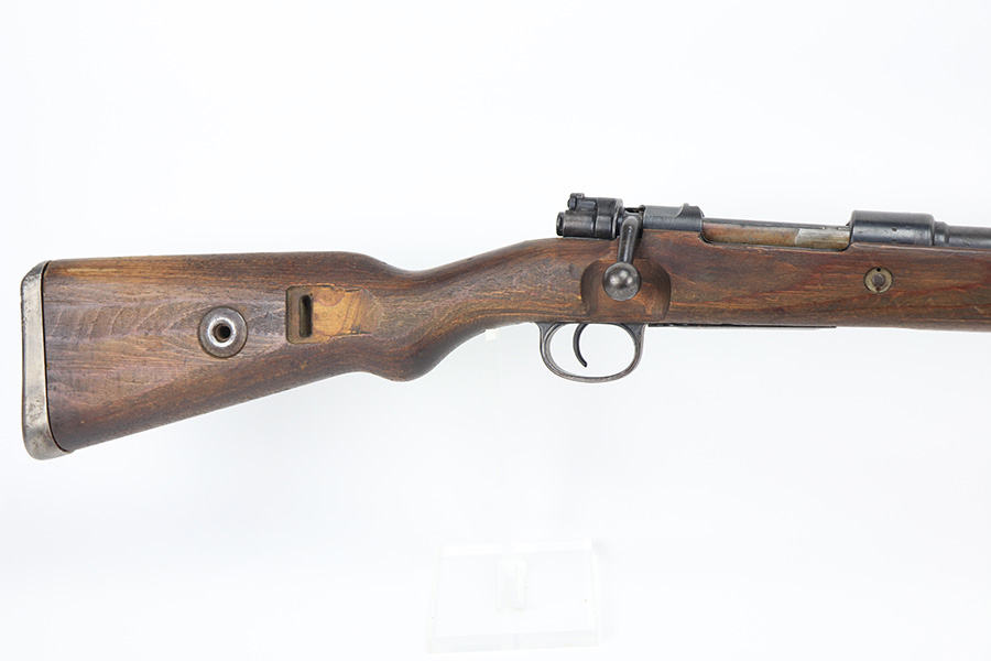 1/14/22 – This is a matching and original Mauser K98 from 1944. Numbers matching throughout, including bands, bolt assembly, trigger assembly, receiver. Finish shows patina in several areas, and most of the actual bluing loss on the barrel, bands and trigger group. The stock shows its age but has no major issues, and features a sharp waffenamt on the right side. Buttplate is ‘gqm’ marked with ’44 date, and features notable corrosion/rough pitting. Comes with cleaning rod and sight hood. Very good bore with minor frost throughout.