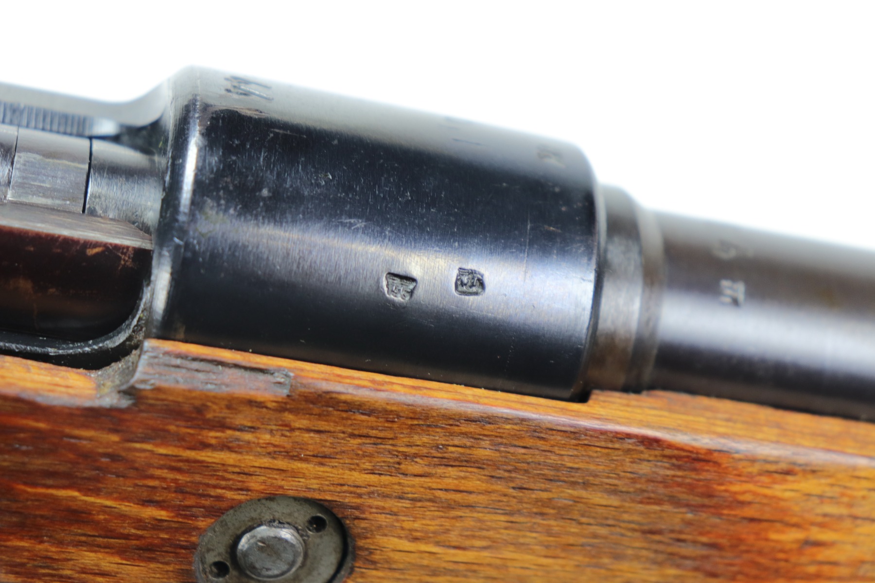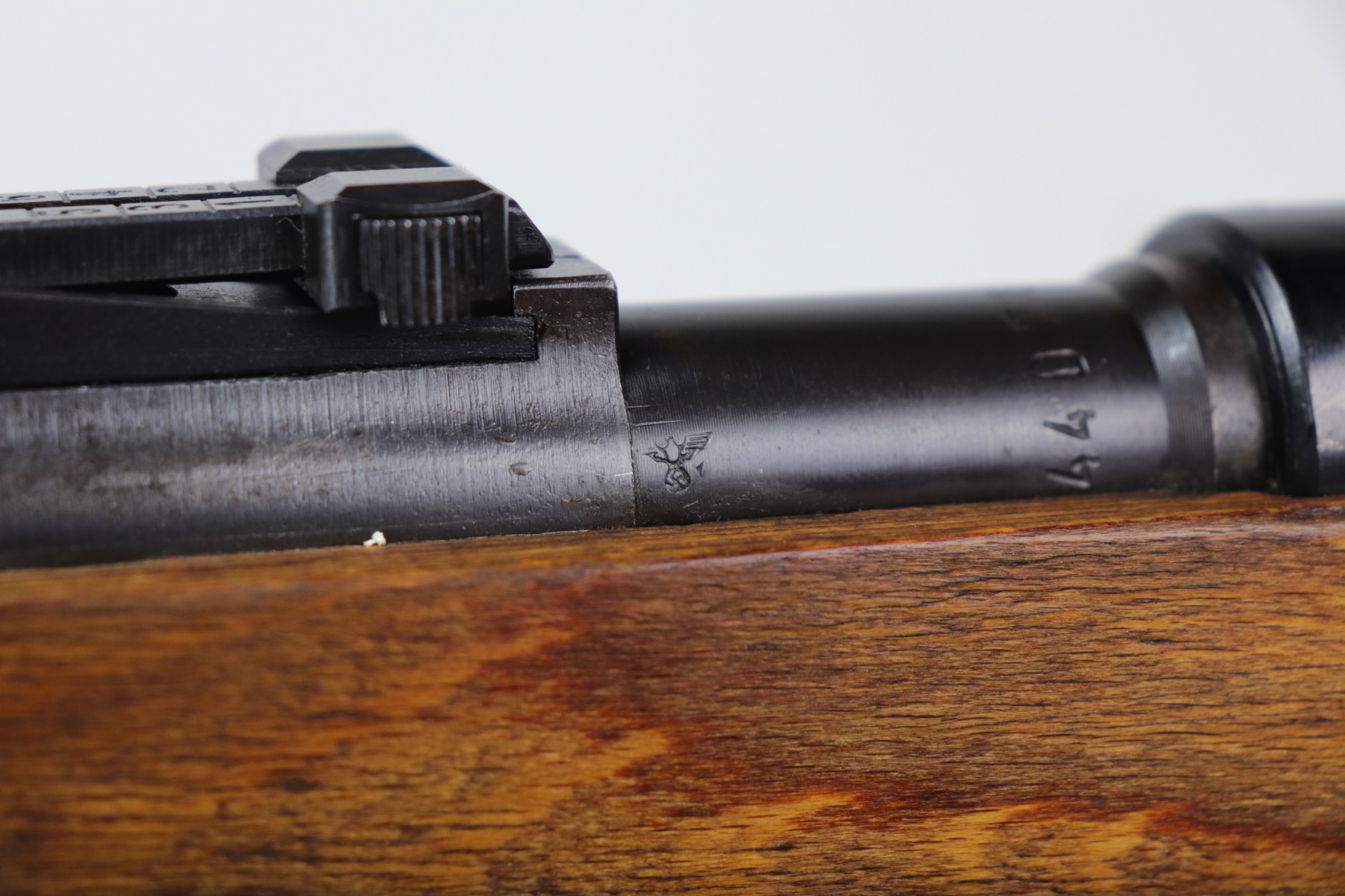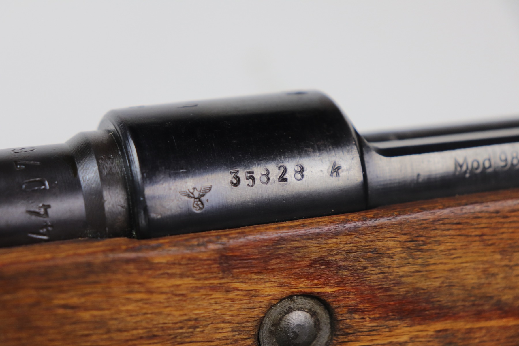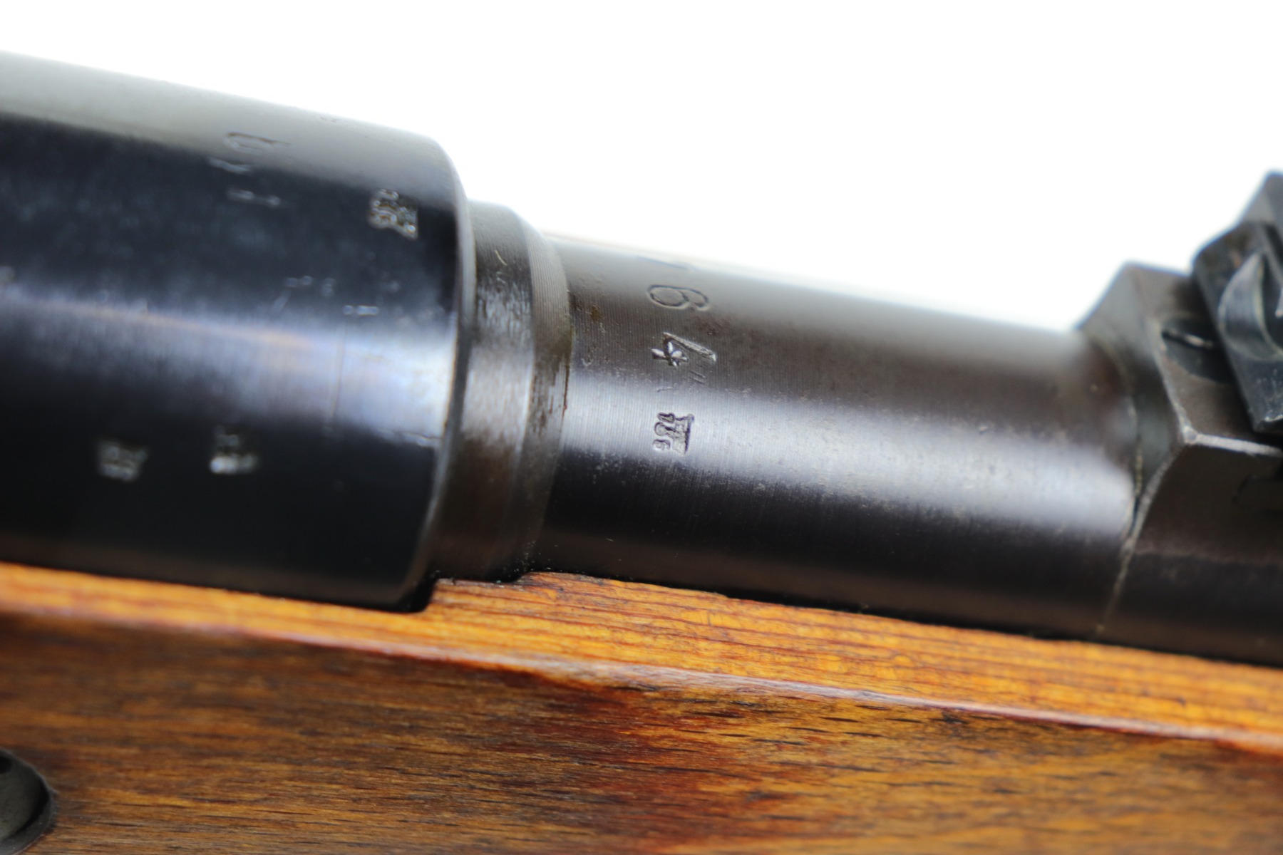 2/12/21 – This is an excellent example of a Mauser K98 Rifle issued to the Nazi military in 1944. All numbered parts are matching, some parts are not numbered. The gun comes with an original sling, cleaning rod, and sight hood. There are waffen proofs throughout. There are no proofs on the stock. Looks like it was lightly sanded. The metal parts are excellent condition, retaining almost all of their finish with areas of spotty oxidation here and there. The receiver may have been polished at some point. The stock is excellent – a couple of gouges on the underside. The bore is mint.