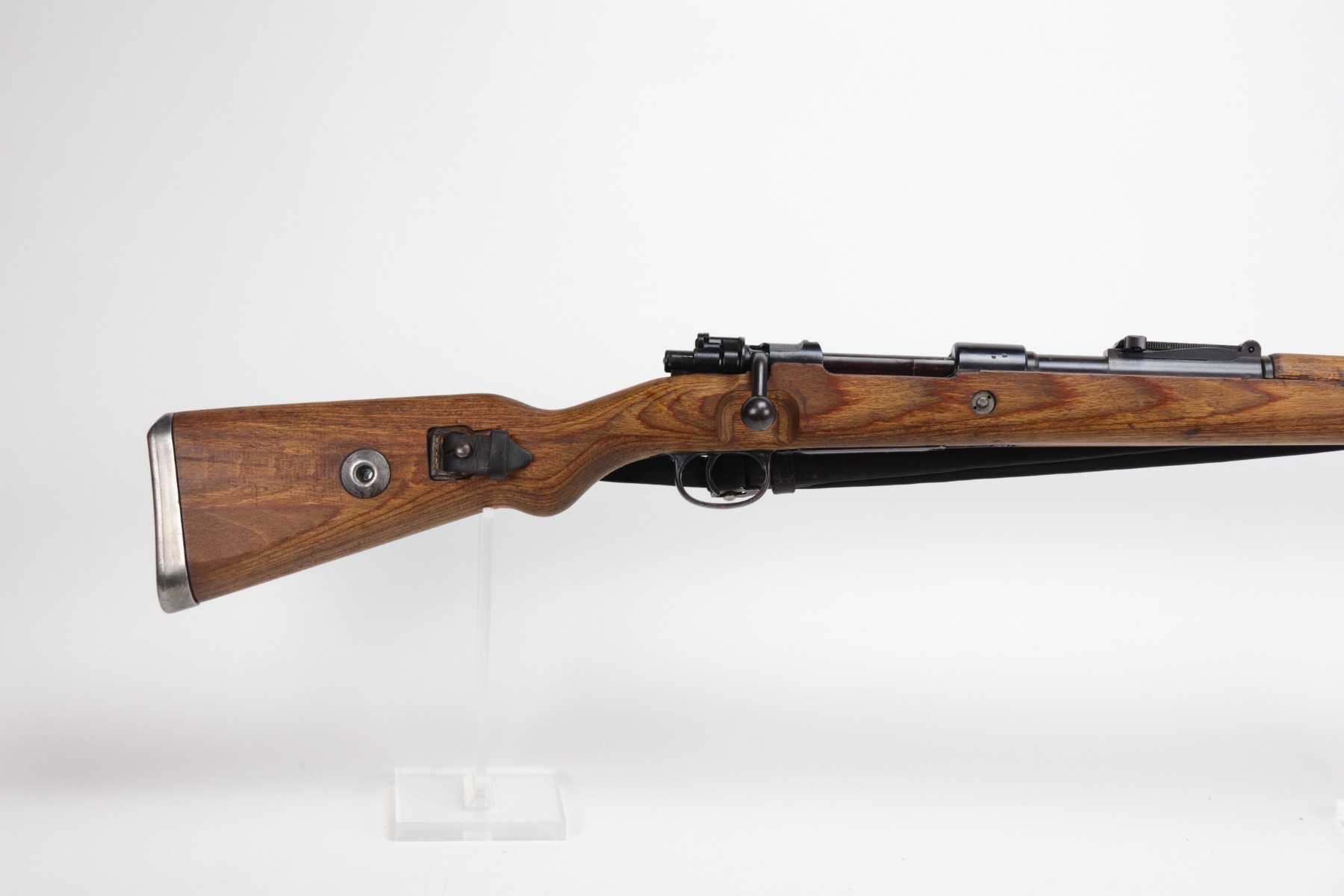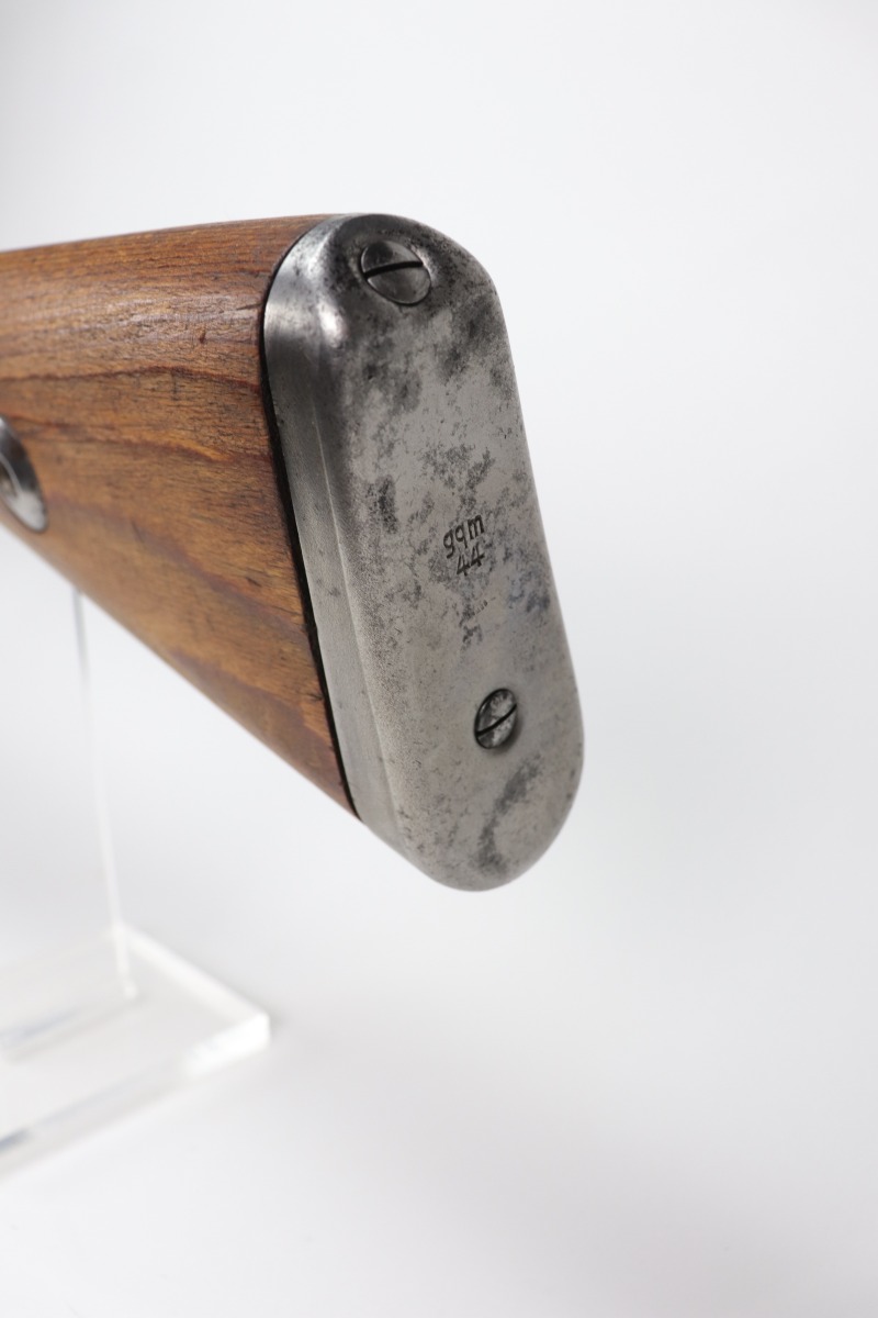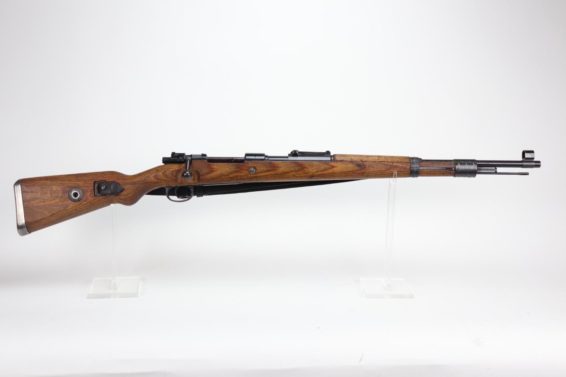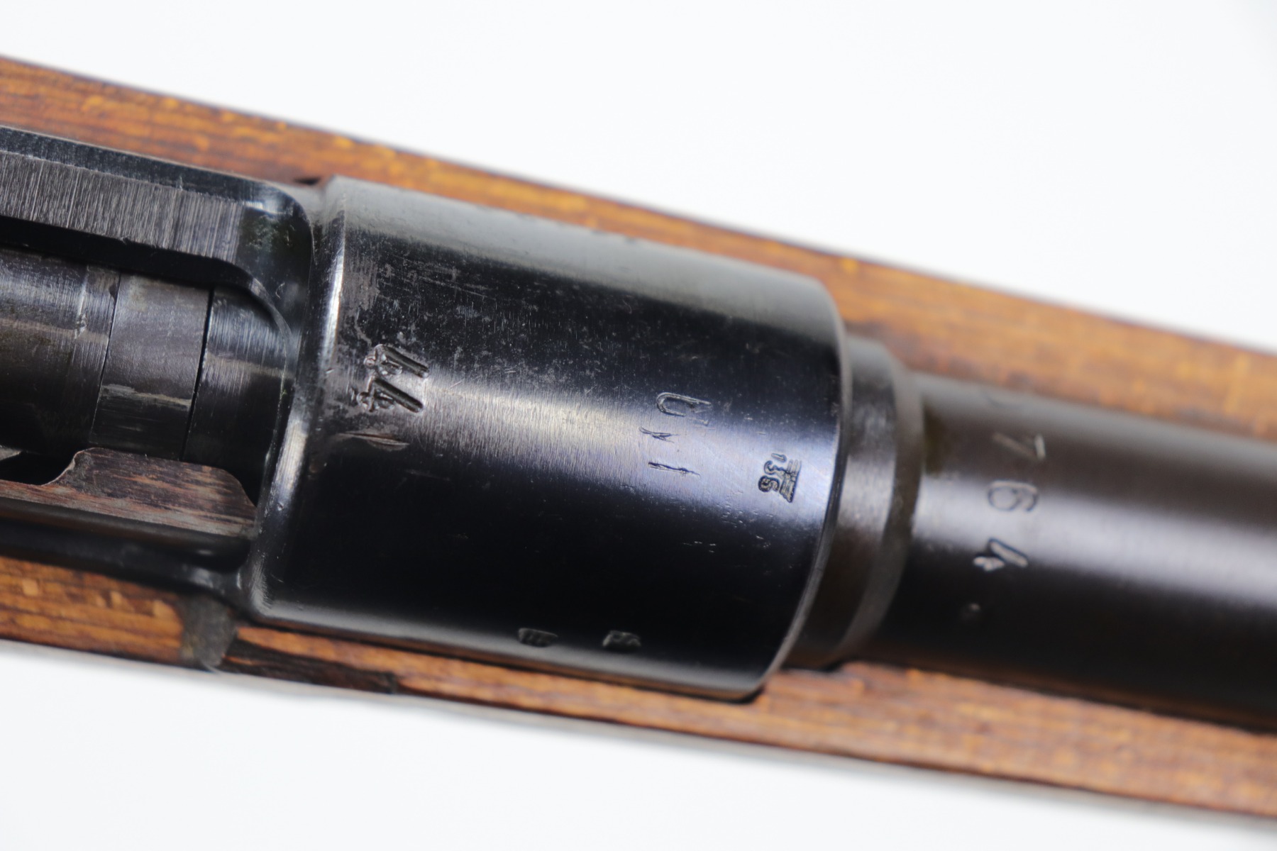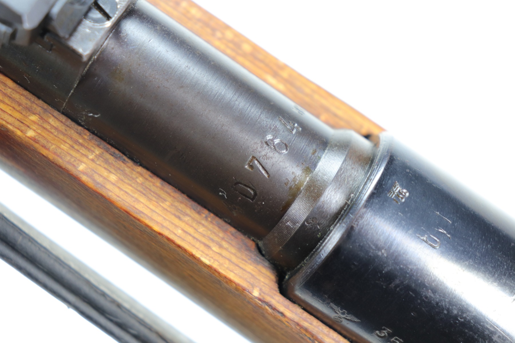 2/12/21 – This is an excellent example of a Mauser K98 Rifle issued to the Nazi military in 1944. All numbered parts are matching, some parts are not numbered. The gun comes with an original sling, cleaning rod, and sight hood. There are waffen proofs throughout. There are no proofs on the stock. Looks like it was lightly sanded. The metal parts are excellent condition, retaining almost all of their finish with areas of spotty oxidation here and there. The receiver may have been polished at some point. The stock is excellent – a couple of gouges on the underside. The bore is mint.
