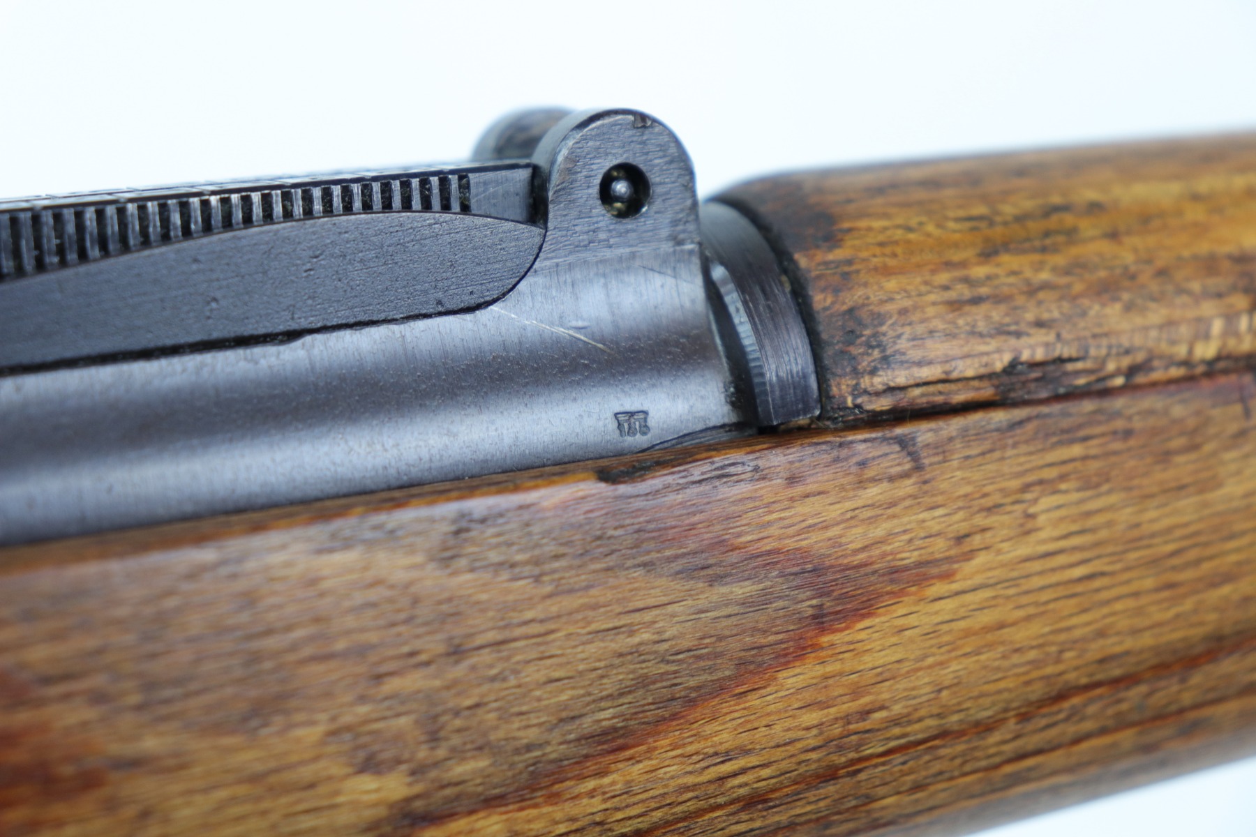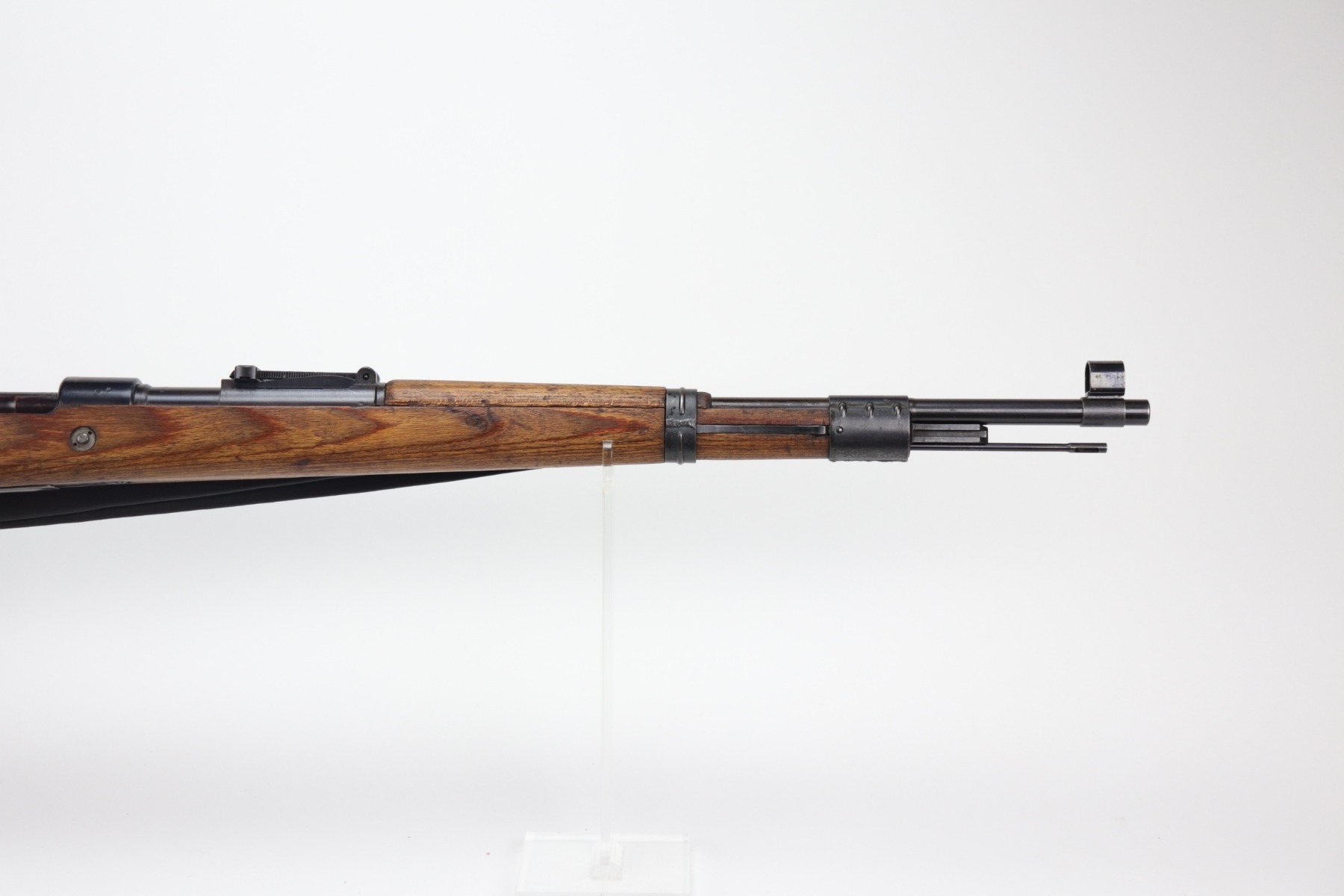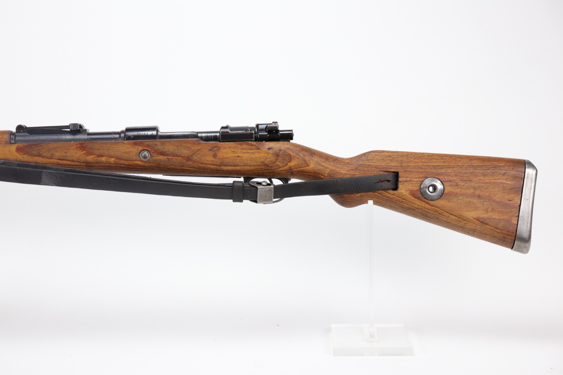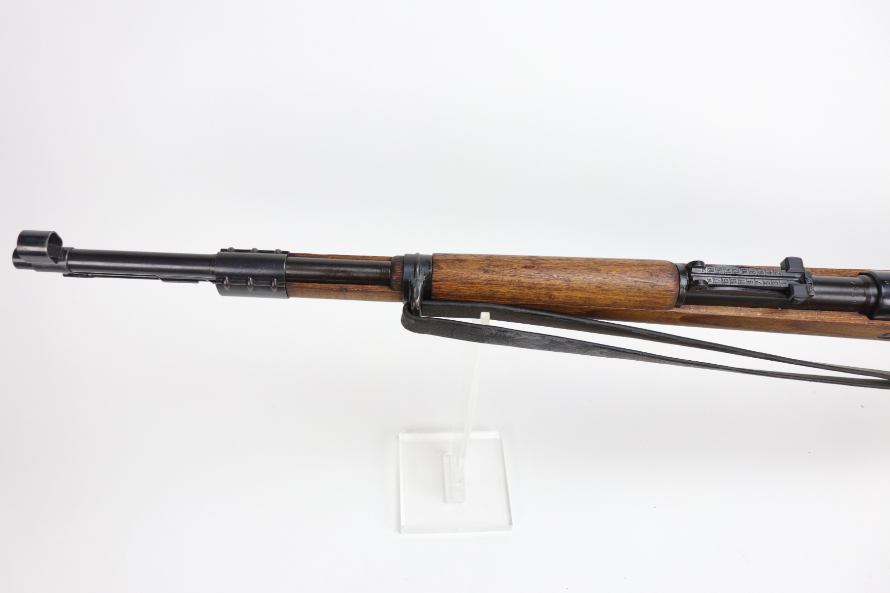 2/12/21 – This is an excellent example of a Mauser K98 Rifle issued to the Nazi military in 1944. All numbered parts are matching, some parts are not numbered. The gun comes with an original sling, cleaning rod, and sight hood. There are waffen proofs throughout. There are no proofs on the stock. Looks like it was lightly sanded. The metal parts are excellent condition, retaining almost all of their finish with areas of spotty oxidation here and there. The receiver may have been polished at some point. The stock is excellent – a couple of gouges on the underside. The bore is mint.