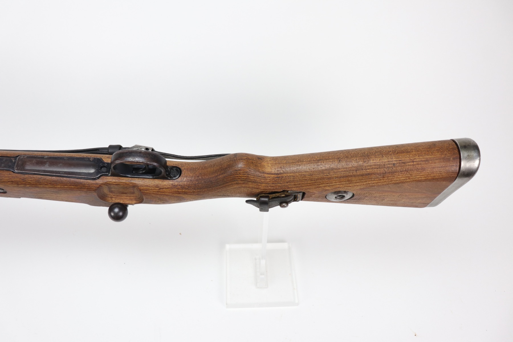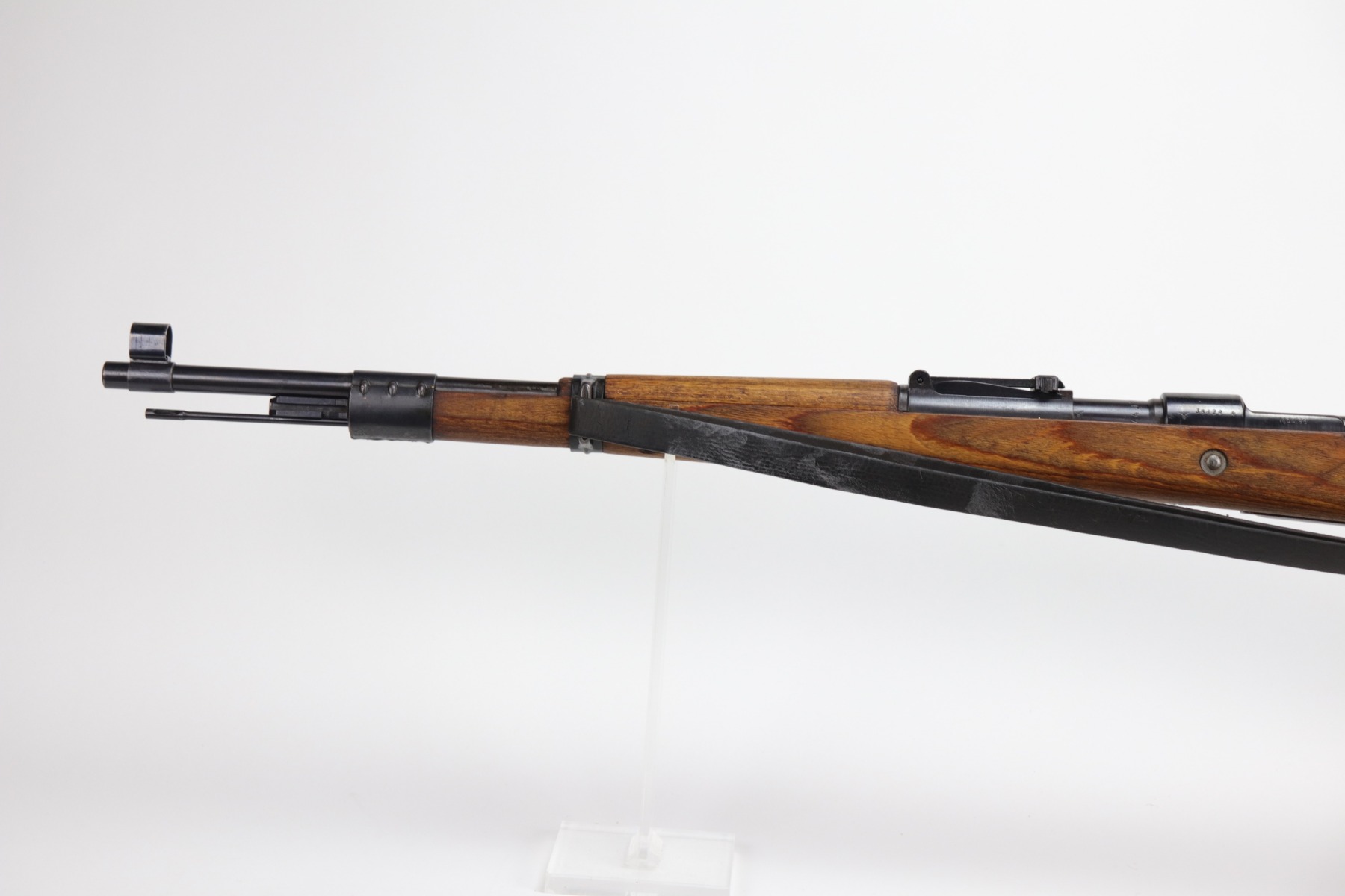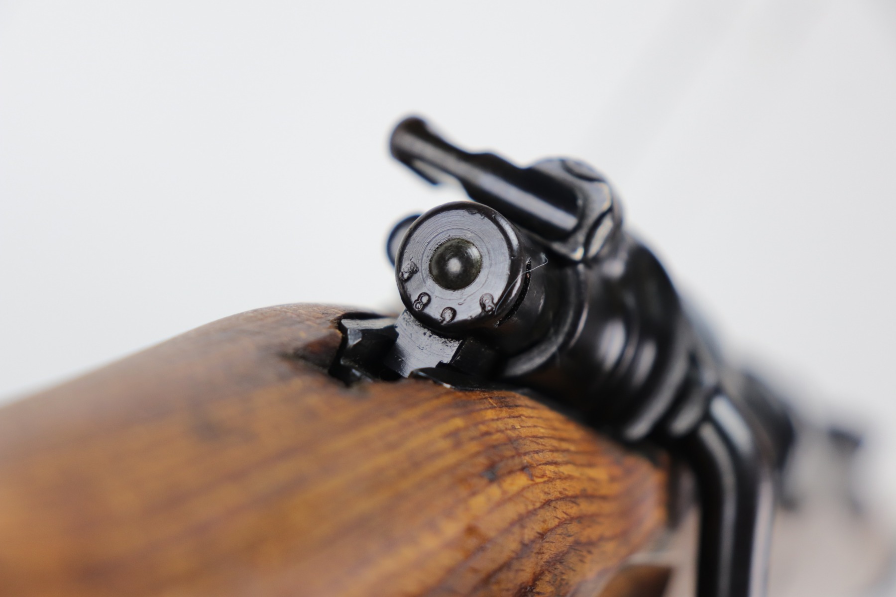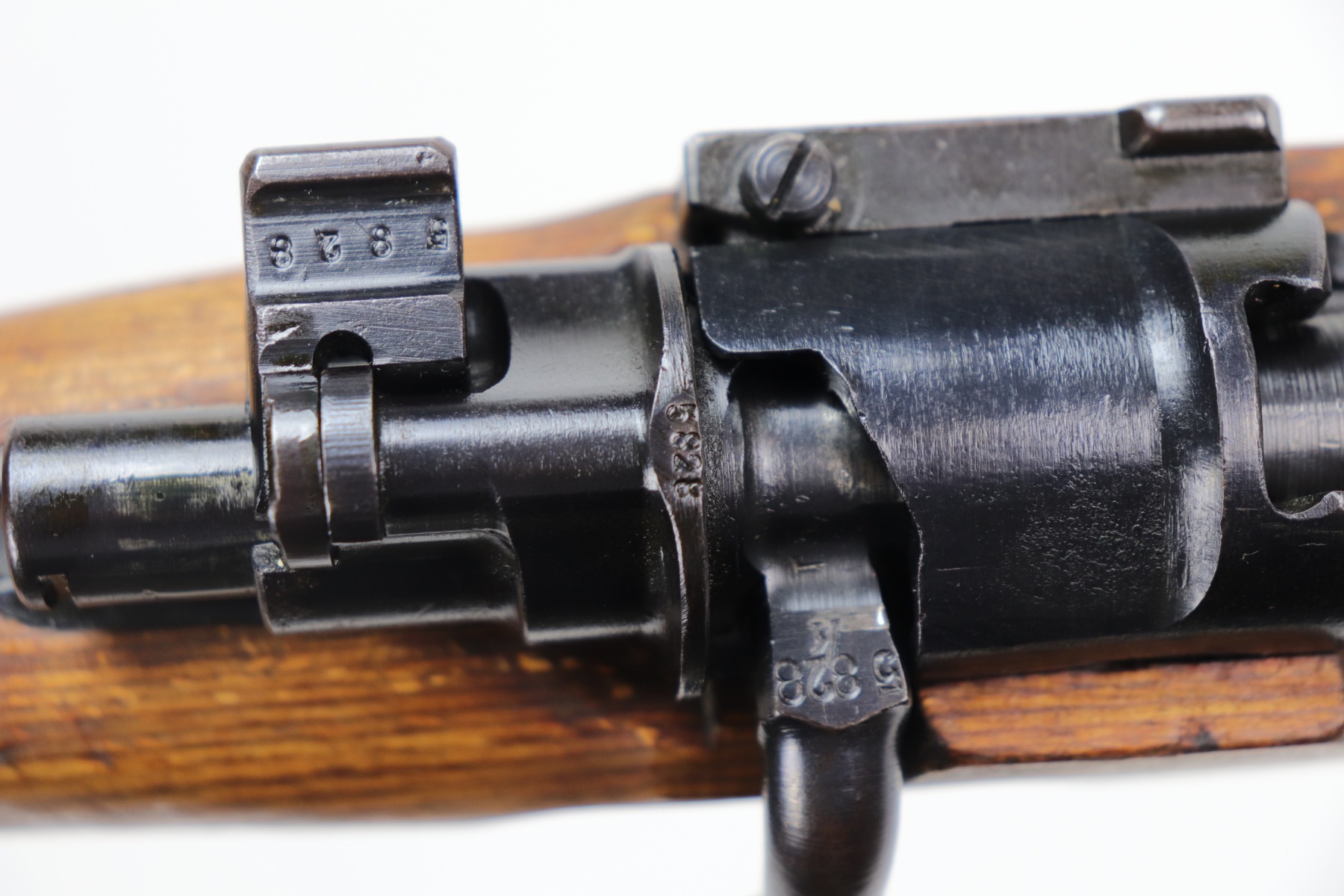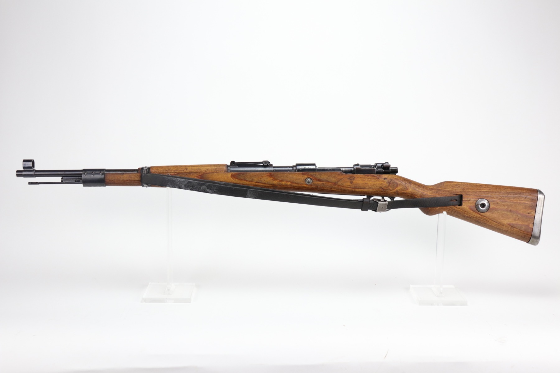 2/12/21 – This is an excellent example of a Mauser K98 Rifle issued to the Nazi military in 1944. All numbered parts are matching, some parts are not numbered. The gun comes with an original sling, cleaning rod, and sight hood. There are waffen proofs throughout. There are no proofs on the stock. Looks like it was lightly sanded. The metal parts are excellent condition, retaining almost all of their finish with areas of spotty oxidation here and there. The receiver may have been polished at some point. The stock is excellent – a couple of gouges on the underside. The bore is mint.