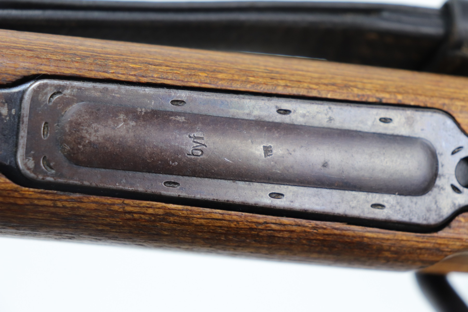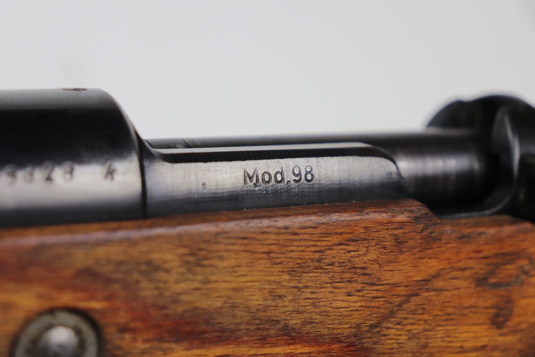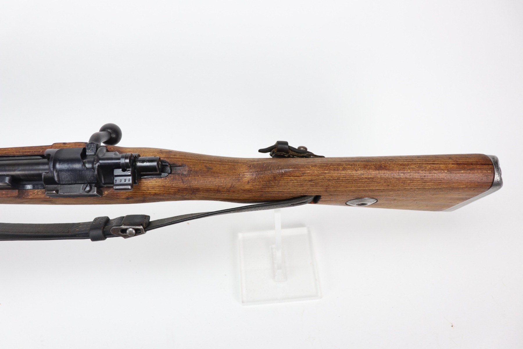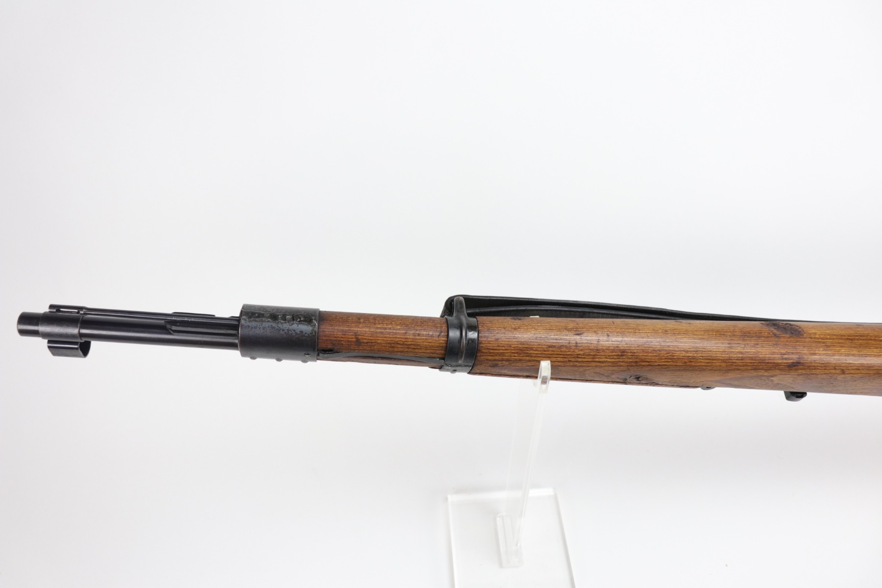 2/12/21 – This is an excellent example of a Mauser K98 Rifle issued to the Nazi military in 1944. All numbered parts are matching, some parts are not numbered. The gun comes with an original sling, cleaning rod, and sight hood. There are waffen proofs throughout. There are no proofs on the stock. Looks like it was lightly sanded. The metal parts are excellent condition, retaining almost all of their finish with areas of spotty oxidation here and there. The receiver may have been polished at some point. The stock is excellent – a couple of gouges on the underside. The bore is mint.
