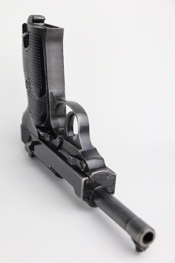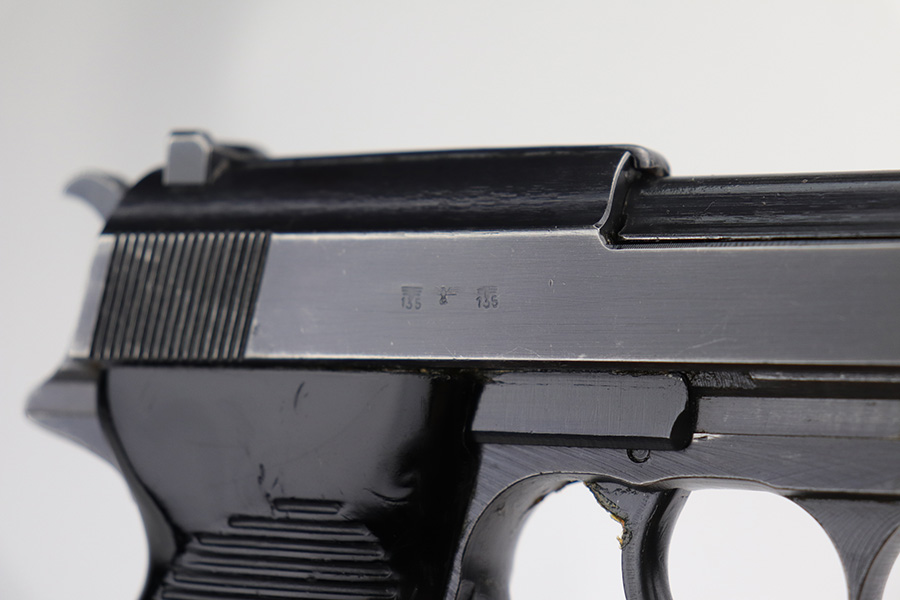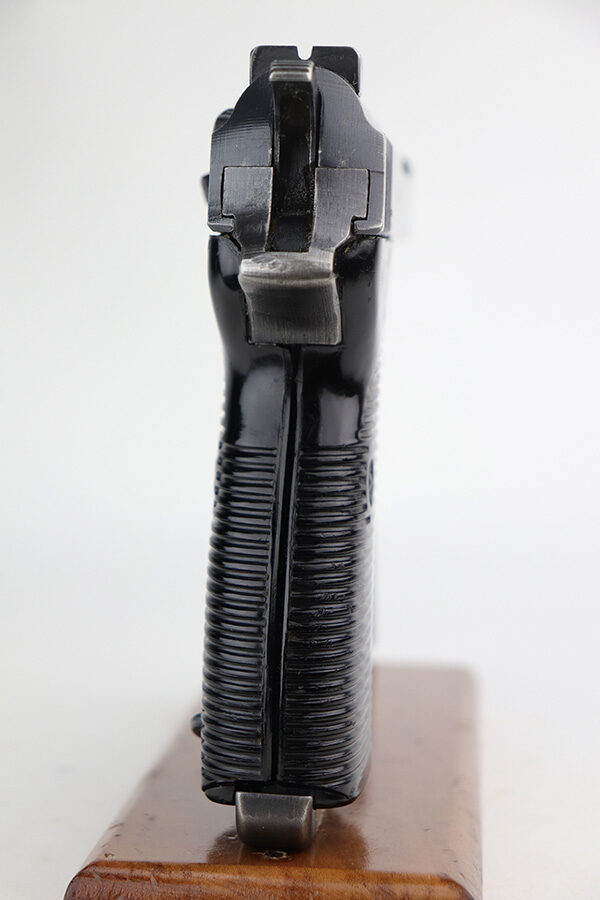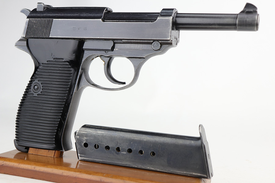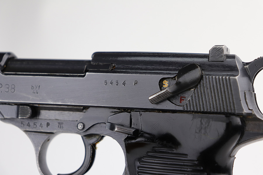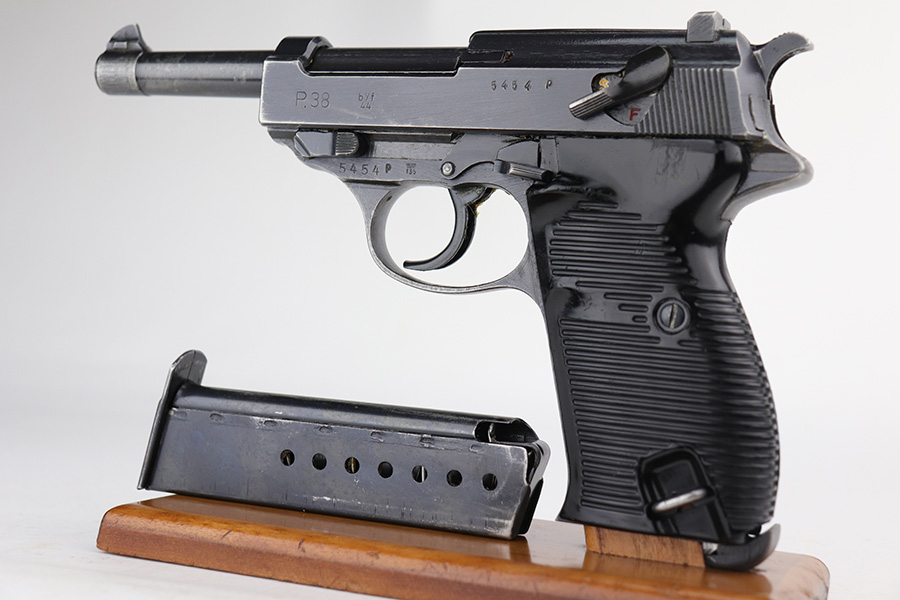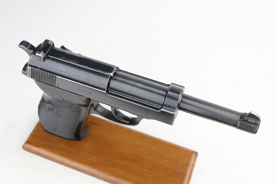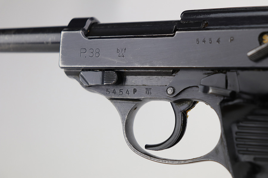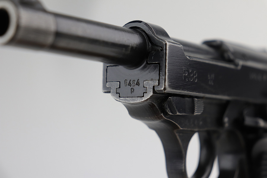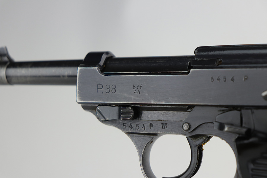 10/4/21 – This is a very nice example of a Mauser P.38 issued to the Nazi military in 1944. It is all matching and has the proper “Eagle 135” military acceptance proofs. It has retained roughly 85% of its original finish. There is very minor thinning on the underside of the frame and on the front strap. Minor wear around the high edges of the slide. There is noticeable spotty wear on the barrel and around the muzzle. There are some very light scratches on both sides of the slide. It comes with nice grips that look like they’ve been cut down. There are some small dings and scuffs here and there, especially on the left side. Also comes with an un-marked magazine. Minty bore. De-cocker is functional.