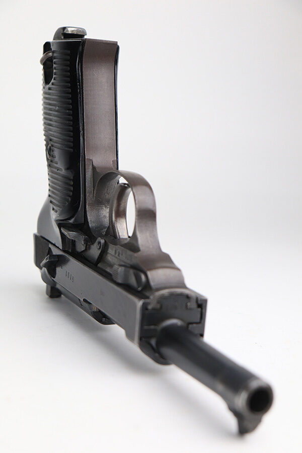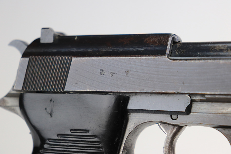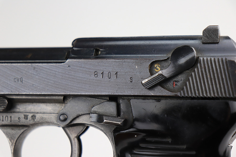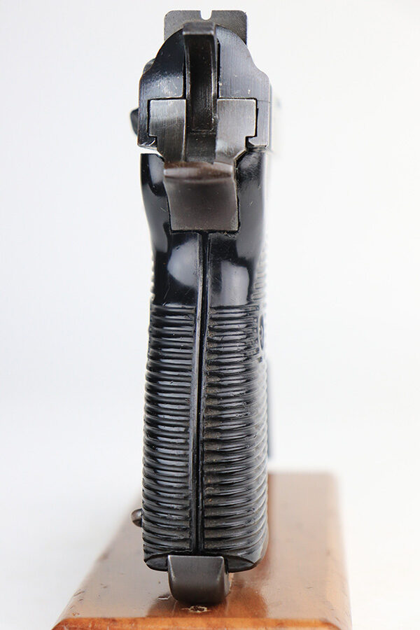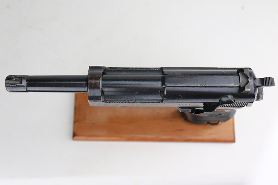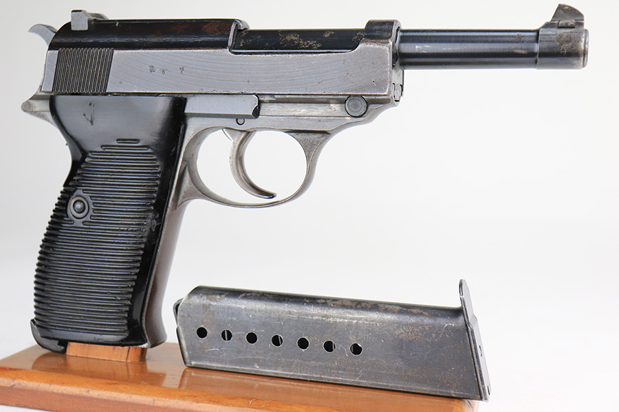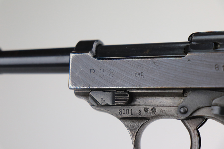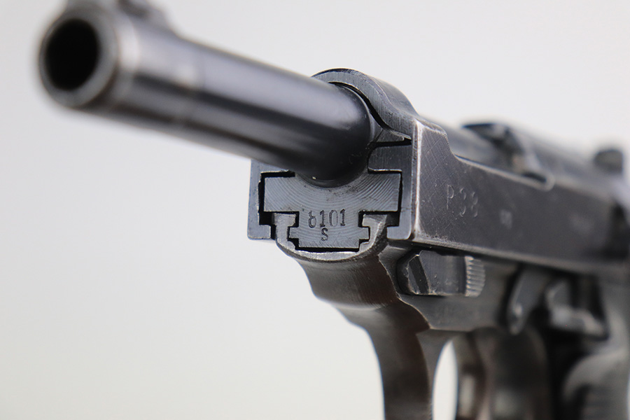 12/8/21 – This is a very nice example of a Spreewerk P.38 issued to the Nazi military in July of 1944. It is all matching and has the proper “Eagle 88” Nazi military acceptance proofs throughout. There is an asterisk marking on the left side of the frame, indicating it failed initial inspection and was sent back to the factory for repair. It has retained about 94-95% of its finish. There is minor wear on the high edges of the slide and around the muzzle. While there is not much actual finish loss, there are areas of spotty discoloration, patina, and some very pitting along the top of the slide and barrel. There is brown patina on the front strap and right side of the slide. Comes with nice black bakelite grips (the left panel has been cut down, right panel has a few dings and scratches) and a period-correct Spreewerk magazine. The bore is near-mint – shiny with strong rifling. De-cocker is functional.