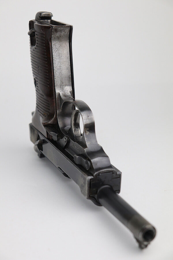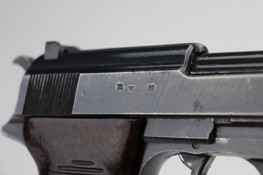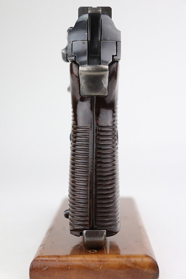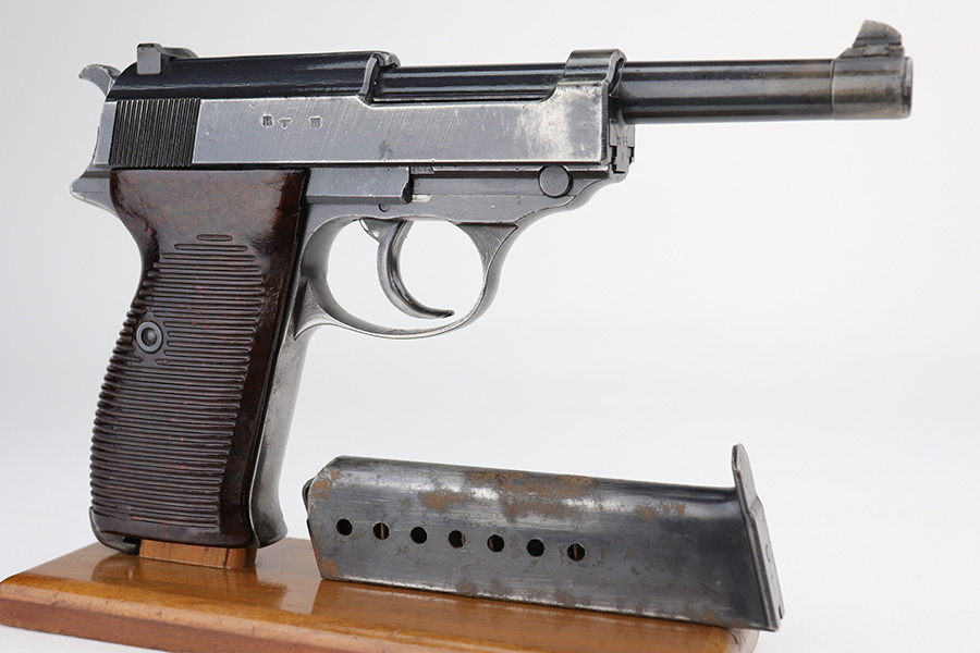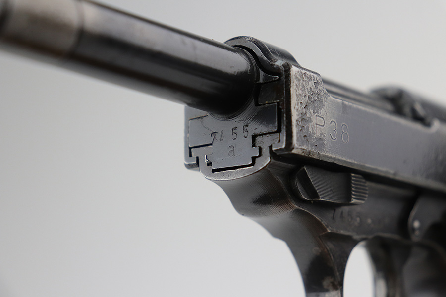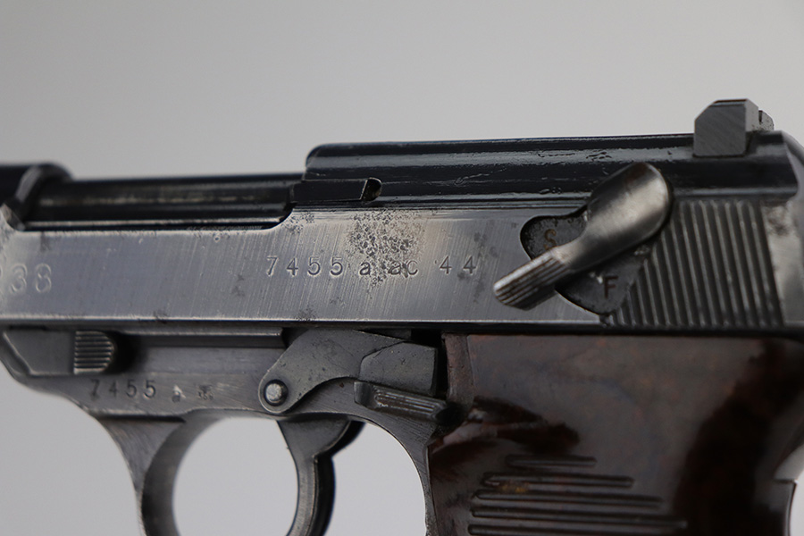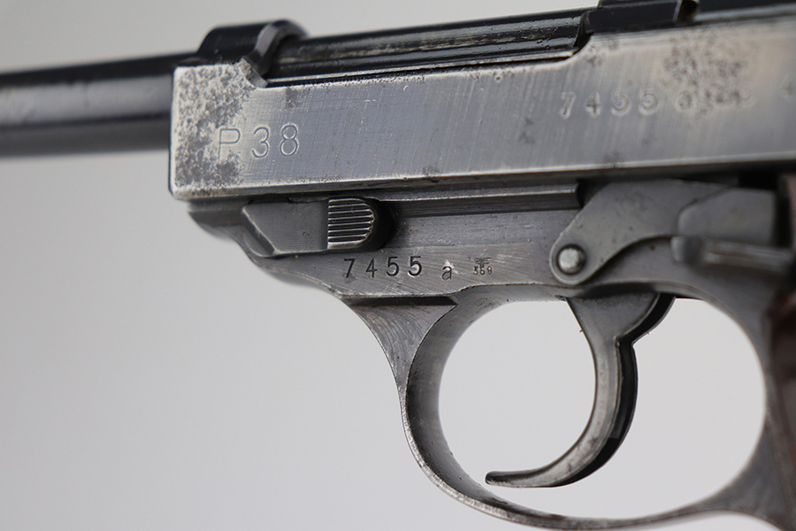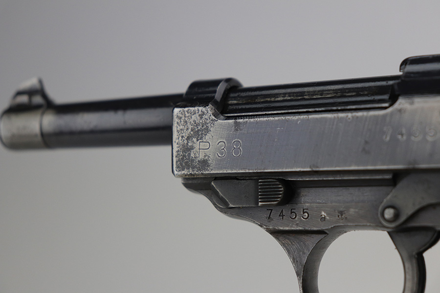 9/17/21 – This is a nice example of a Walther P.38 issued to the Nazi military in 1944. It is all matching and has the proper “Eagle 359” Nazi military acceptance proofs. It has retained roughly 60% of its finish. There is significant wear on the front strap, left side of the slide, front edges on both sides of the slide, and around the muzzle. Spotty oxidation oxidation and minor pitting in the same areas. Minor wear on the high edges in general. There is also spotty wear on the right side of the slide. Comes with excellent late-war reddish grips and a period-correct jvd magazine (some areas of surface rust). The bore has strong rifling with some areas of frosting. De-cocker is functional.