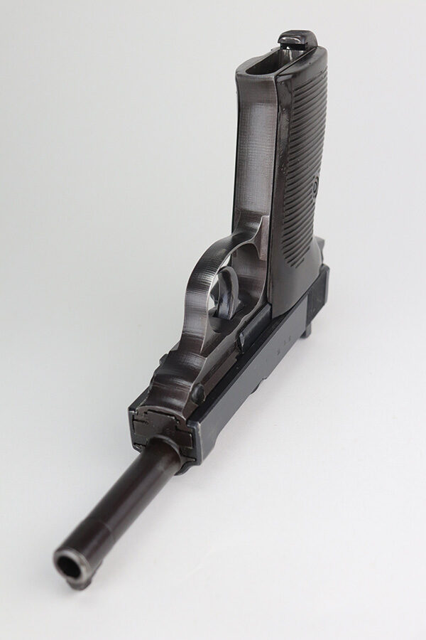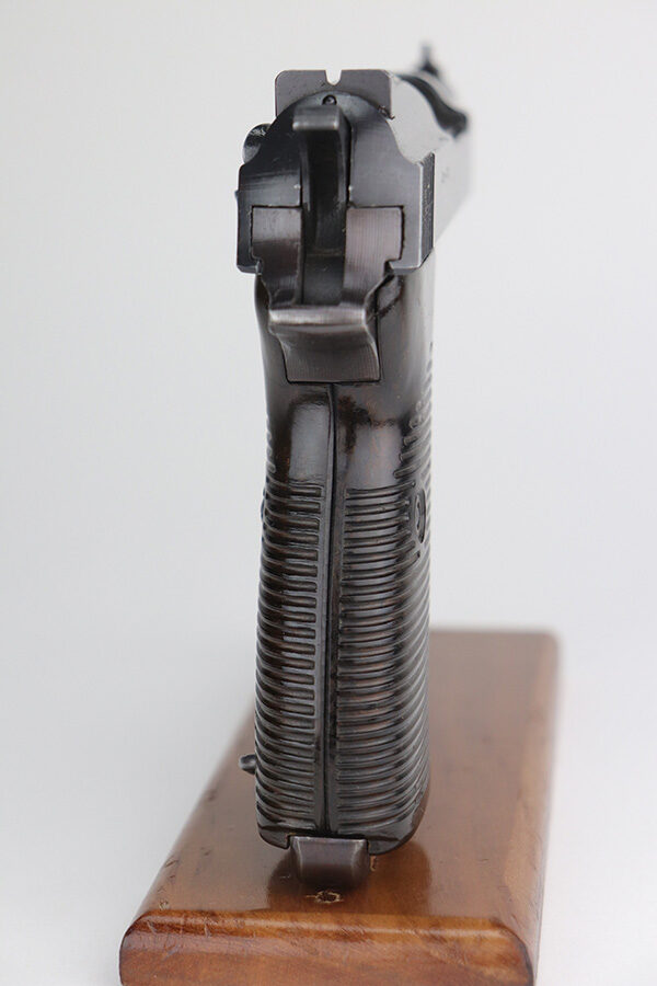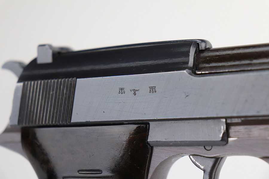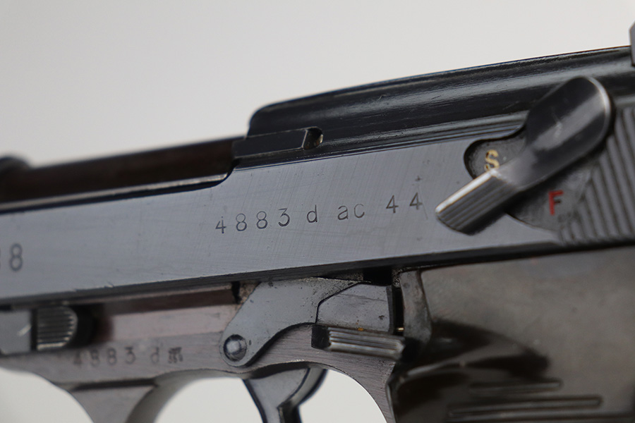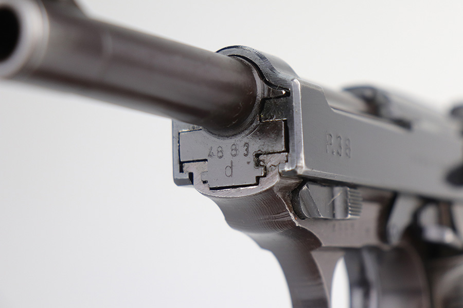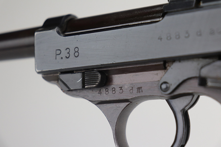 11/23/21 – This is a minty example of a Walther P.38 issued to the Nazi military in 1944. It is all matching and has the proper “Eagle 359” Nazi military acceptance proofs throughout. It has retained about 96-97% of its original finish. The frame and barrel have a really nice plumb color to them. There are areas of very minor wear on the front edges of the slide, around the muzzle, one or two small spots on the barrel, and on the underside of the trigger guard. Very minor thinning on the front strap. Comes with excellent period-correct grips and a period-correct Walther magazine. Mint bore. De-cocker is functional.