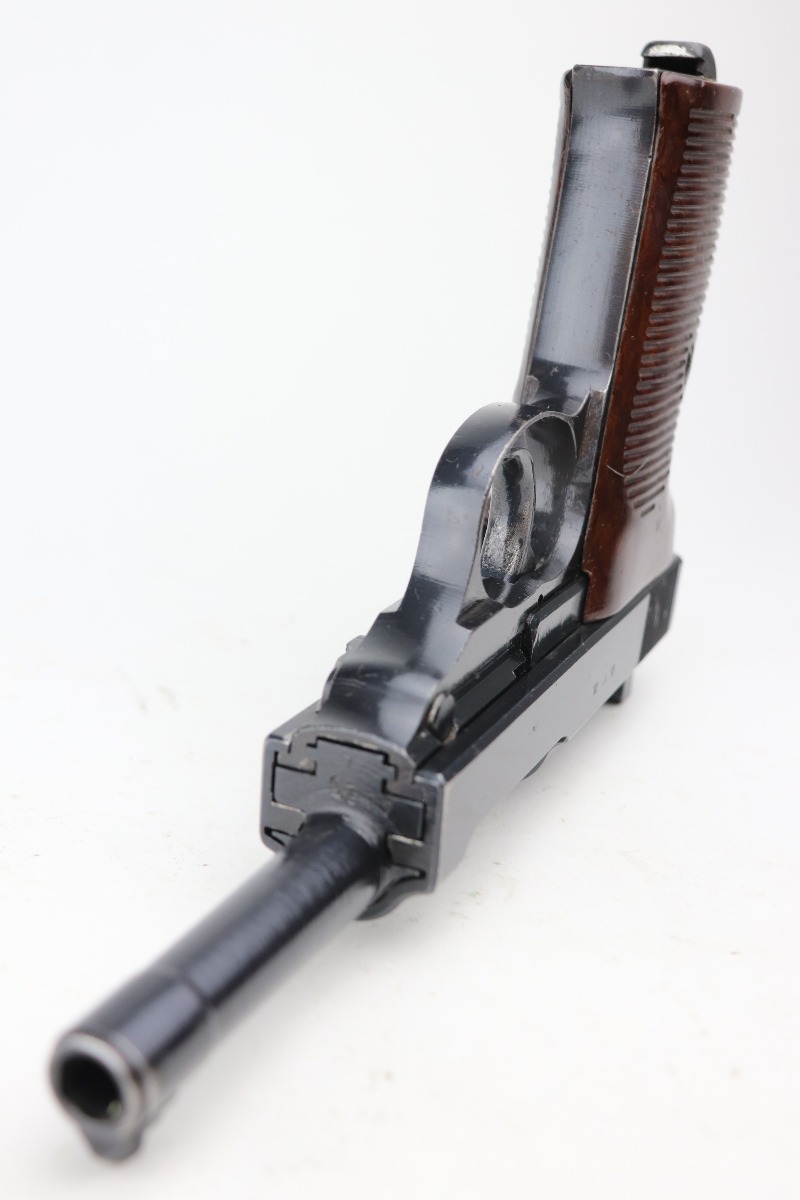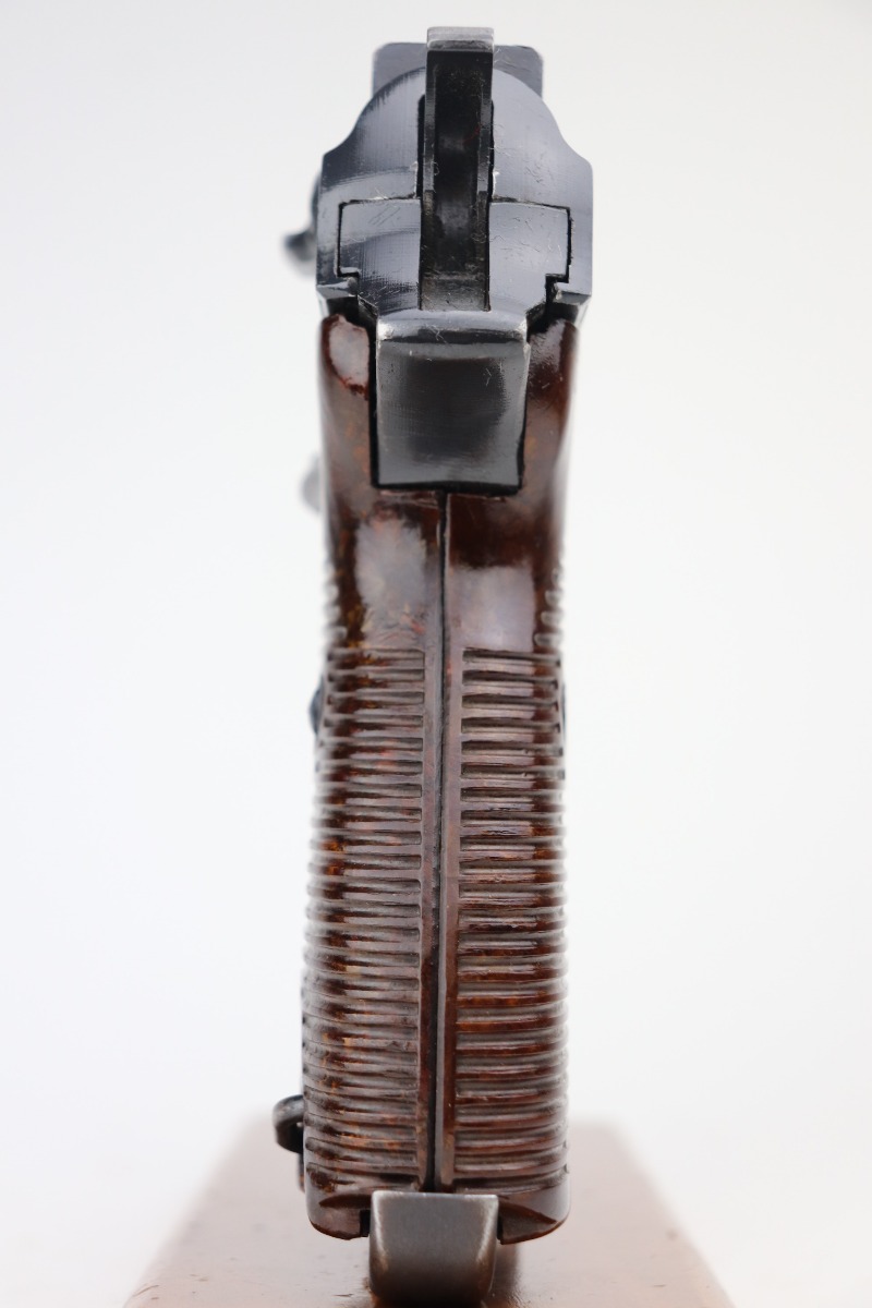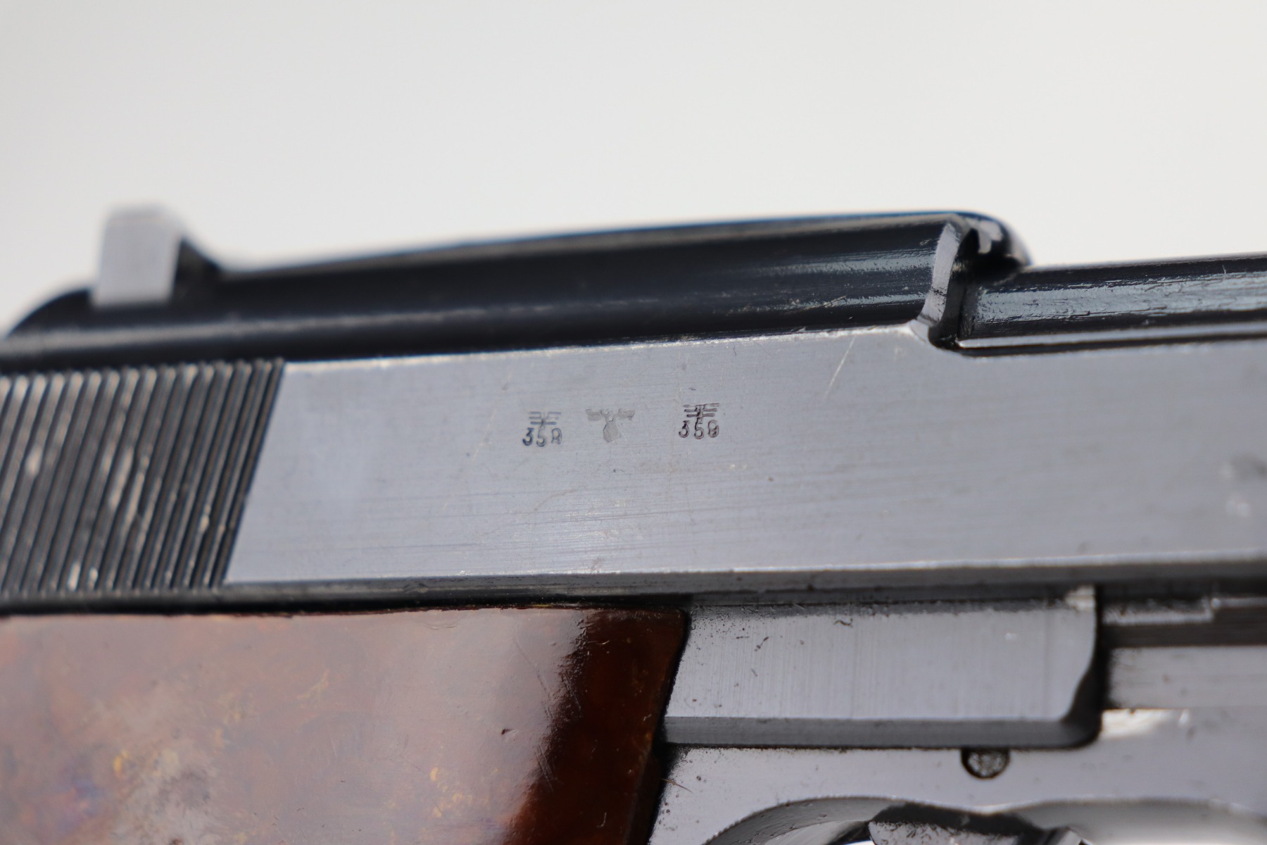 3/8/21 – This is an excellent example of a Walther P.38 issued to the Nazi military in 1944. It is all matching and has the proper “Eagle 359” military proofs. It also has a scarce “fnh” barrel. There are a couple of dings on the left side of the frame. To us, it looks like there used to be post-war markings that have been peened and touched up. The gun was likely arsenal-refinished after it was captured. It has retained about 97% of its finish. There is wear around the muzzle and front edges of the slide. Light spotty wear on the front strap. Some very light scratches on the right side of the slide. Comes with excellent grips and a period-correct magazine. De-cocker is functional. The bore is excellent – shiny with strong rifling.