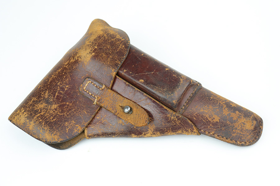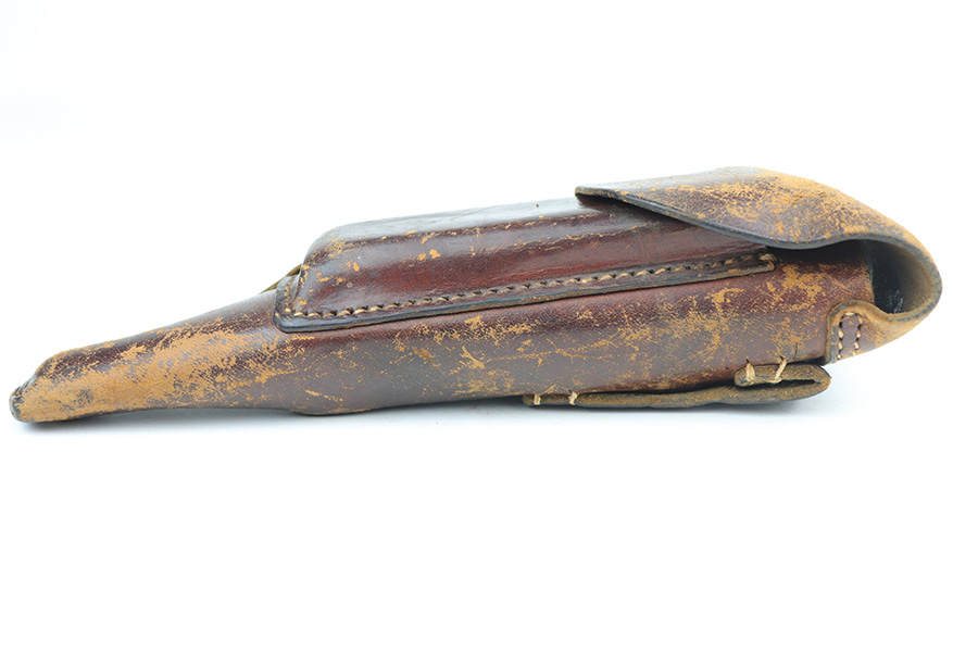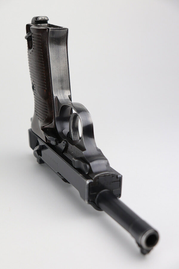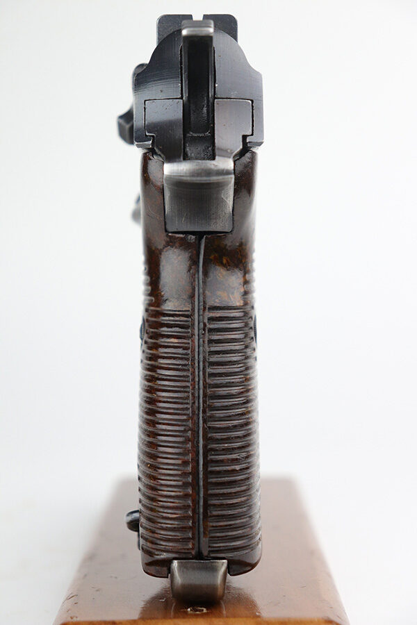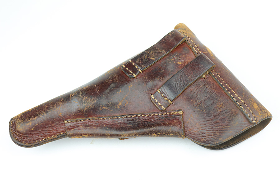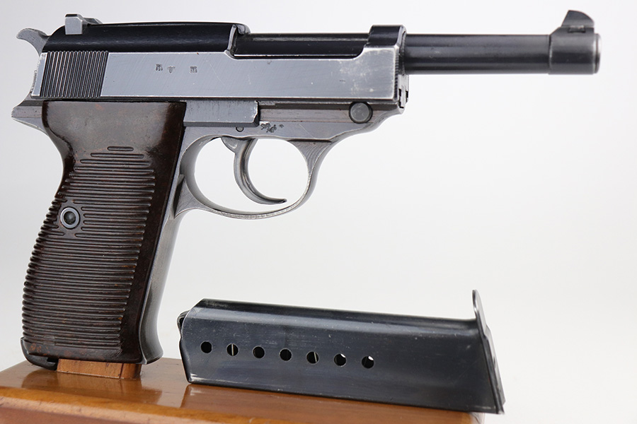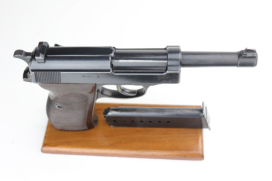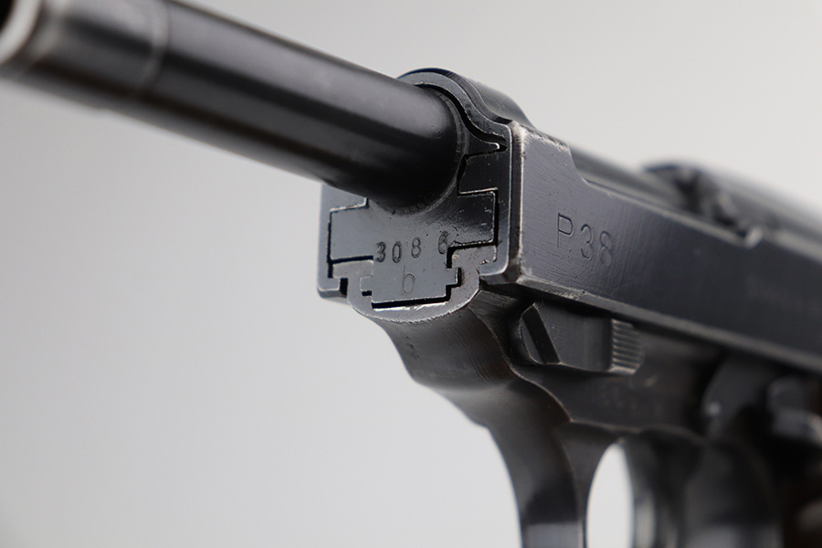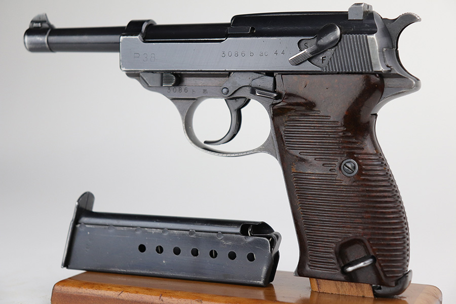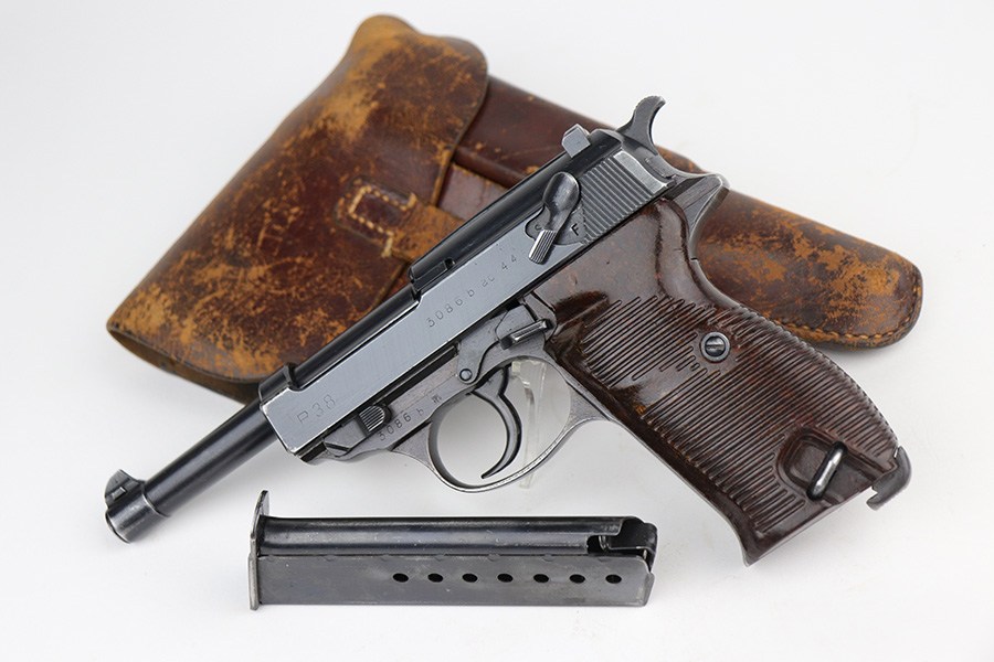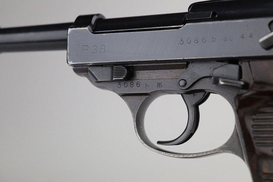 9/15/21 – This is a nice example of a Walther P.38 issued to the Nazi military in 1944. It is all matching and has the proper “Eagle 359” military proofs. It comes with a slightly worn tan leather 1944-dated holster (no visible waffen proof) and a period-correct un-numbered Walther magazine. The bottom of the magazine has a series of small dings and dents. The gun has retained somewhere between 85-90% of its original finish. Most of the wear is on the front strap, so the profile views are very nice. There is minor wear at the front edges of the slide and around the muzzle. An area of minor spotty wear on the right side of the slide. One very small area of mionr pitting on the right side of the slide. Comes with excellent reddish grips. The bore is mint. De-cocker is functional.