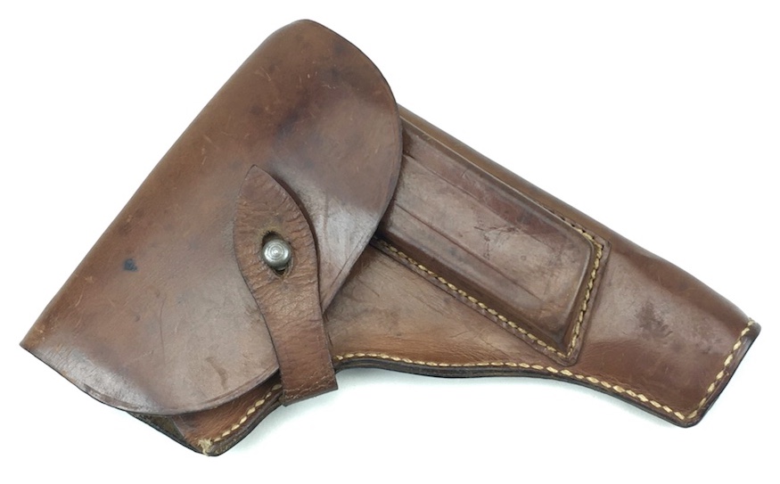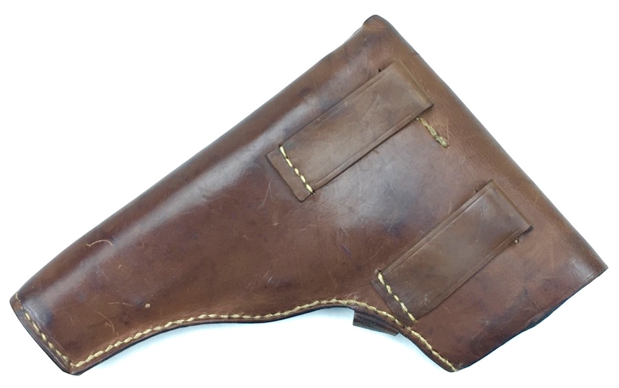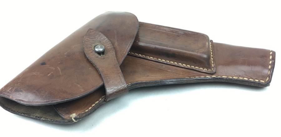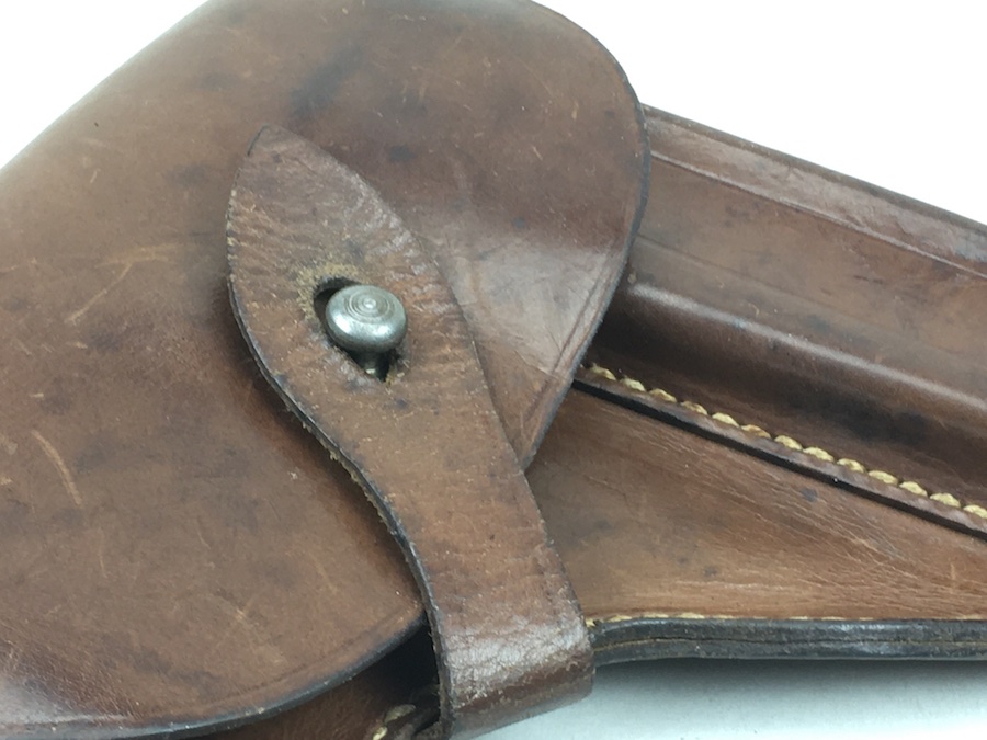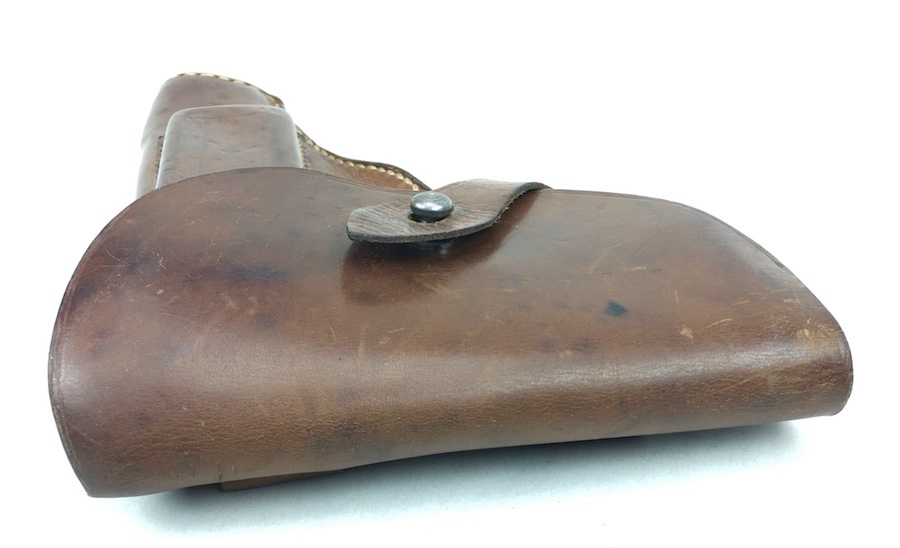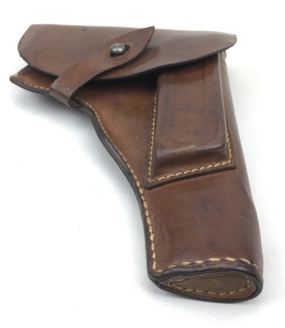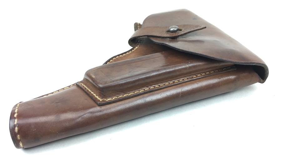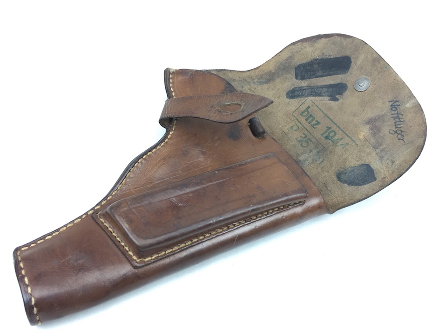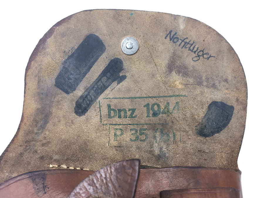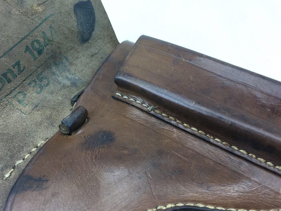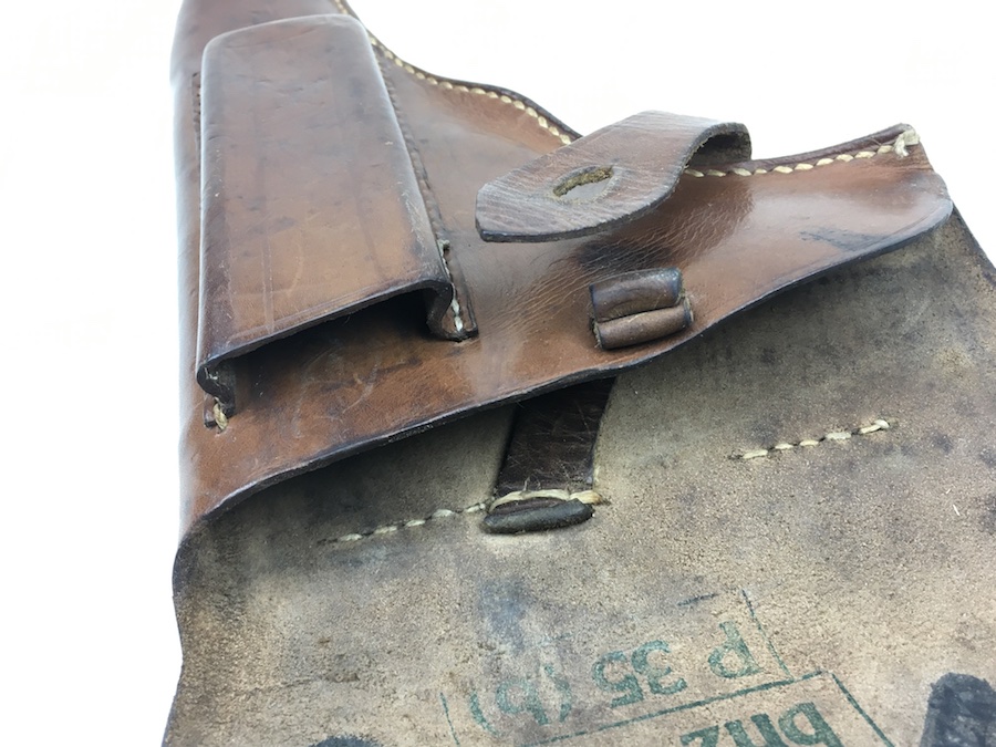 11/15/19 – This is an original 1944 dated, P.35 Radom holster. A nice late war production piece. The holster has clean leather that is firm throughout, with minor use wear and surface stains. The leather is completely intact along with the stitching. Upper left side of the mag pouch appears to have a stitching repair. The backside of the closure flap is ink stamped with a “bnz” maker mark and ‘1944’. The interior leather is ink stamped “P35 (p)” and some personal markings. See photos. Guaranteed original and authentic.