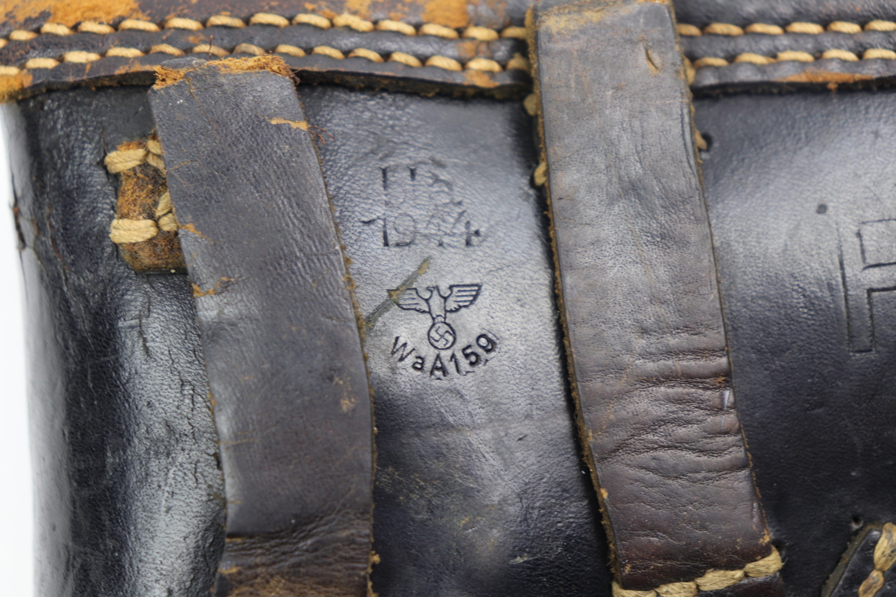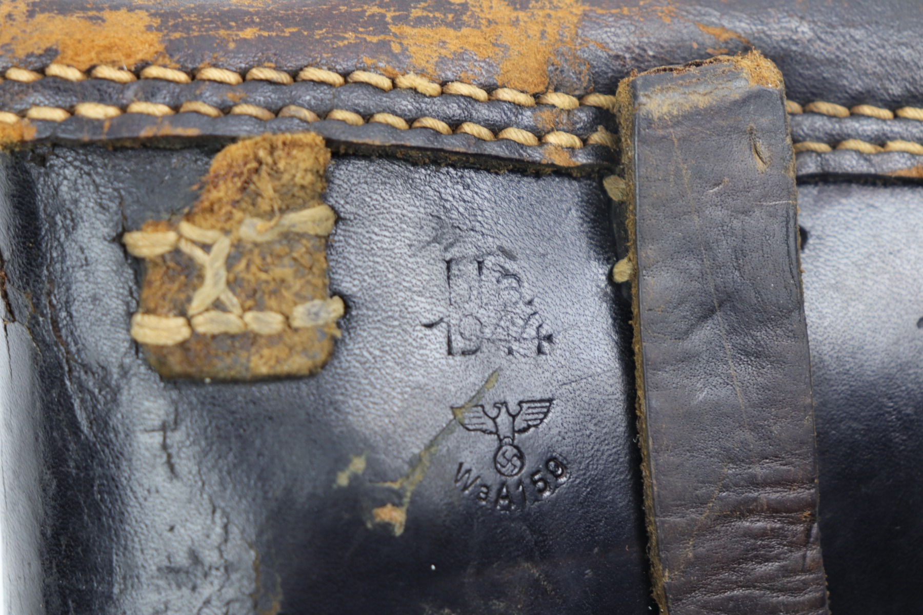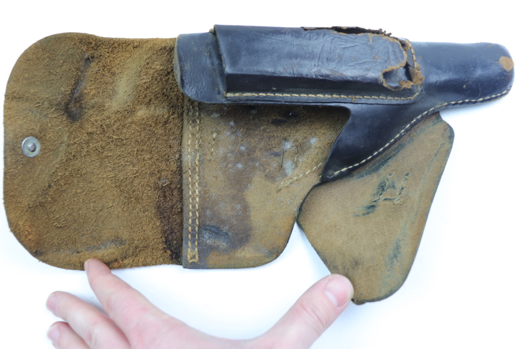 12/22/20 – This is a 1944 dated p.38 holster with some significant wear. See photos – there is a portion of the magazine pouch missing and the back belt loop is not fully attached. Could be repaired, used for an “honest wear” piece, or used for scrap leather and stitching. Markings on the back leather are crisp.