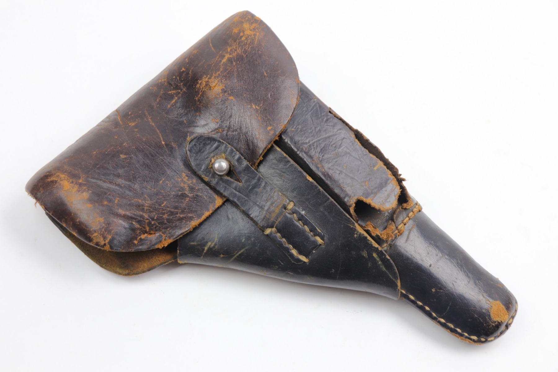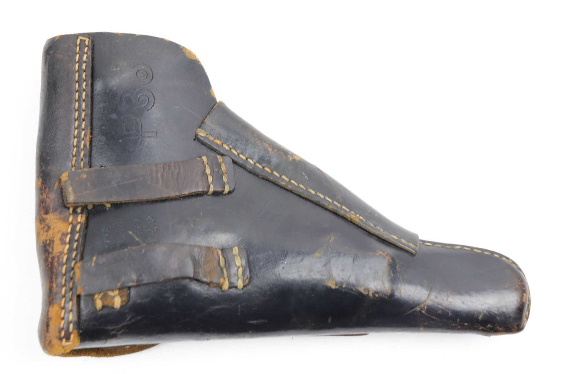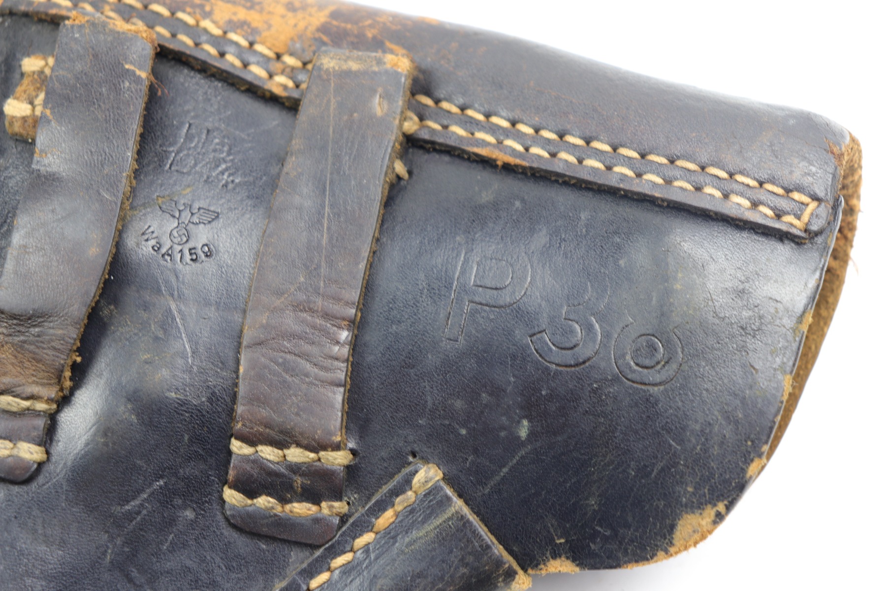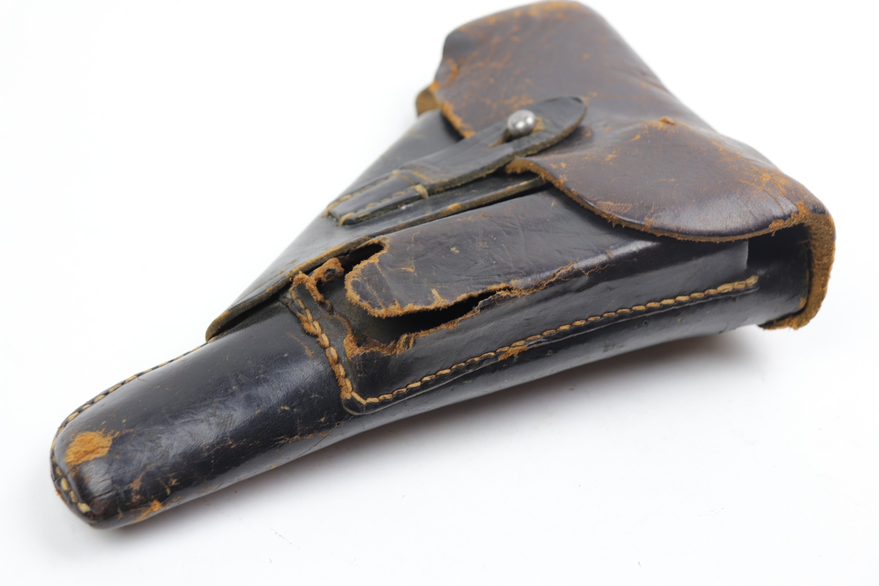 12/22/20 – This is a 1944 dated p.38 holster with some significant wear. See photos – there is a portion of the magazine pouch missing and the back belt loop is not fully attached. Could be repaired, used for an “honest wear” piece, or used for scrap leather and stitching. Markings on the back leather are crisp.