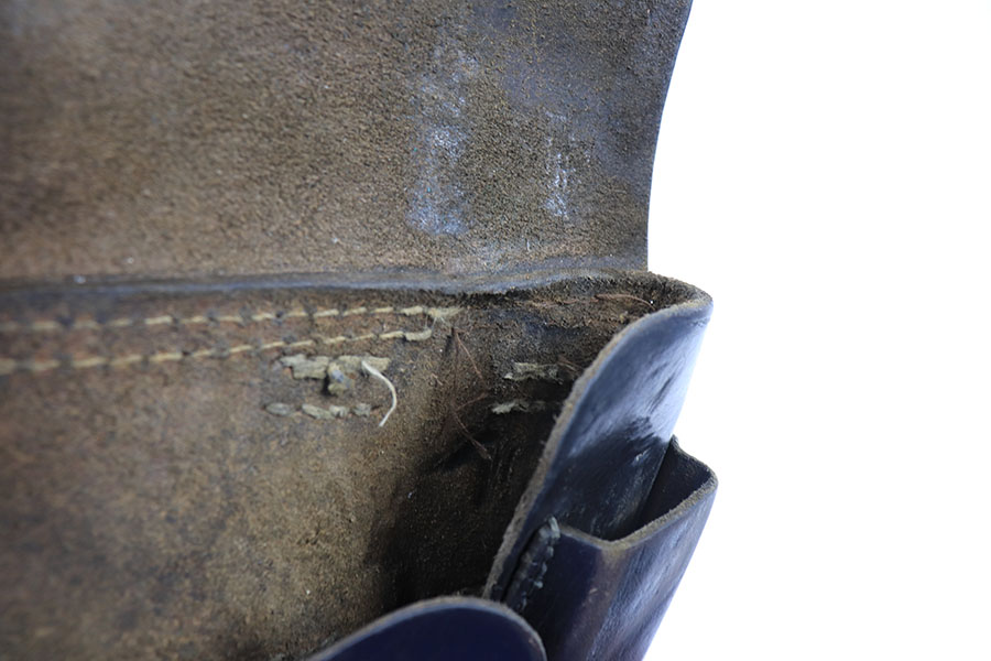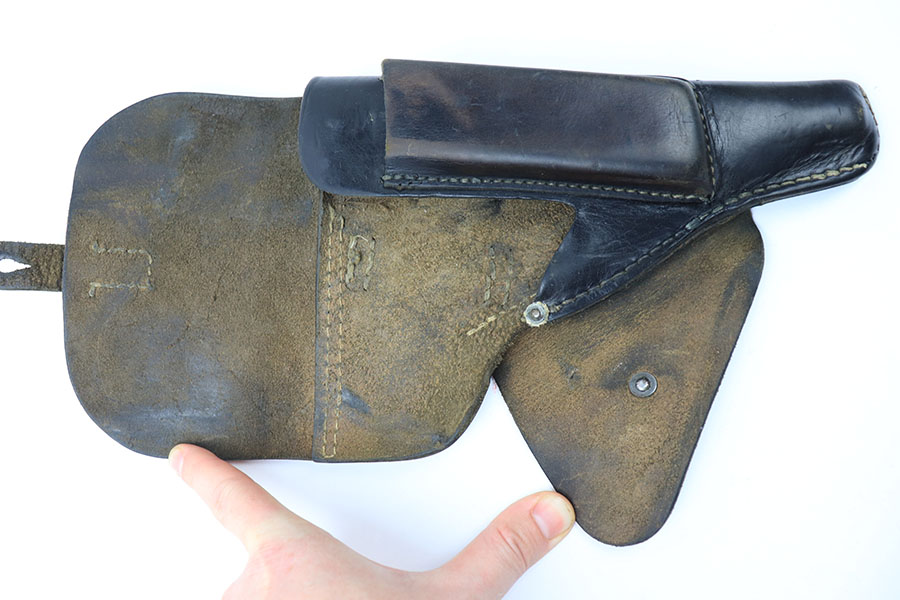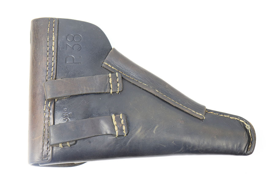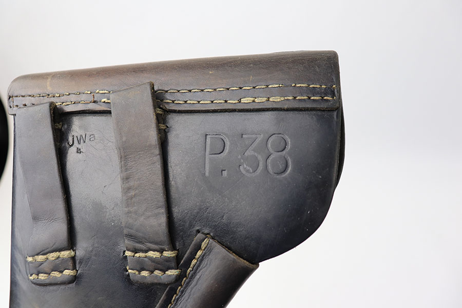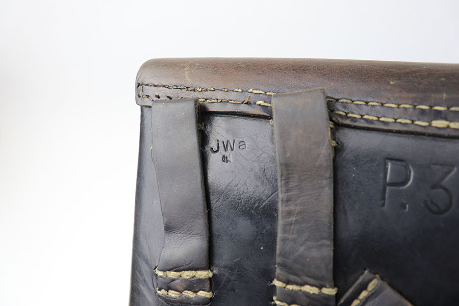 7/6/21 – This is a 1944 dated softshell P.38 holster. The holster is maker stamped and dated on the back leather as shown, and has normal wear throughout. The toe of leather has a few missing stitches, as does the top right corner of the hinge (as shown in photos). Price reduced accordingly. Normal leather aging and wear, and no major issues.