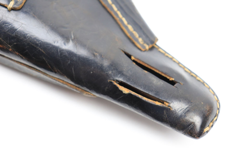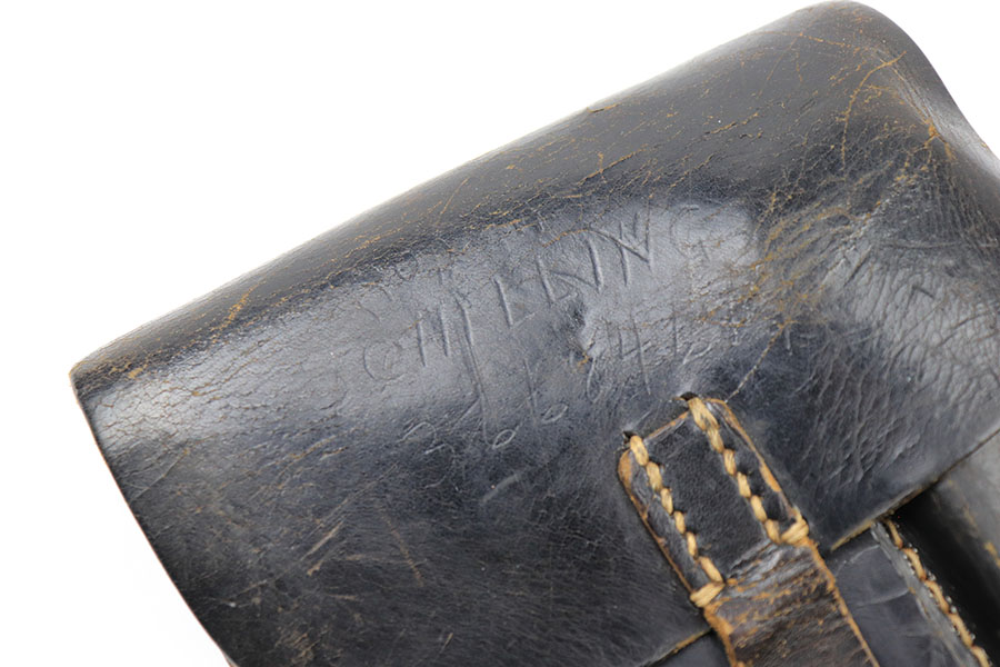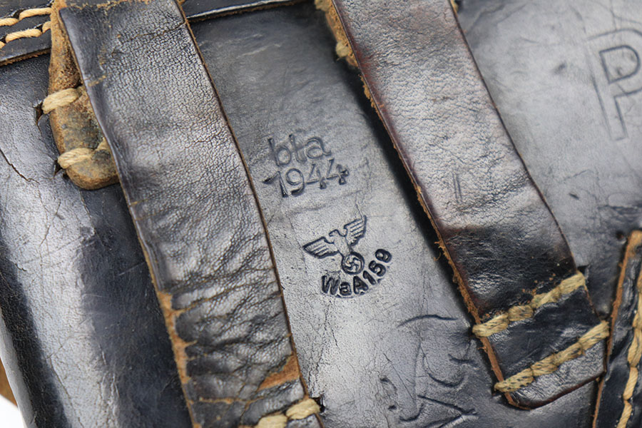 10/5/21 – This is an original soft shell style P.38 holster. The holster is 1944 dated, maker stamped, waffen proofed, and P.38 stamped on the back leather. The back leather also has two cuts in the leather, as shown. The leather has scuffing around the magazine pouch and wrinkling throughout. Priced accordingly.