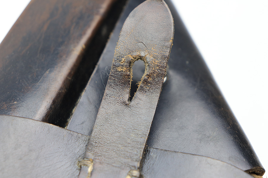 3/2/22 – This is an original late WW2 production P.38 holster. The holster is softshell style with a P.38 stamp on the back leather. The back leather is also stamped “jwa 4”. The black leather is soft and pliable with some mild signs of aging and previous use but no major damage. No stitching issues.