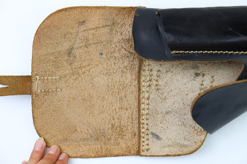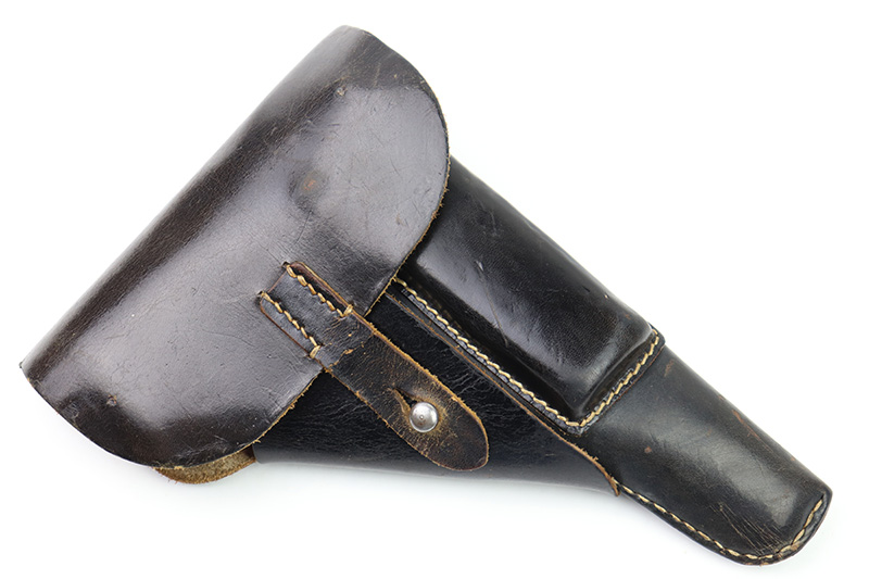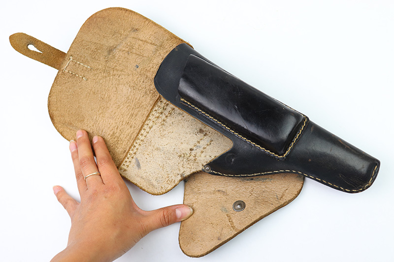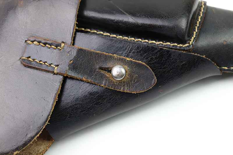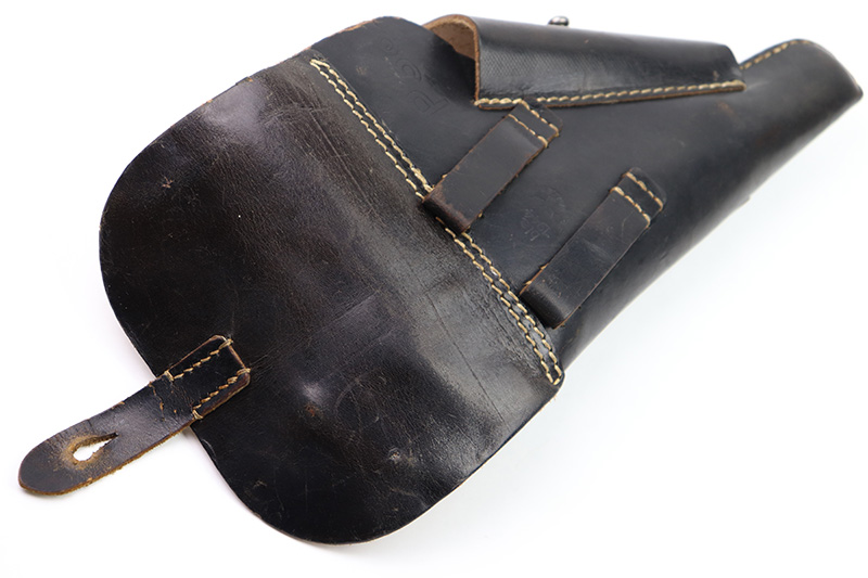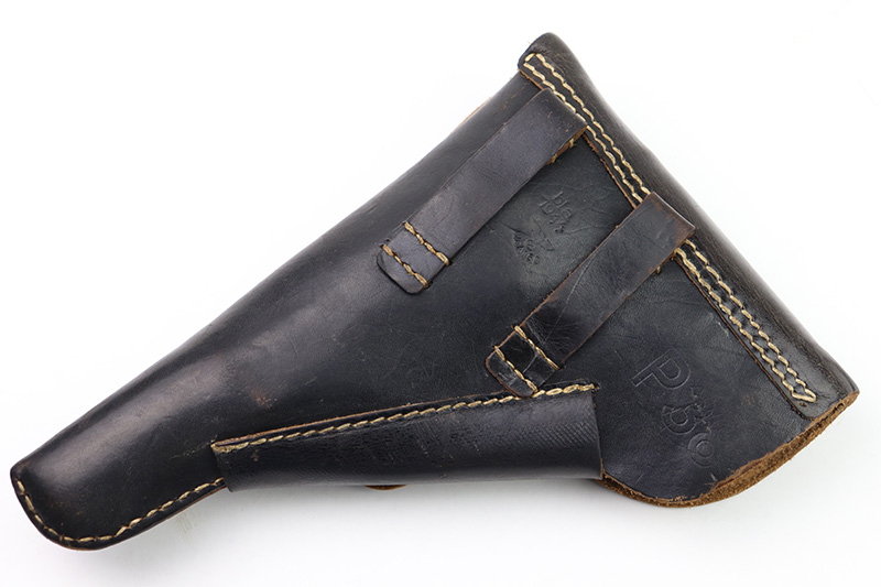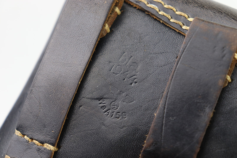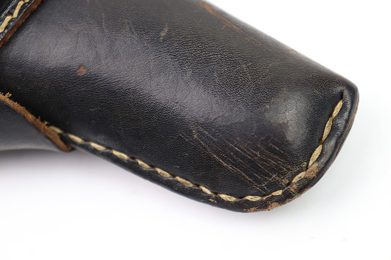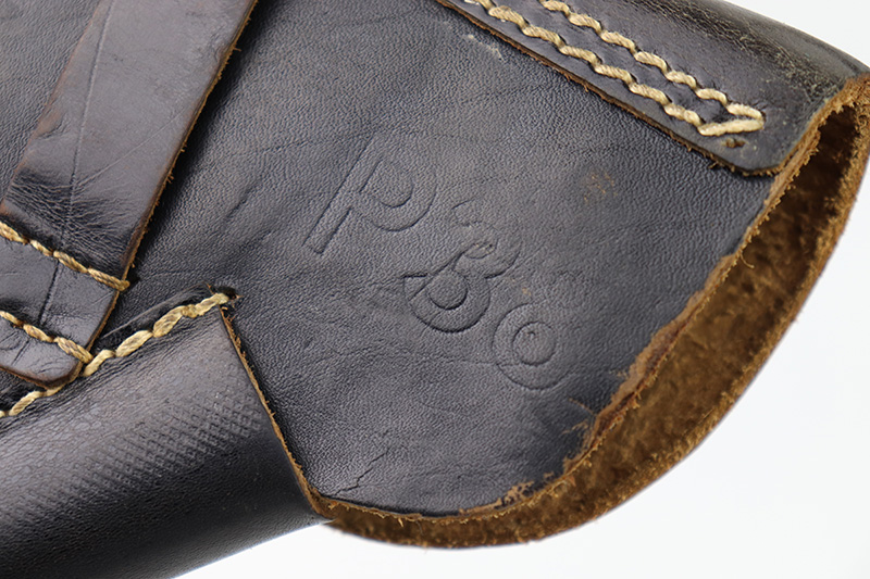 8/23/22 – This is an original 1944 dated softshell style P.38 holster. The holster is maker stamped, dated, waffen proofed, and P.38 stamped on the back leather. The leather shows typical signs of previous use but no excessive wear or damage. All original stitching intact. Clean interior leather as well.