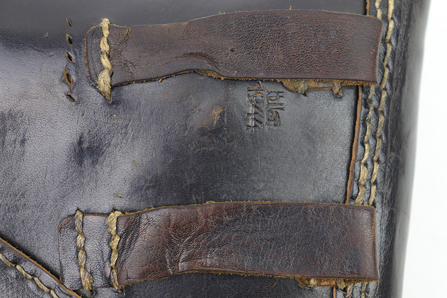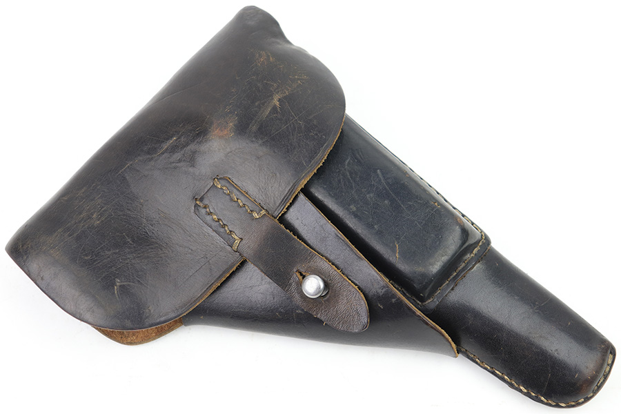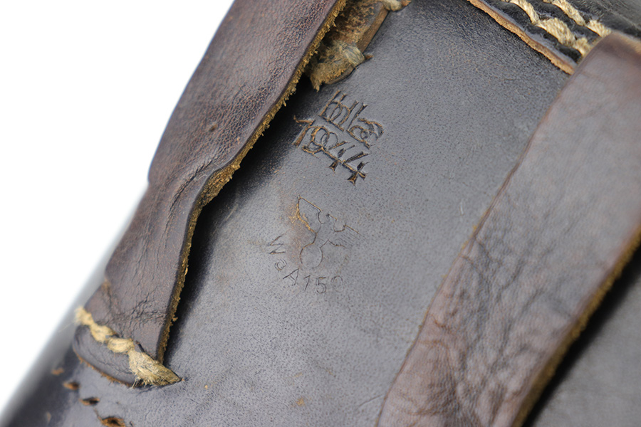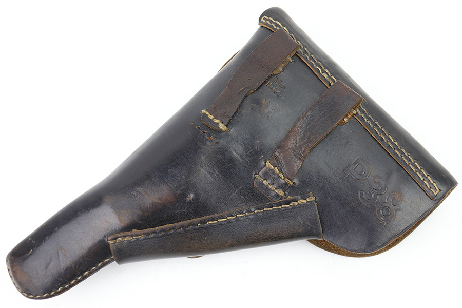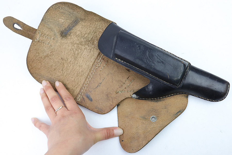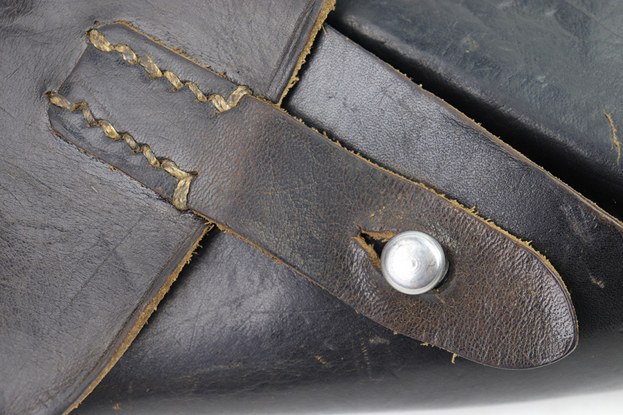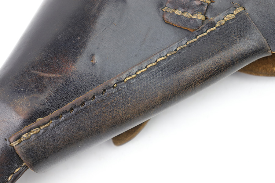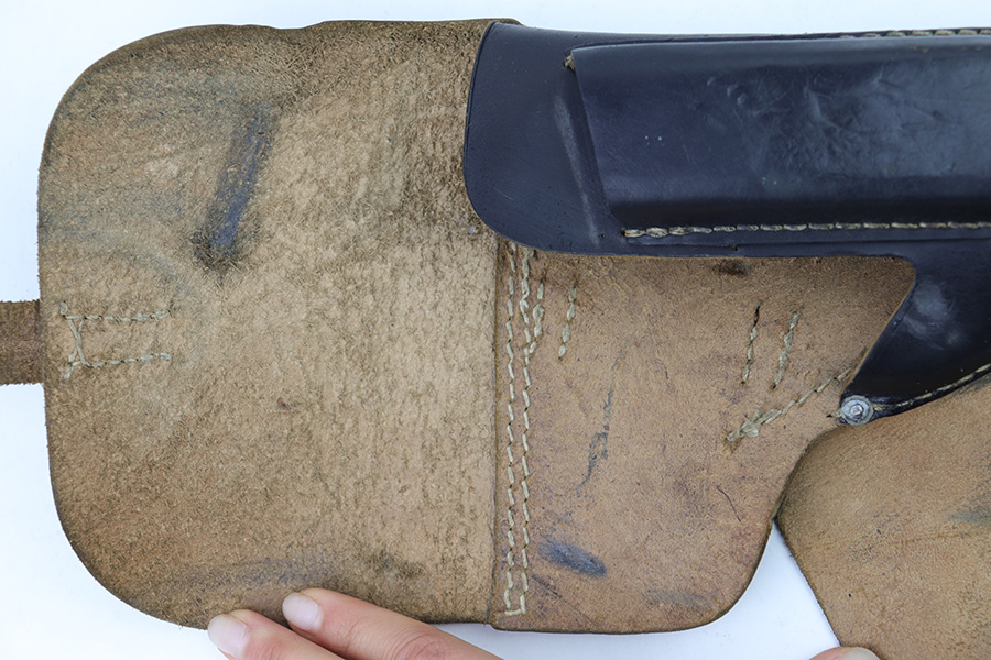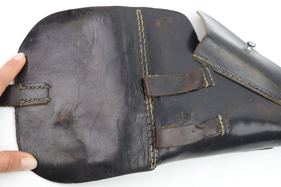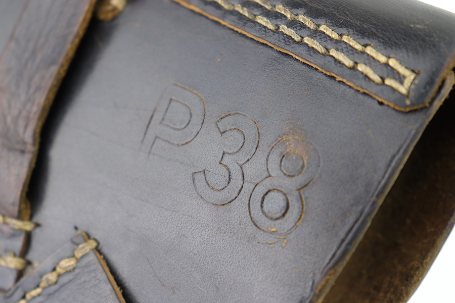 3/14/23 – This is an original 1944 soft shell style P.38 holster. The holster is maker stamped and dated with a factory double-stamp and a waffen proof underneath. Also P.38 stamped as shown. The holster has some honest wear and signs of previous use and aging with normal pliability. Holds shape nicely. The stitching is all original but there are a few missing stitches on the side flap. This doesn’t affect functionality and is about 5-6 total stitches. The bottom of the left belt loop is missing a line of stitching as well, but this almost looks like it left the factory this way as the left belt loop is slightly smaller than the right. Might be a later wartime production flaw.