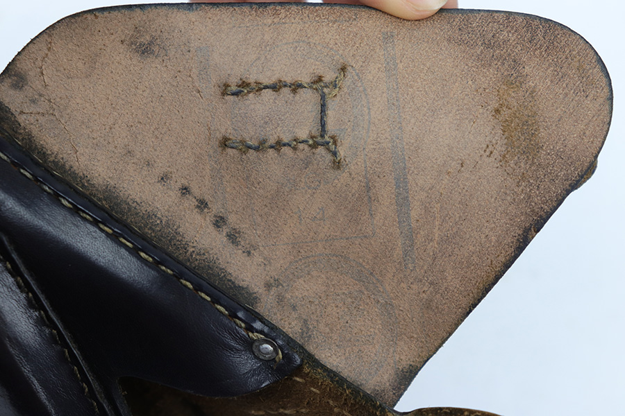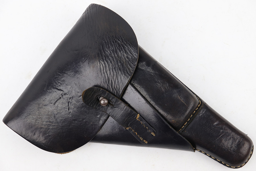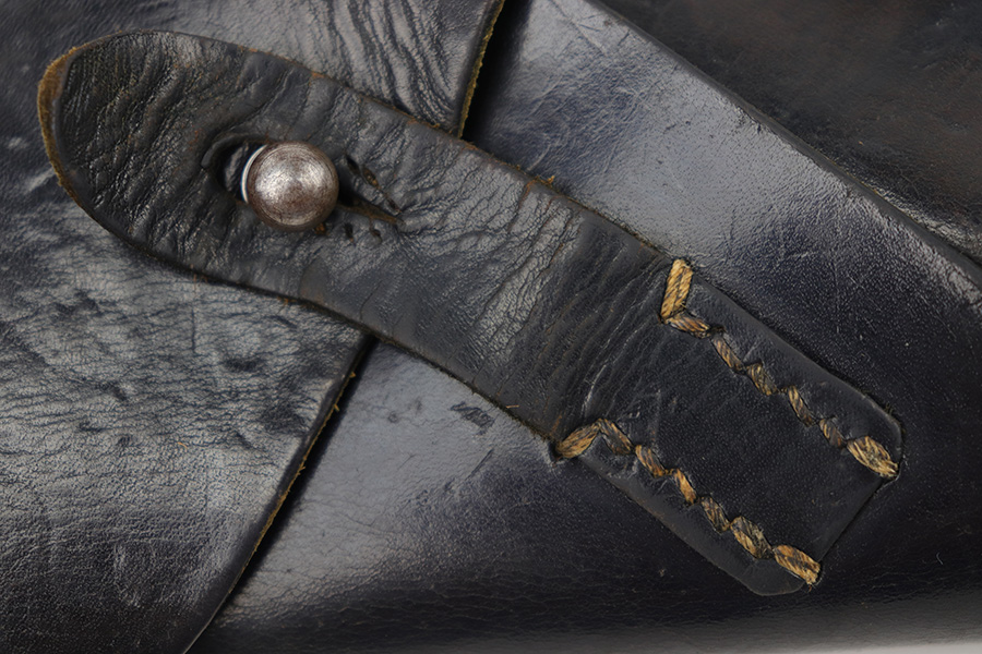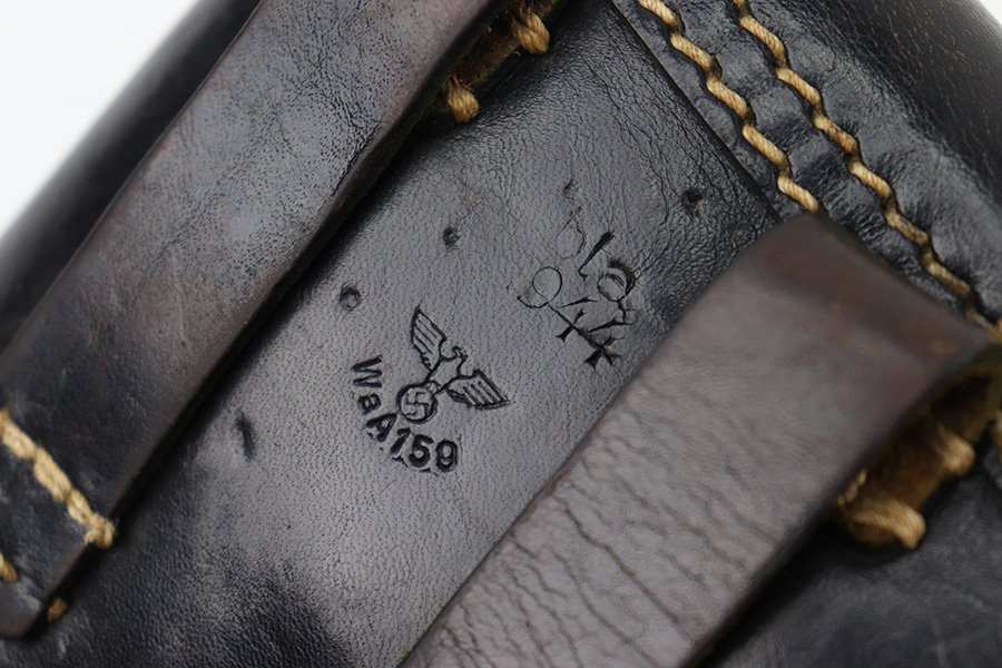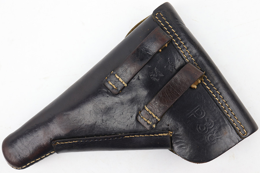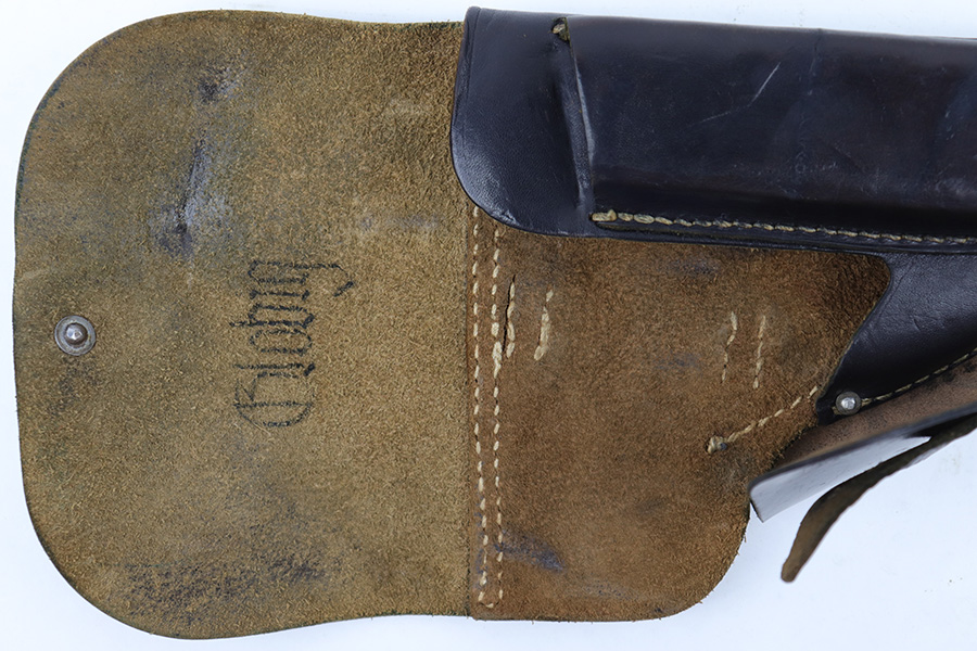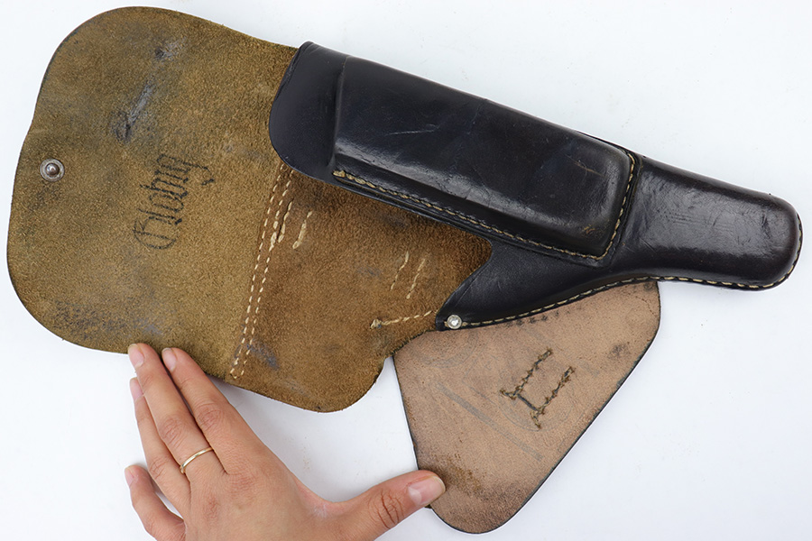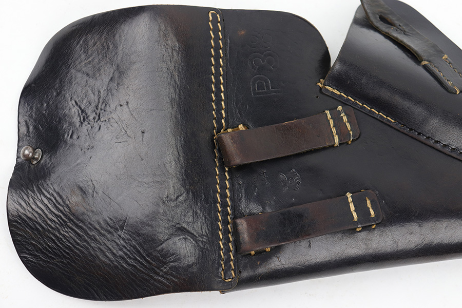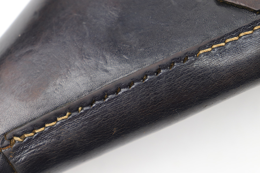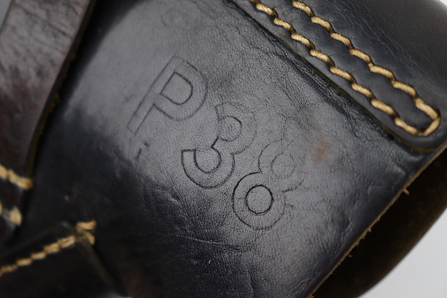 5/2/23 – This is an original 1944 dated soft-shell style P.38 holster from WW2. The holster is maker, date, waffen, and P.38 stamped on the back leather. All markings are easily visible. The leather is soft and pliable with normal aging and typical use wear throughout. The interior leather has some writing, as shown. The stitching is all original, but there’s a few missing stitches on the side flap and base of the belt loops, as shown in photos. This doesn’t affect functionality as all the leather is securely in place. See photos.