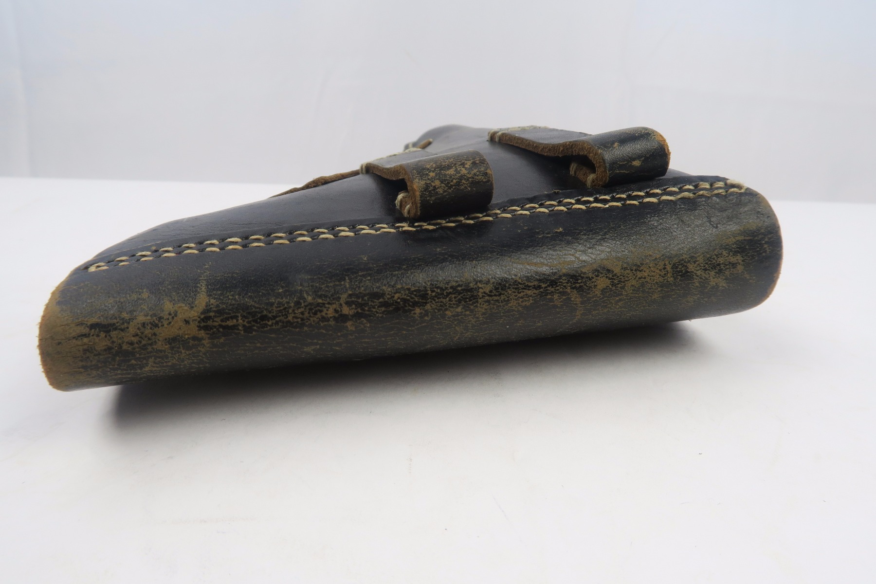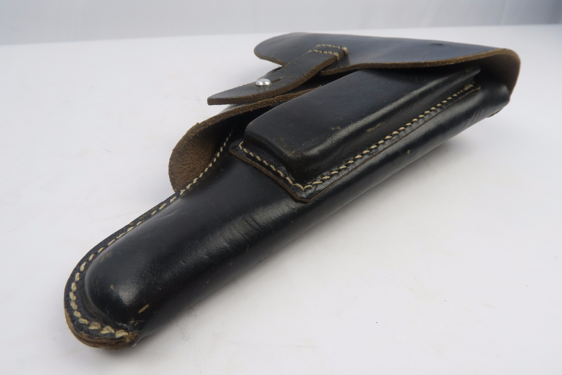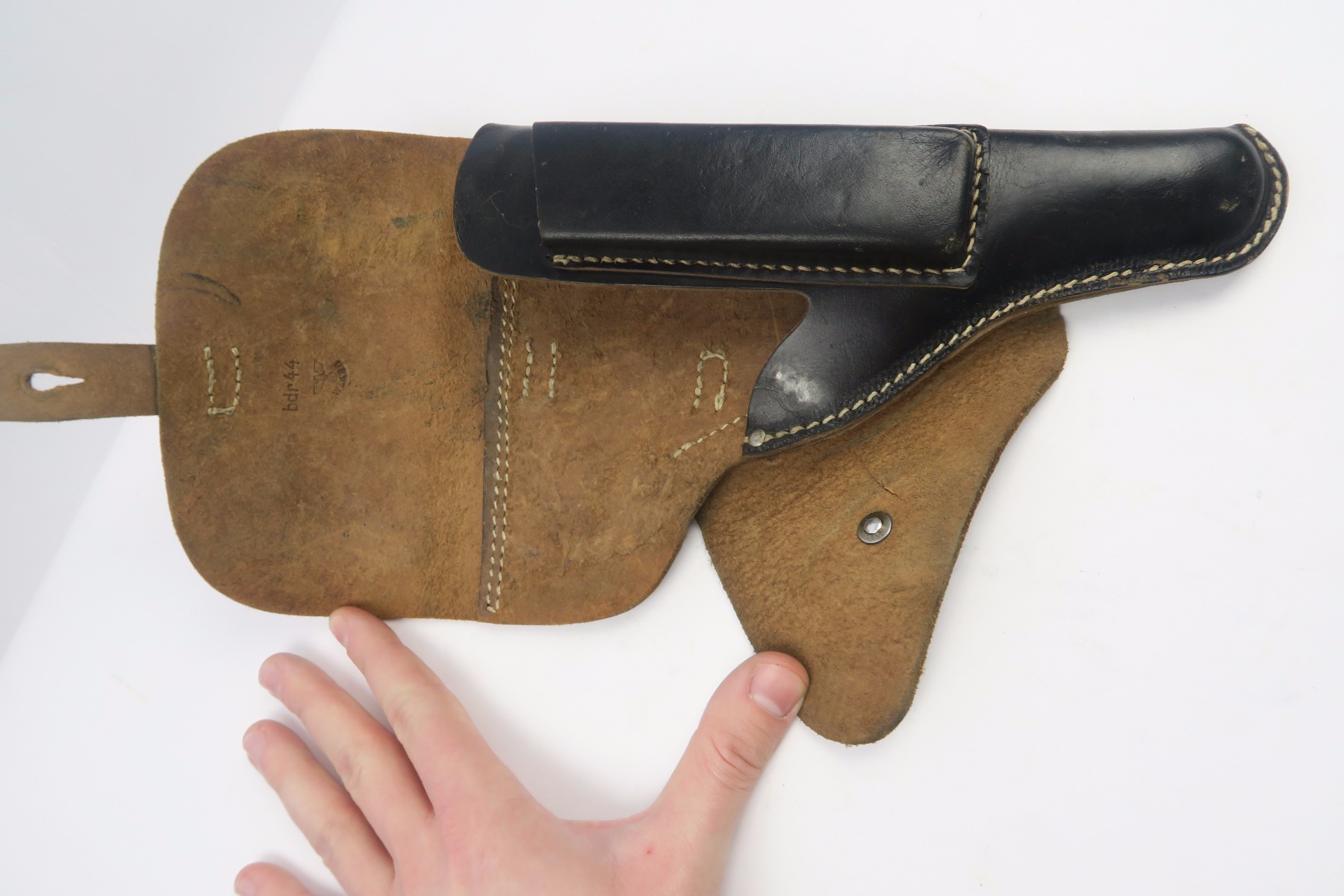 12/1/17 – This is an original 1944 dated P.38 holster from WW2. This softshell style holster is in great shape overall, despite some light surface wrinkling on the top leather/lid area. The clean interior leather is strongly stamped with a maker code, 1944 date, and waffen military proof stamp. The stitching is all original and excellent. Guaranteed original and authentic.
