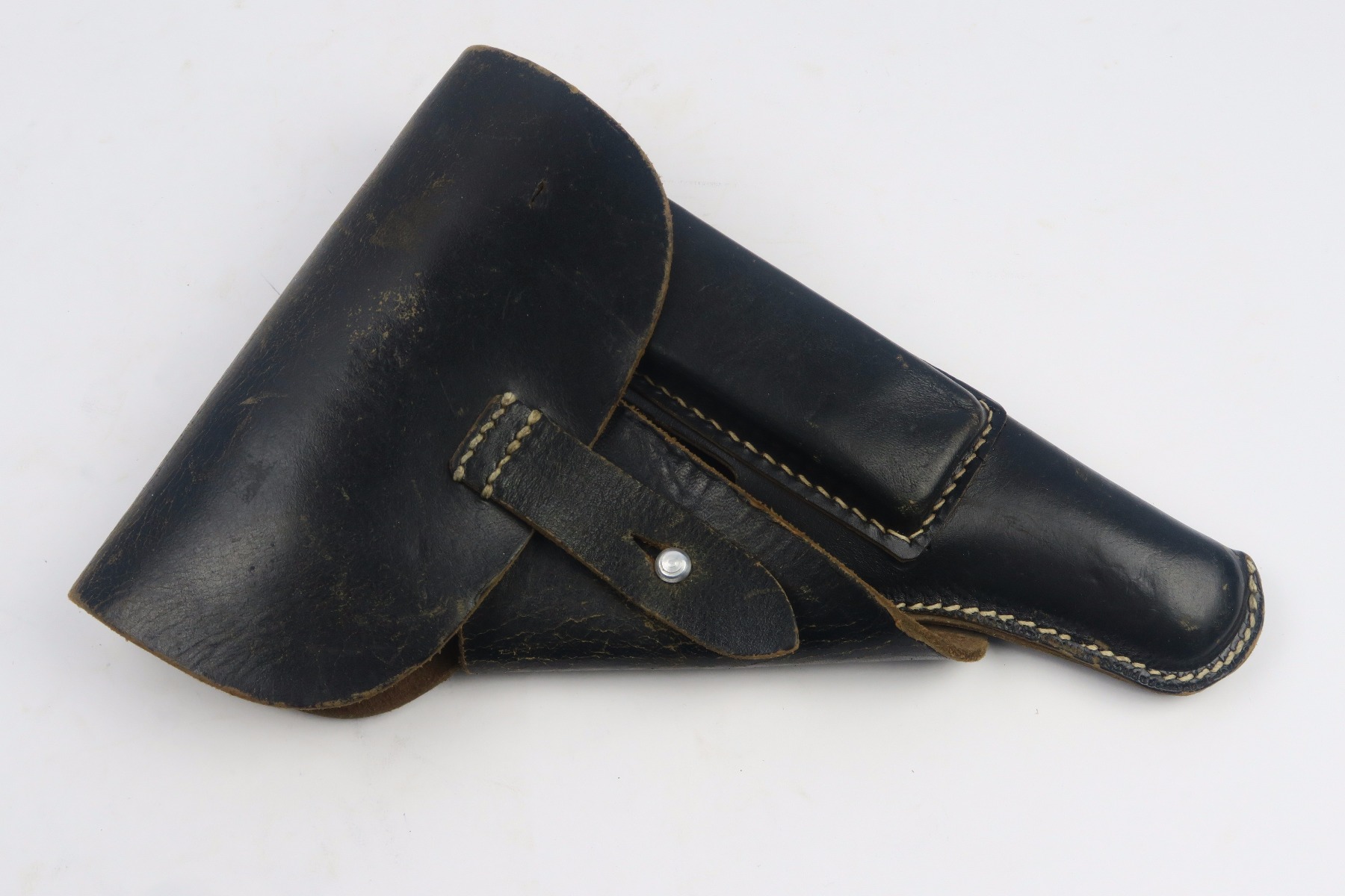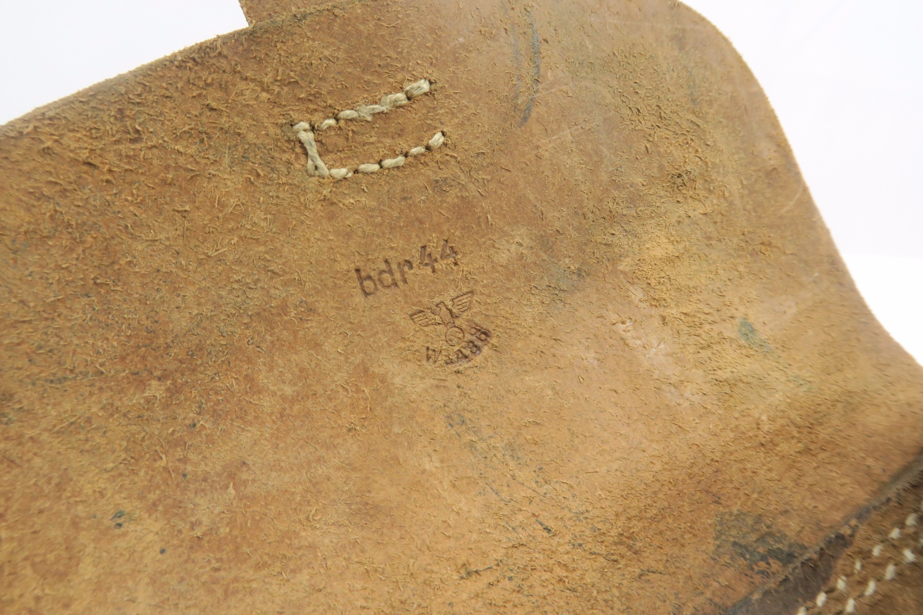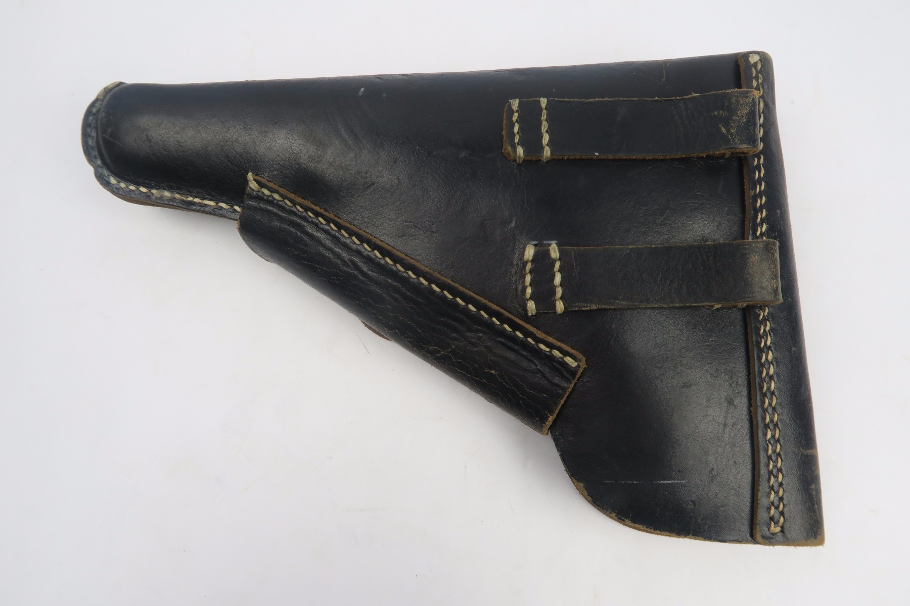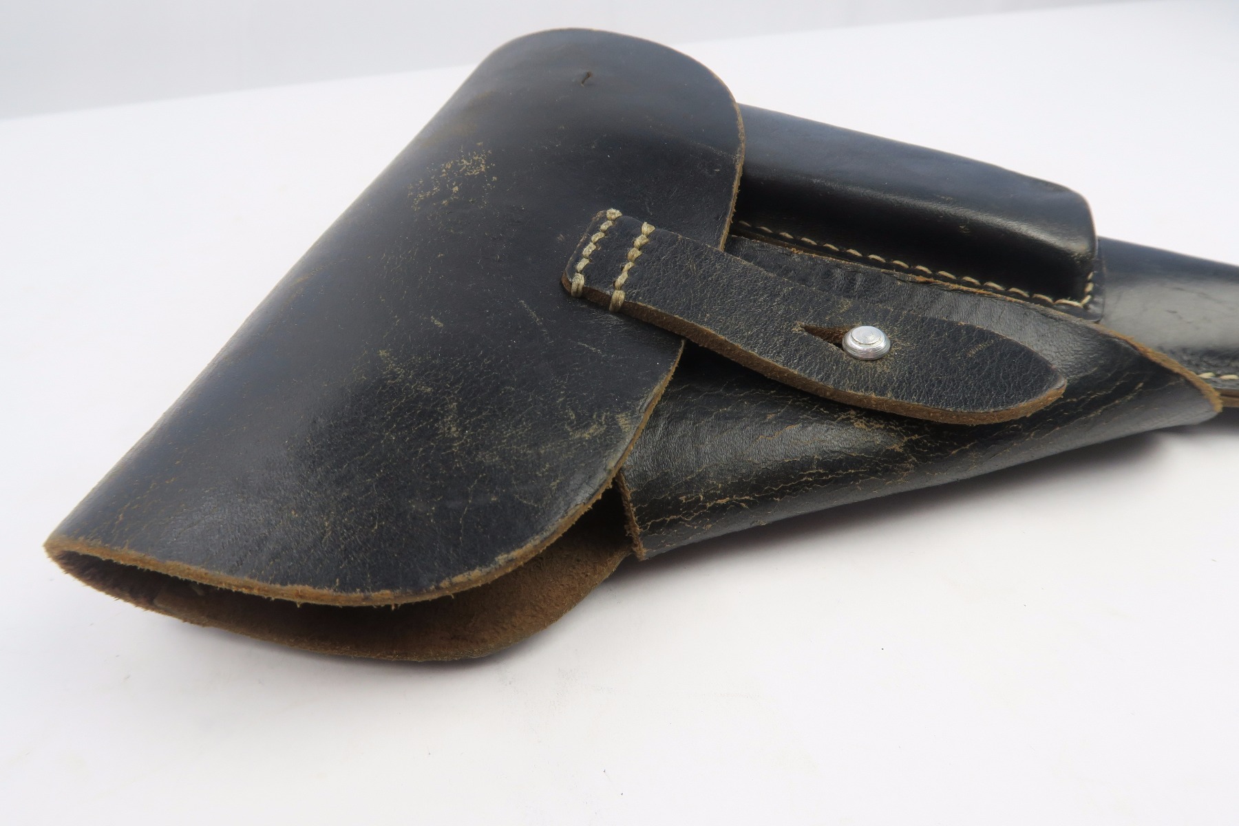 12/1/17 – This is an original 1944 dated P.38 holster from WW2. This softshell style holster is in great shape overall, despite some light surface wrinkling on the top leather/lid area. The clean interior leather is strongly stamped with a maker code, 1944 date, and waffen military proof stamp. The stitching is all original and excellent. Guaranteed original and authentic.