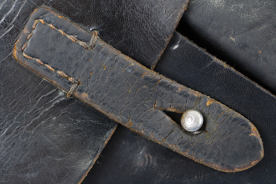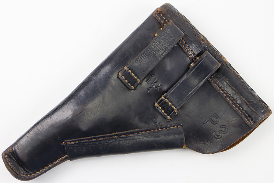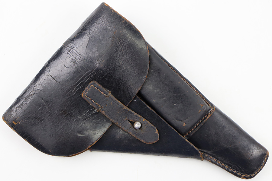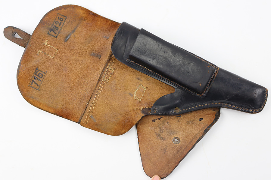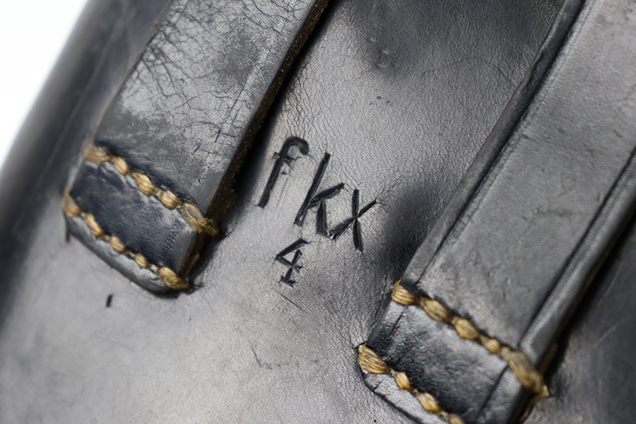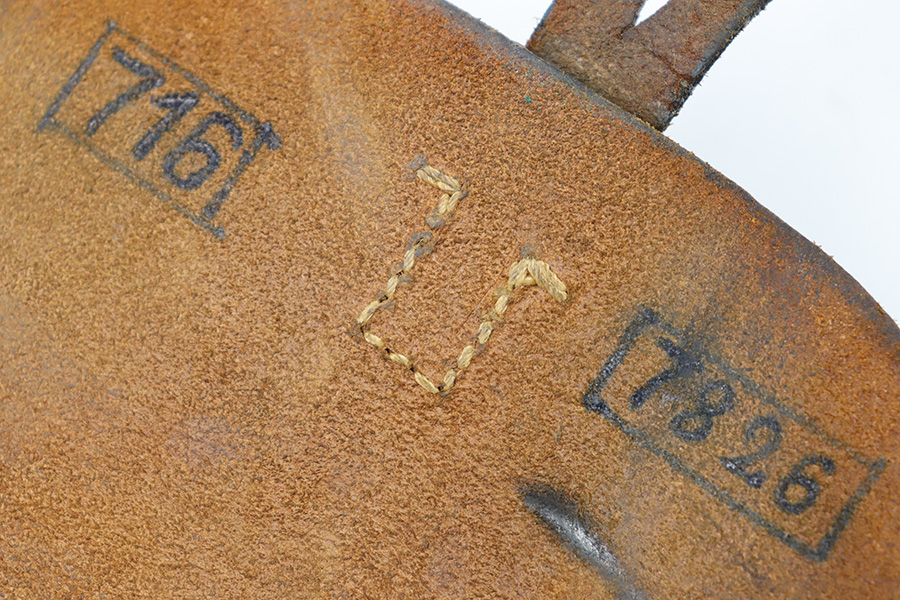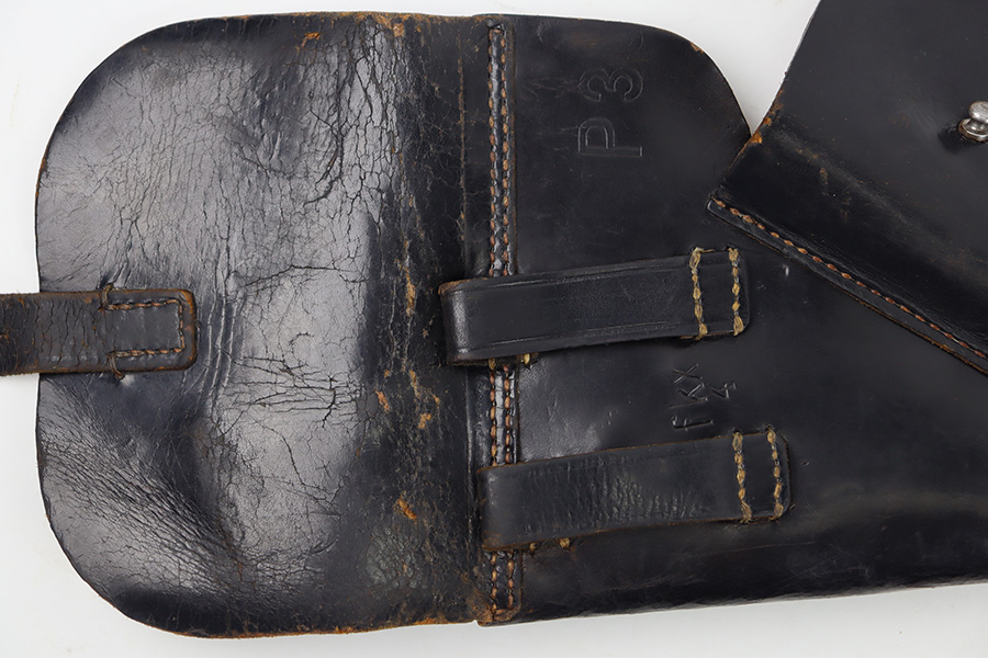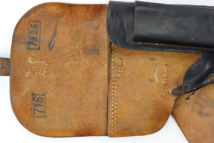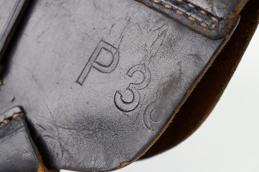 10/27/23 – This is an original soft-shell style P.38 holster from the end of WW2. The holster is stamped on the back leather with a P.38 designation stamp, 1944 date, and maker code stamp. The interior leather has some numbers written in by previous owners. The leather is soft and pliable with signs of previous use and some wrinkling throughout. The top leather has some cracking but none of this goes completely through the leather. Structurally sound with all original stitching intact.