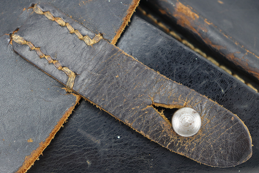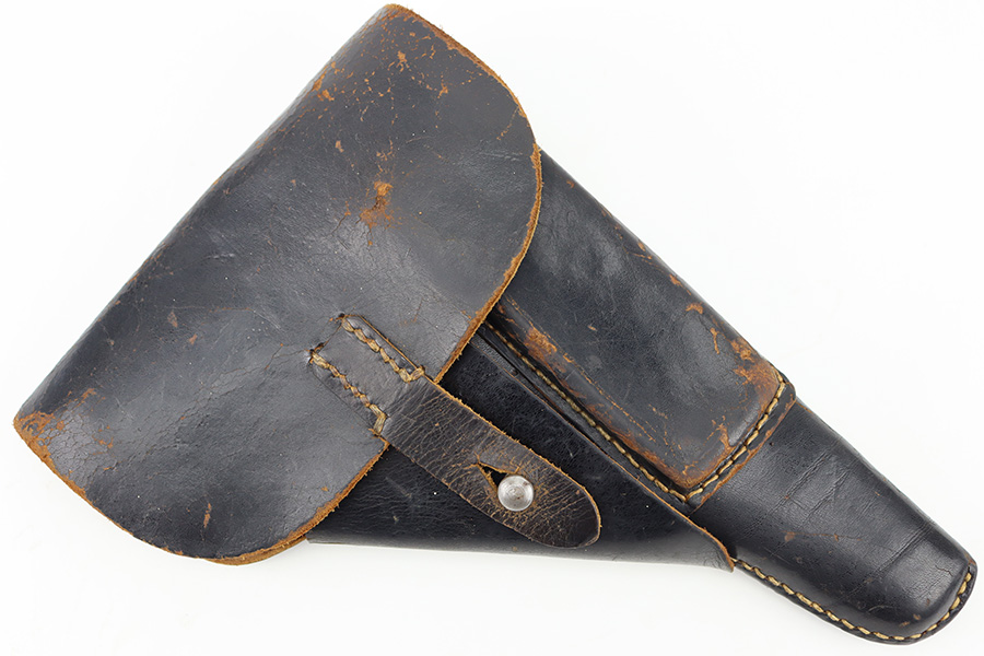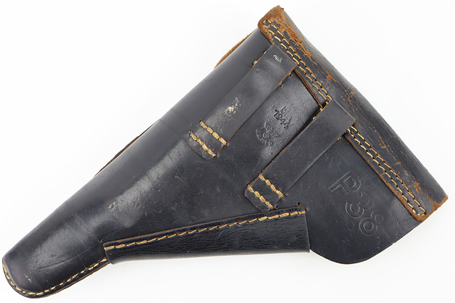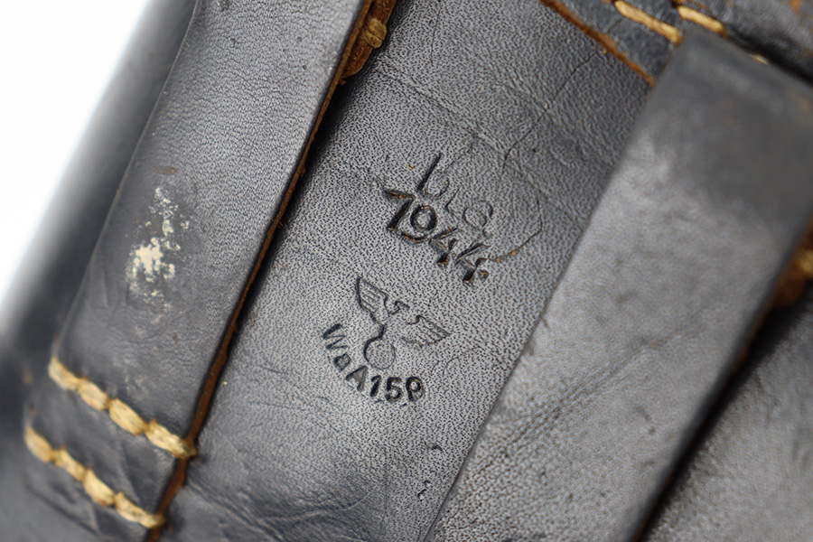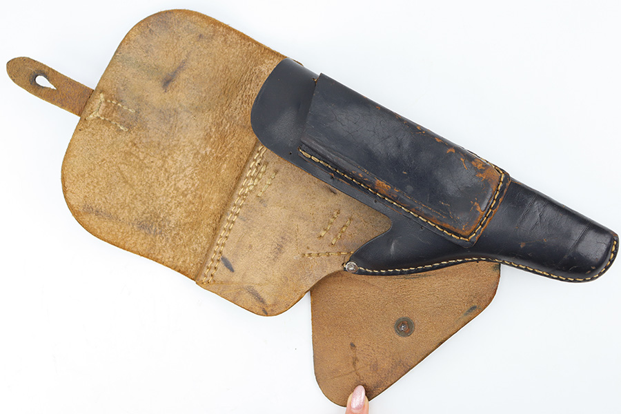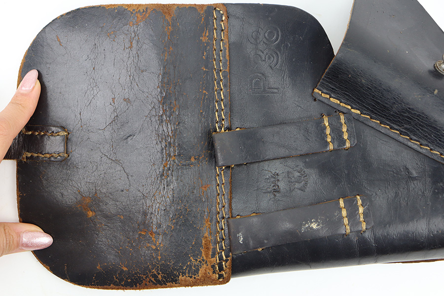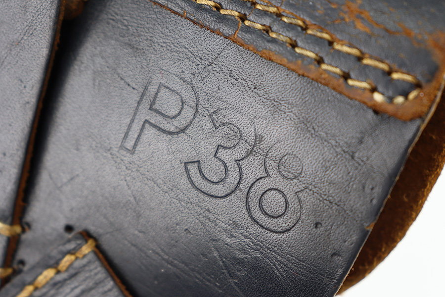 12/29/23 – This is an original 1944 soft shell style P.38 holster from WW2. The holster is in good condition with some honest wear and scuffing around the edges of the exterior leather and magazine pouch. There’s also wrinkling and mild cracking on the top lid portion of leather. The leather is completely intact however, and the stitching is all original and in great shape. Well marked on the back leather with a maker code, date, waffen proof, and model designation stamps. Normal pliability and typical signs of use.