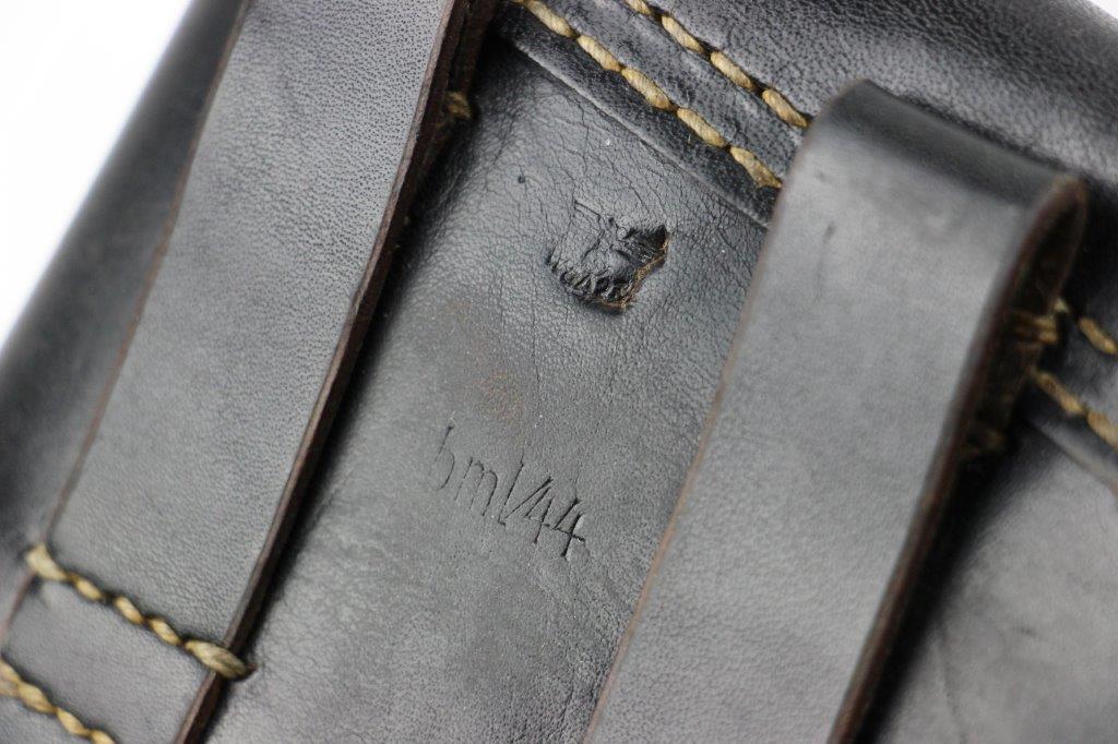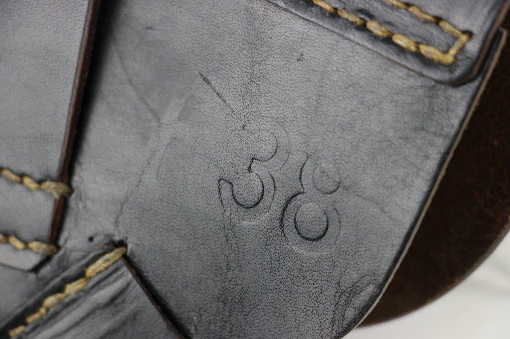 5/14/24 – This is an original 1944 dated soft-shell style P.38 holster from late WW2. The holster is in excellent overall condition with clean black leather and all original stitching. The back leather is maker, date, and military proof stamped. There’s also a P.38 designation stamp, as shown. The leather has normal pliability and light use wear but no major issues. A few light surface scratches on the magazine pouch.