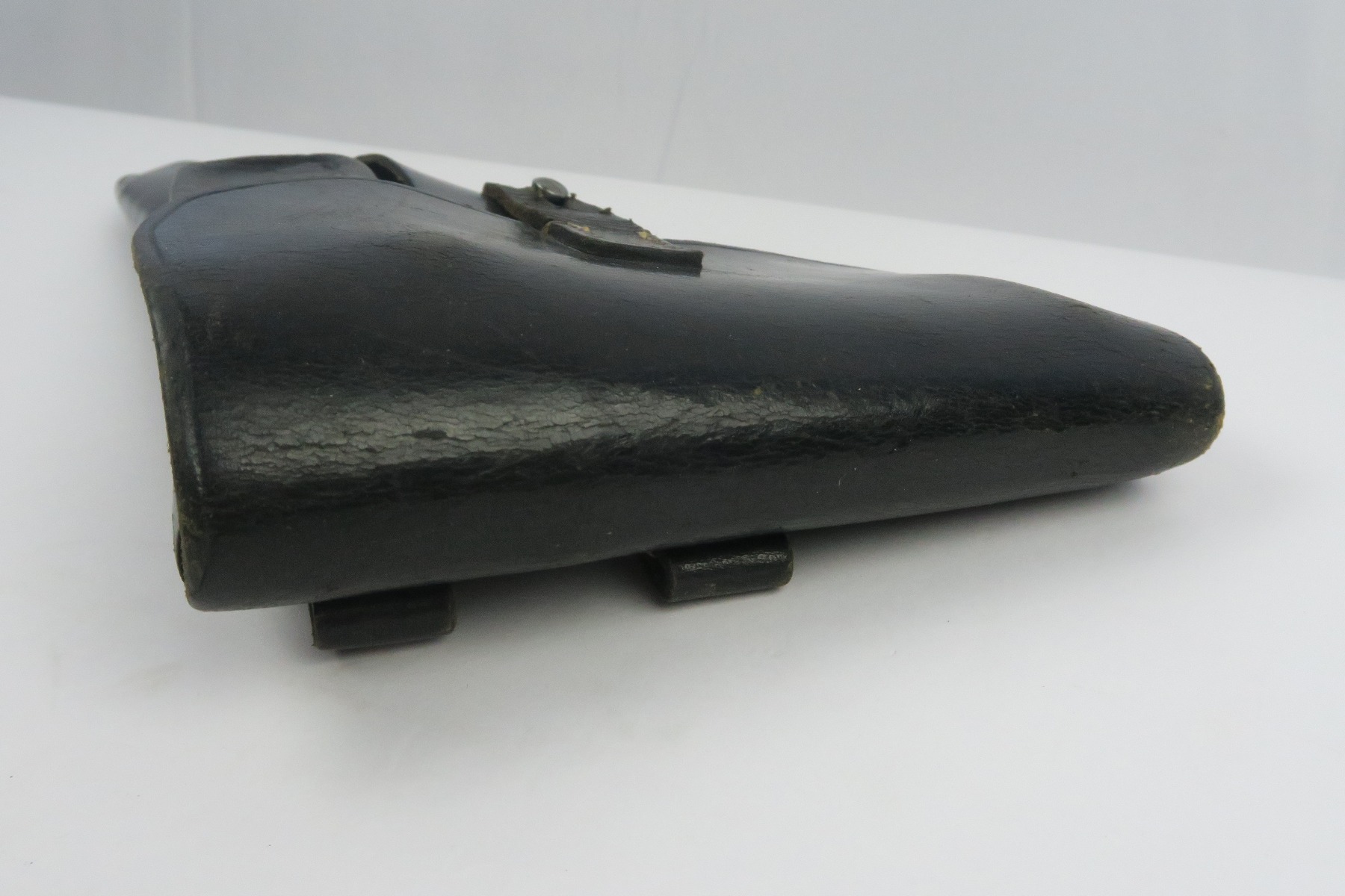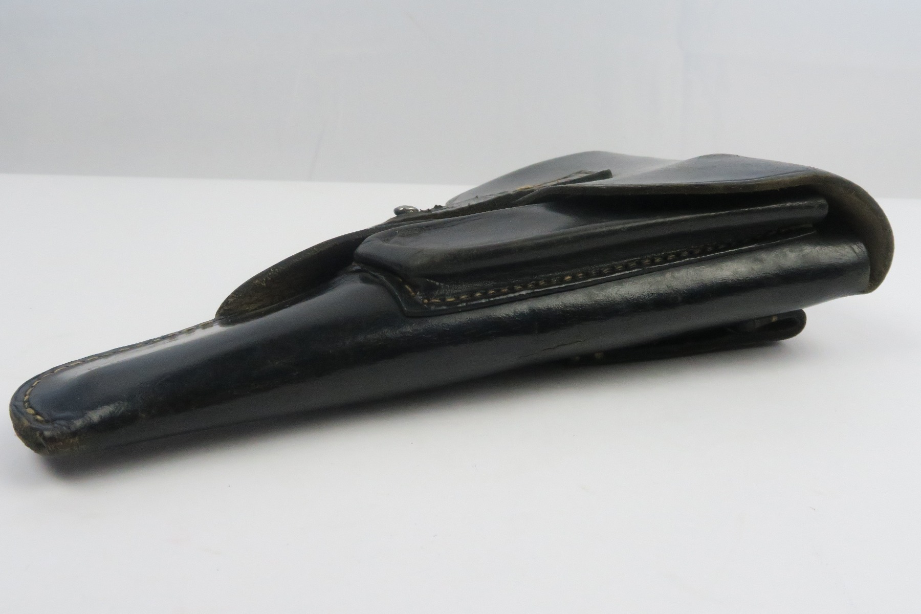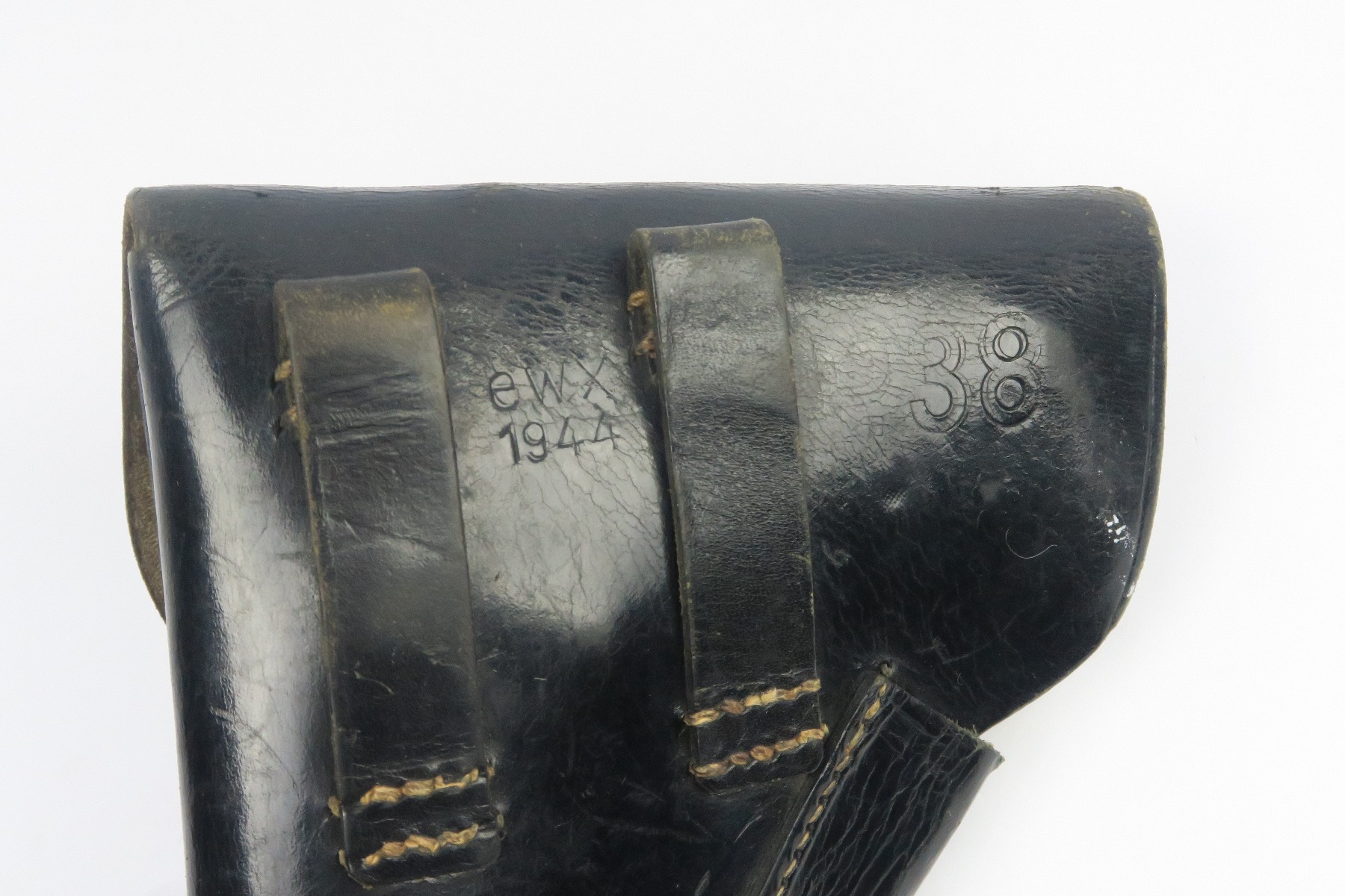 12/26/17 – This is an original WW2 production 1944 softshell P.38 holster. The holster is a scarce, more desirable “one-piece” style, meaning there’s no seam on the top of the holster. The back of the holster is “ewx” maker stamped and 1944 dated. The black surface leather has light wrinkling and normal wear but no major issues. There are no notable stitching issues either. This holster came from James Julia auction of Warren Buxton’s collection.