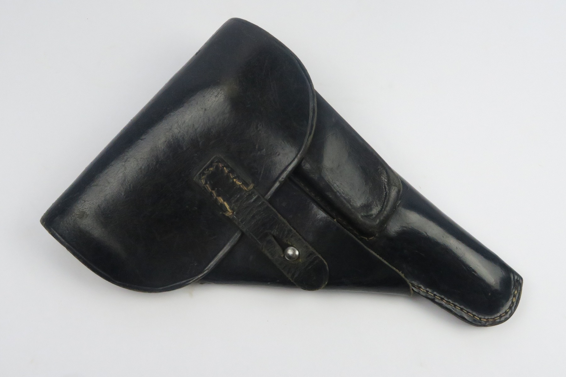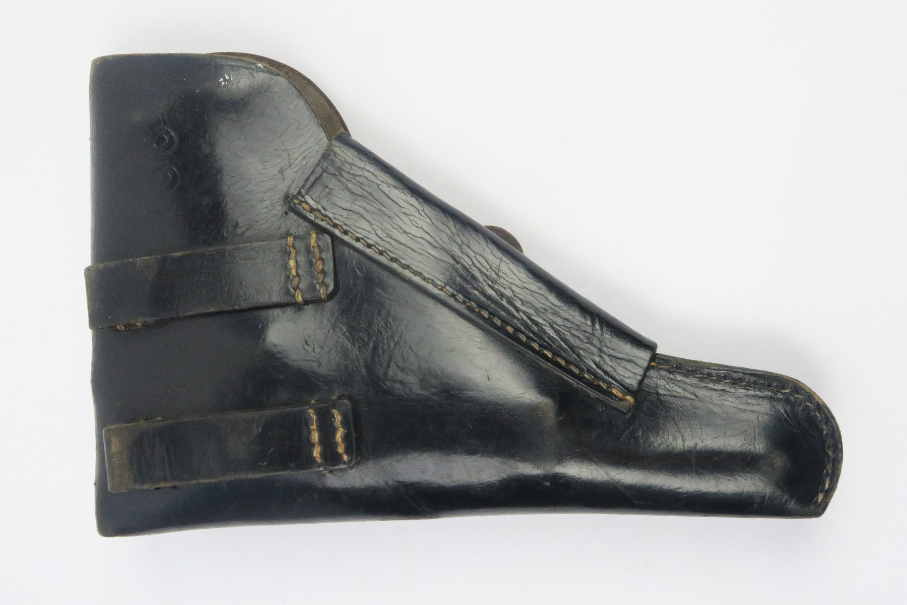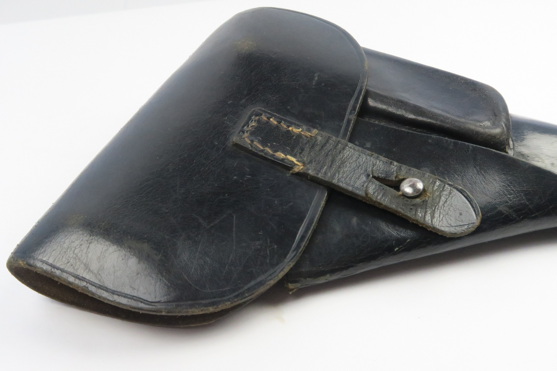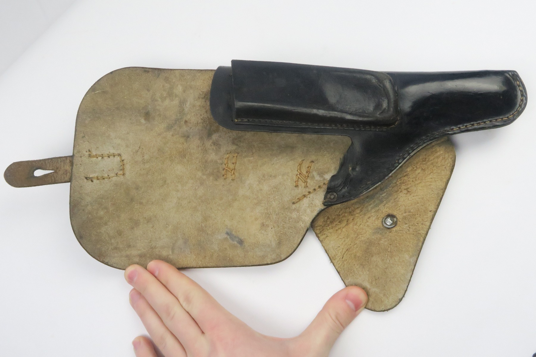 12/26/17 – This is an original WW2 production 1944 softshell P.38 holster. The holster is a scarce, more desirable “one-piece” style, meaning there’s no seam on the top of the holster. The back of the holster is “ewx” maker stamped and 1944 dated. The black surface leather has light wrinkling and normal wear but no major issues. There are no notable stitching issues either. This holster came from James Julia auction of Warren Buxton’s collection.