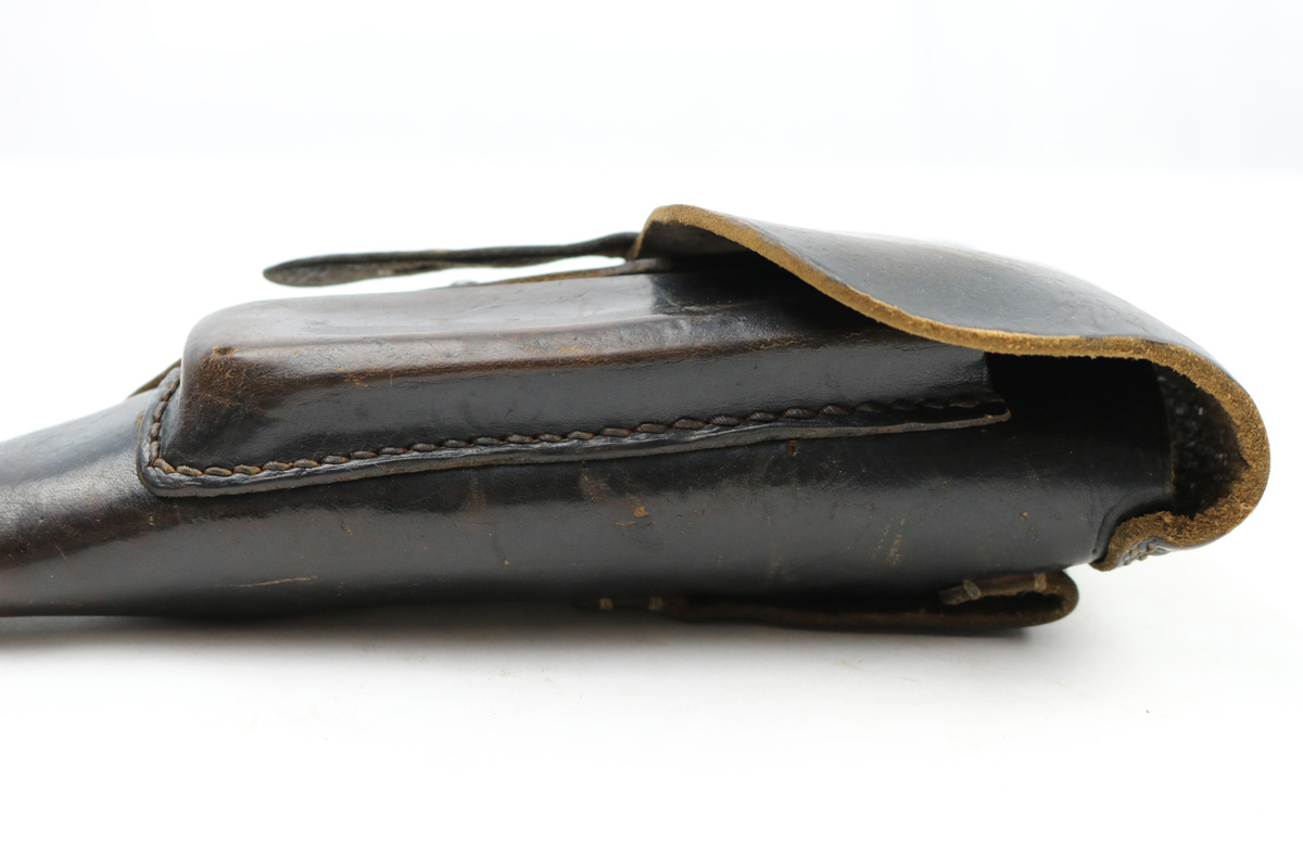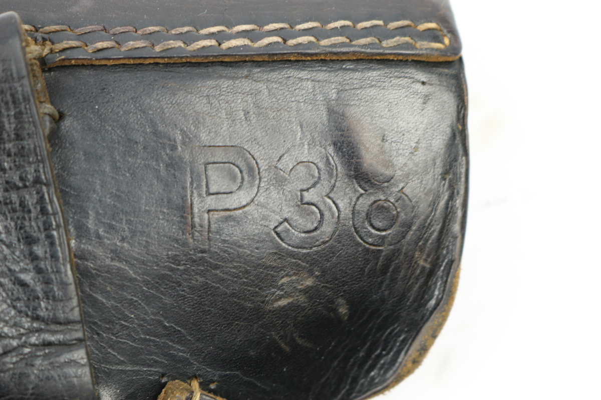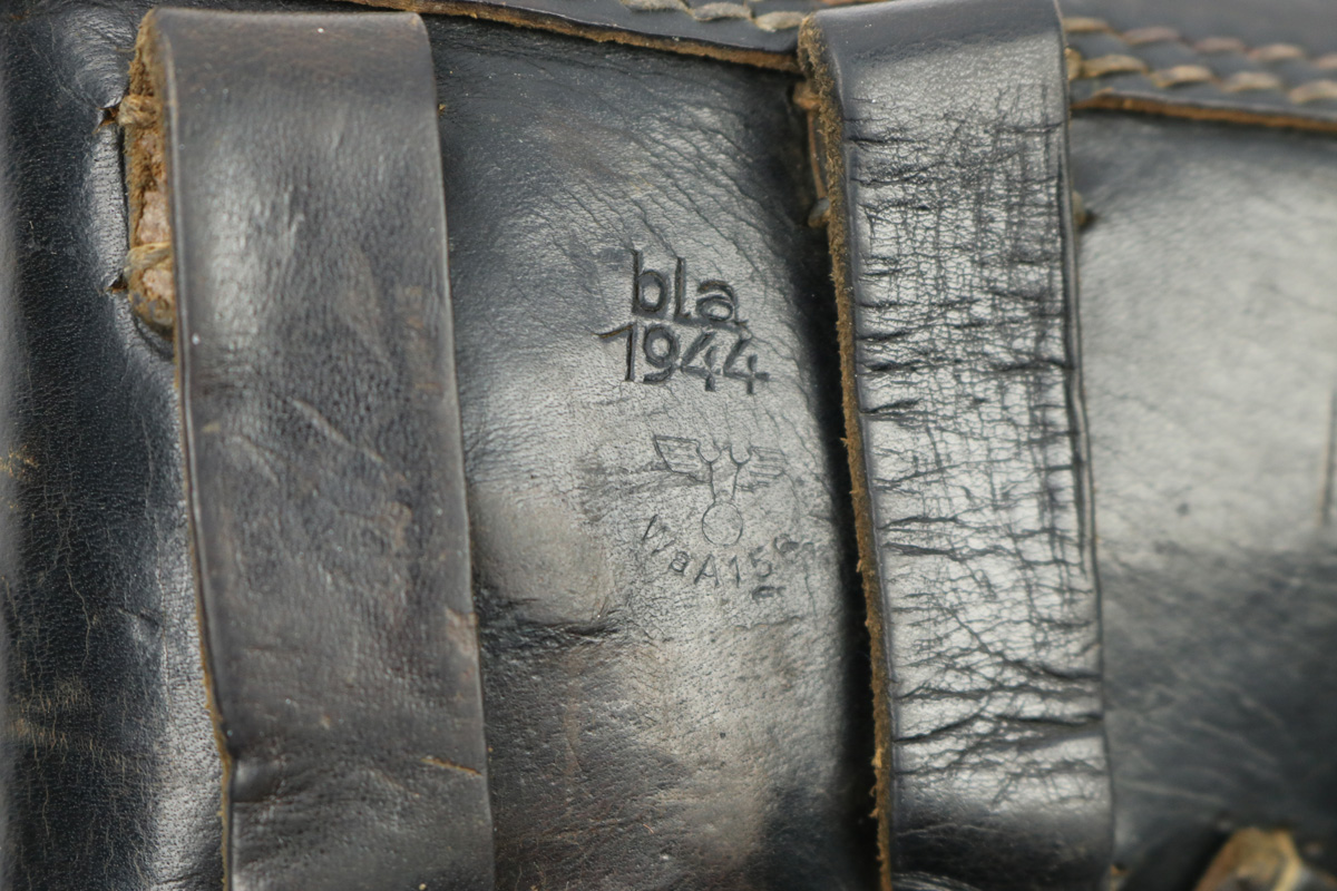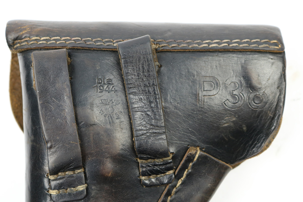 8/11/18 – This is a late ww2 production 1944 dated P.38 holster. The holster is softshell style with a 1944 date, bla maker code, P.38 stamp, and waffen proof ont he back leather. The leather is soft and pliable with normal wear and light fading of the black dye. The stitching is all original and in tact. Guaranteed original.