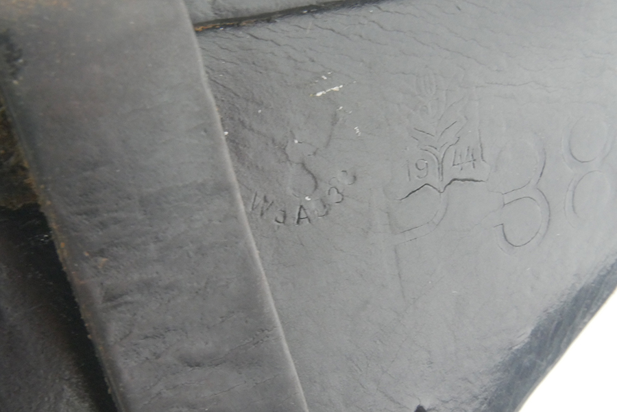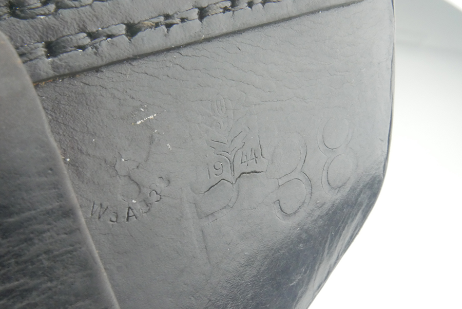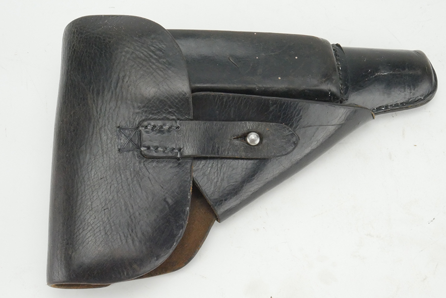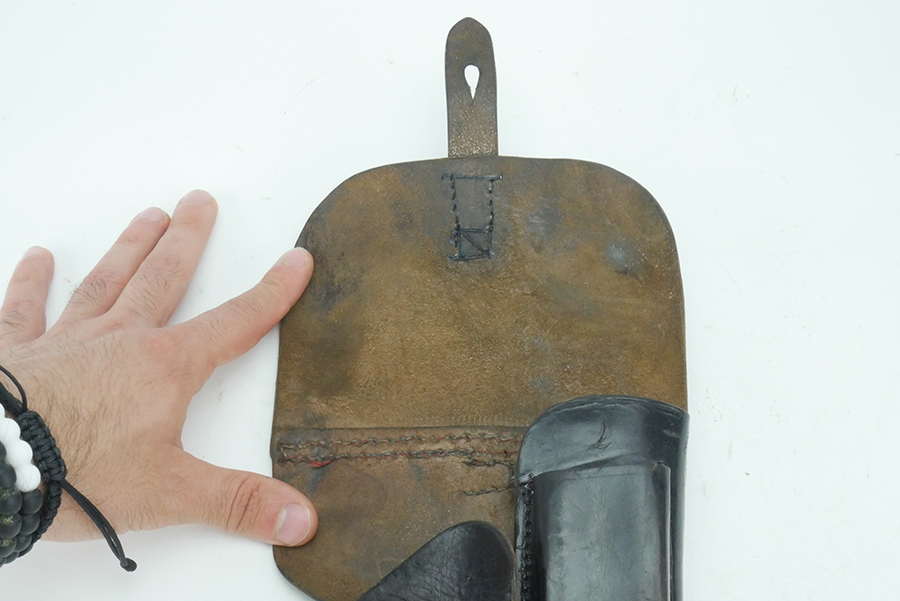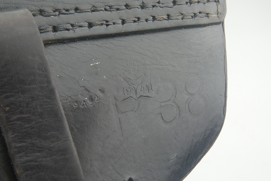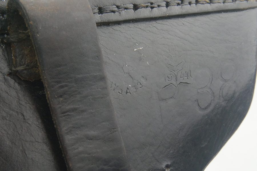 5/21/24 – This is a fairly scarce 1944 p.38 holster from WW2. The holster is made with a “bearskin oakleaf 9” maker stamp, which from our research is most likely by the maker Lederfabrik Christof Neuner in Austria. These are somewhat scarce, especially with the 1944 date. The holster is also P.38 stamped and 1944 dated. Nice, soft leather. The top flap and bottom of one of the belt loops is re-stitched. One belt loop is missing.