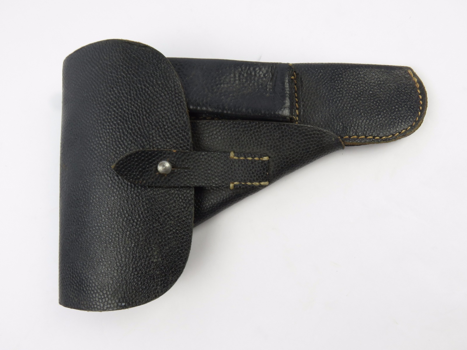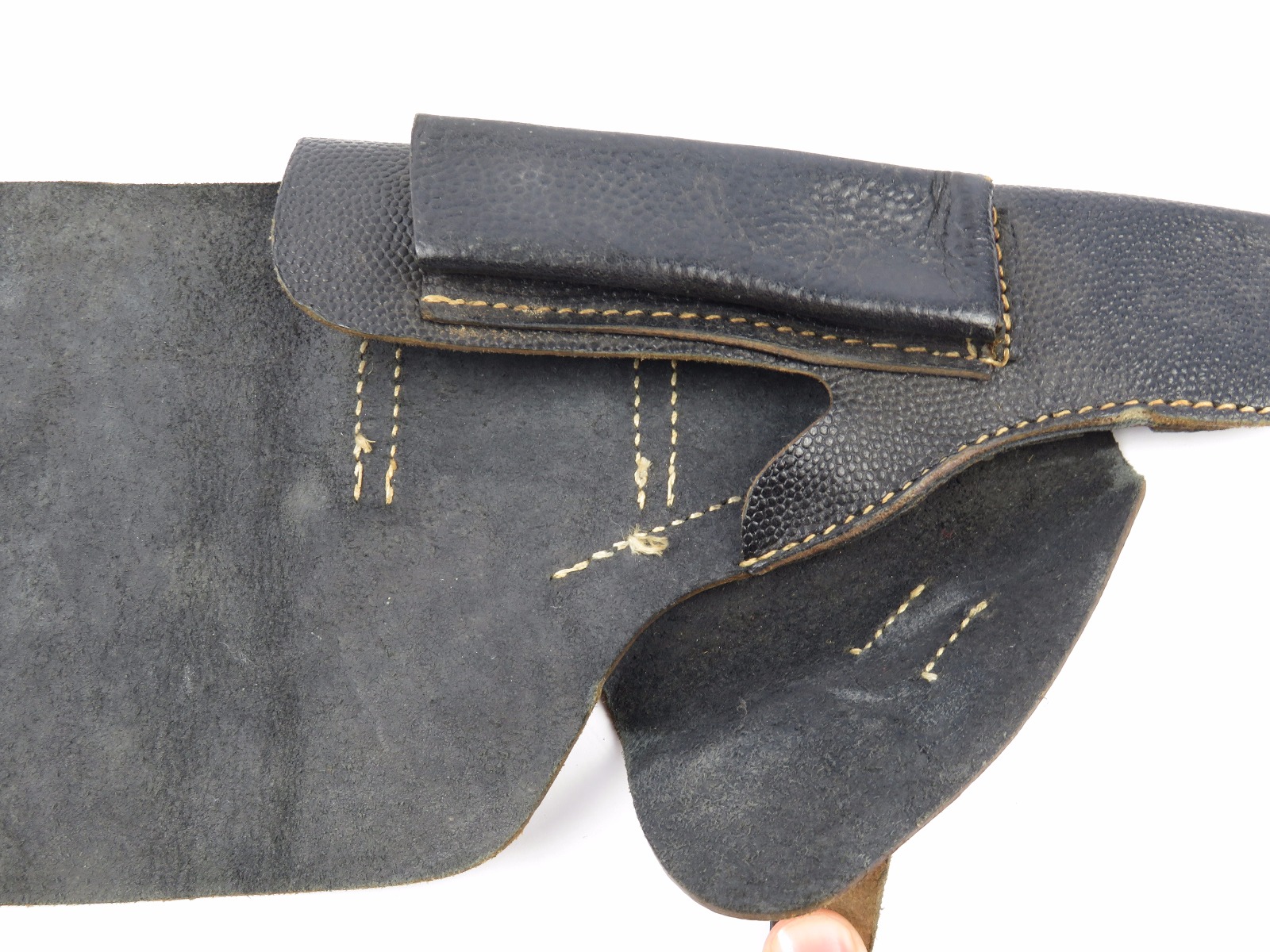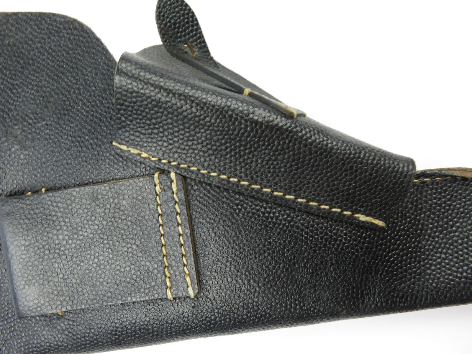 7/19/17 – This is an original, rare variation late WW2 P.38 holster. The holster has all black leather with a pebble grain patterned exterior. The back leather of the holster is stamped “jkh 4” the “4” stands for 1944. The holster has excellent, clean leather and stitching. This holster is from Warren Buxton’s collection. Guaranteed original and authentic!