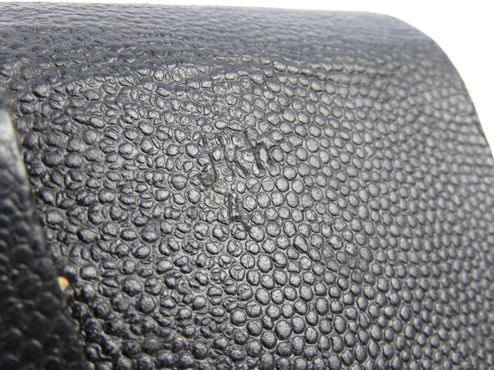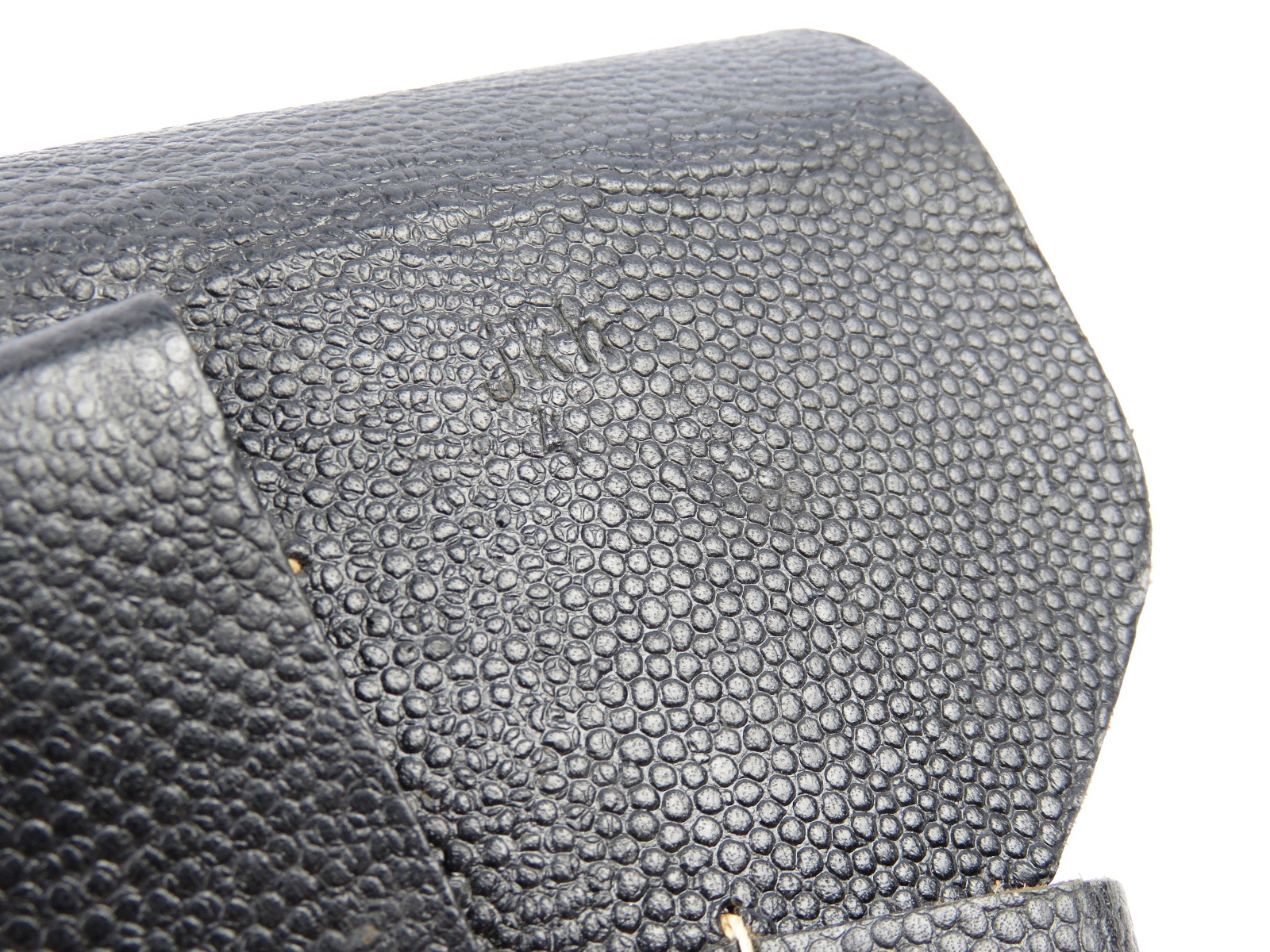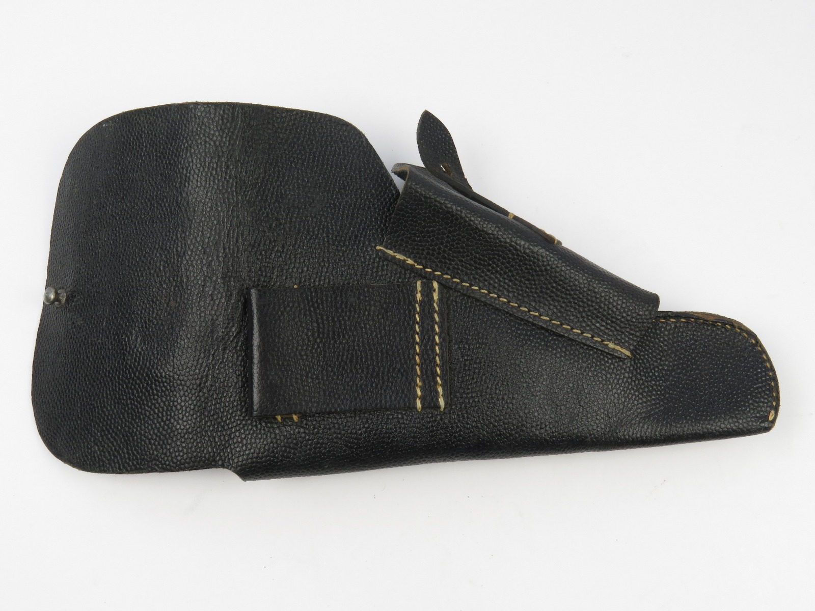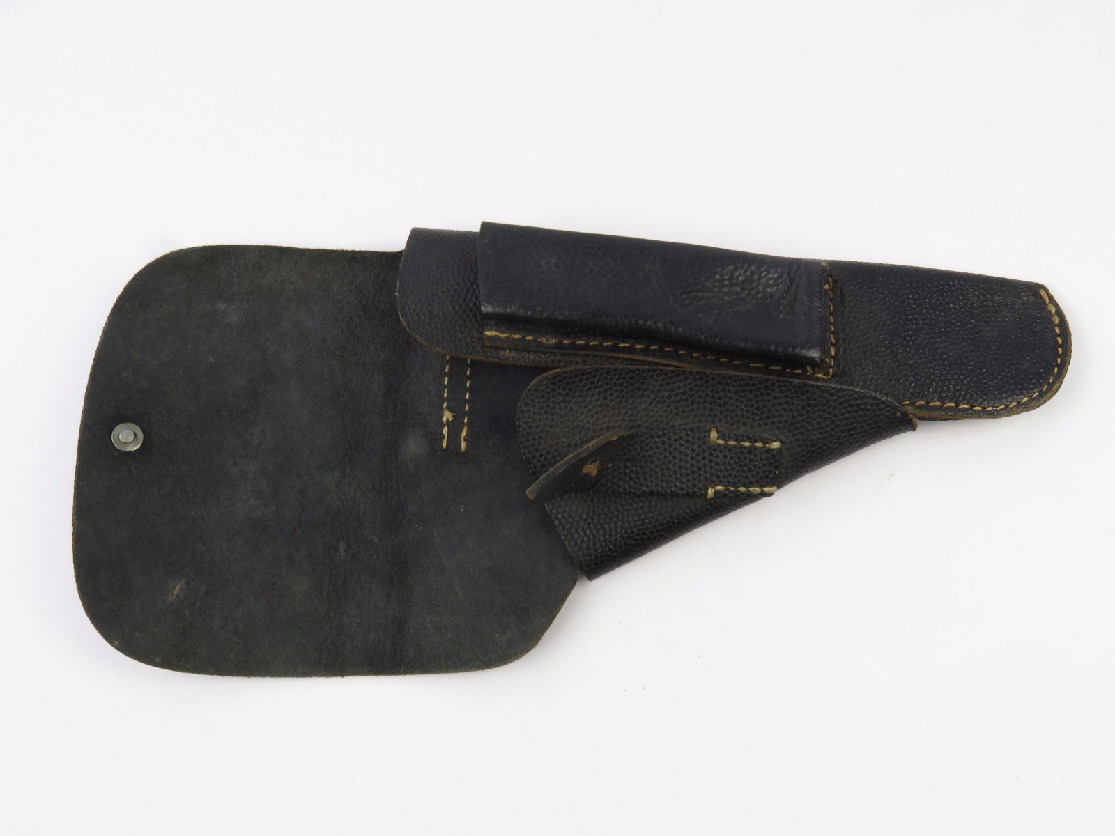 7/19/17 – This is an original, rare variation late WW2 P.38 holster. The holster has all black leather with a pebble grain patterned exterior. The back leather of the holster is stamped “jkh 4” the “4” stands for 1944. The holster has excellent, clean leather and stitching. This holster is from Warren Buxton’s collection. Guaranteed original and authentic!